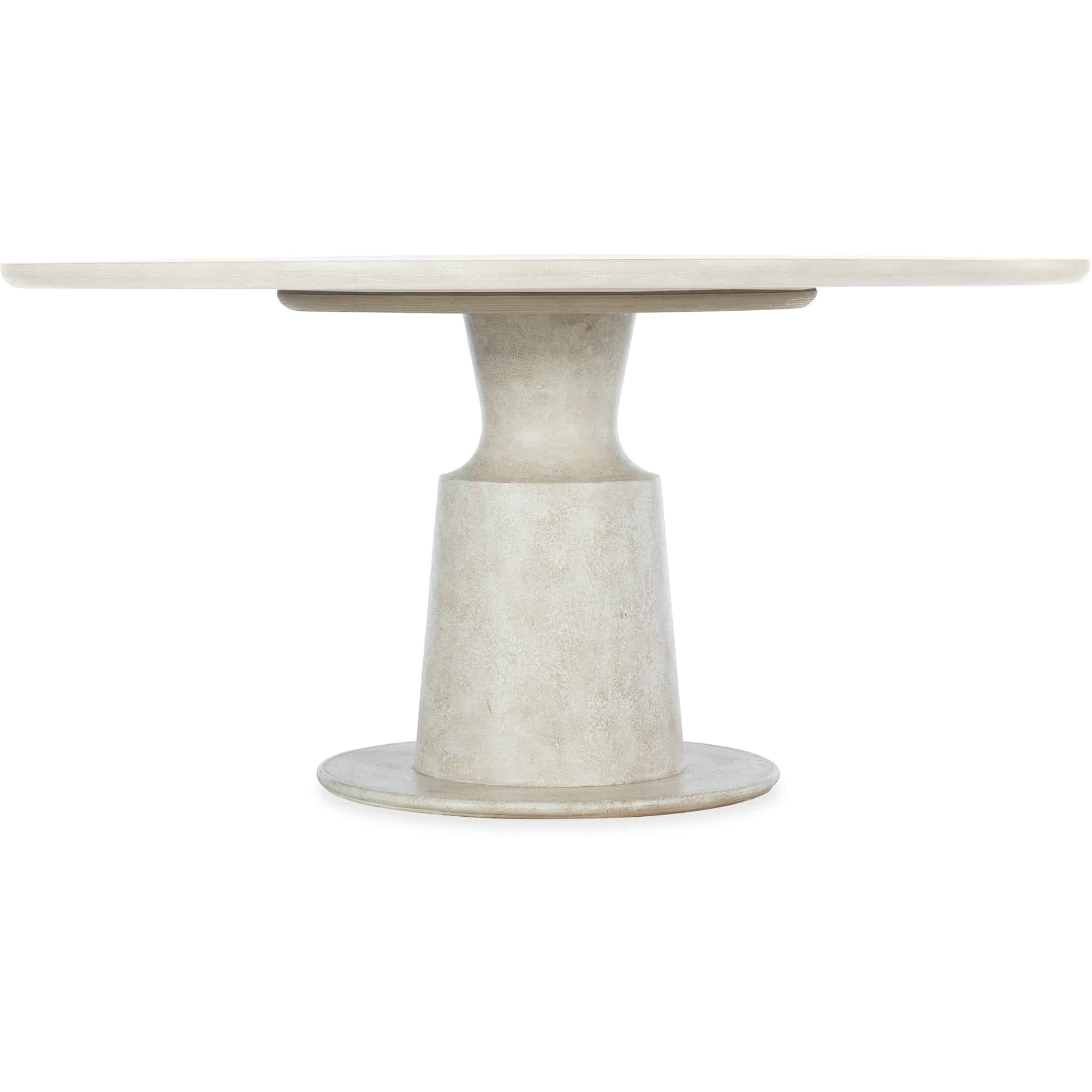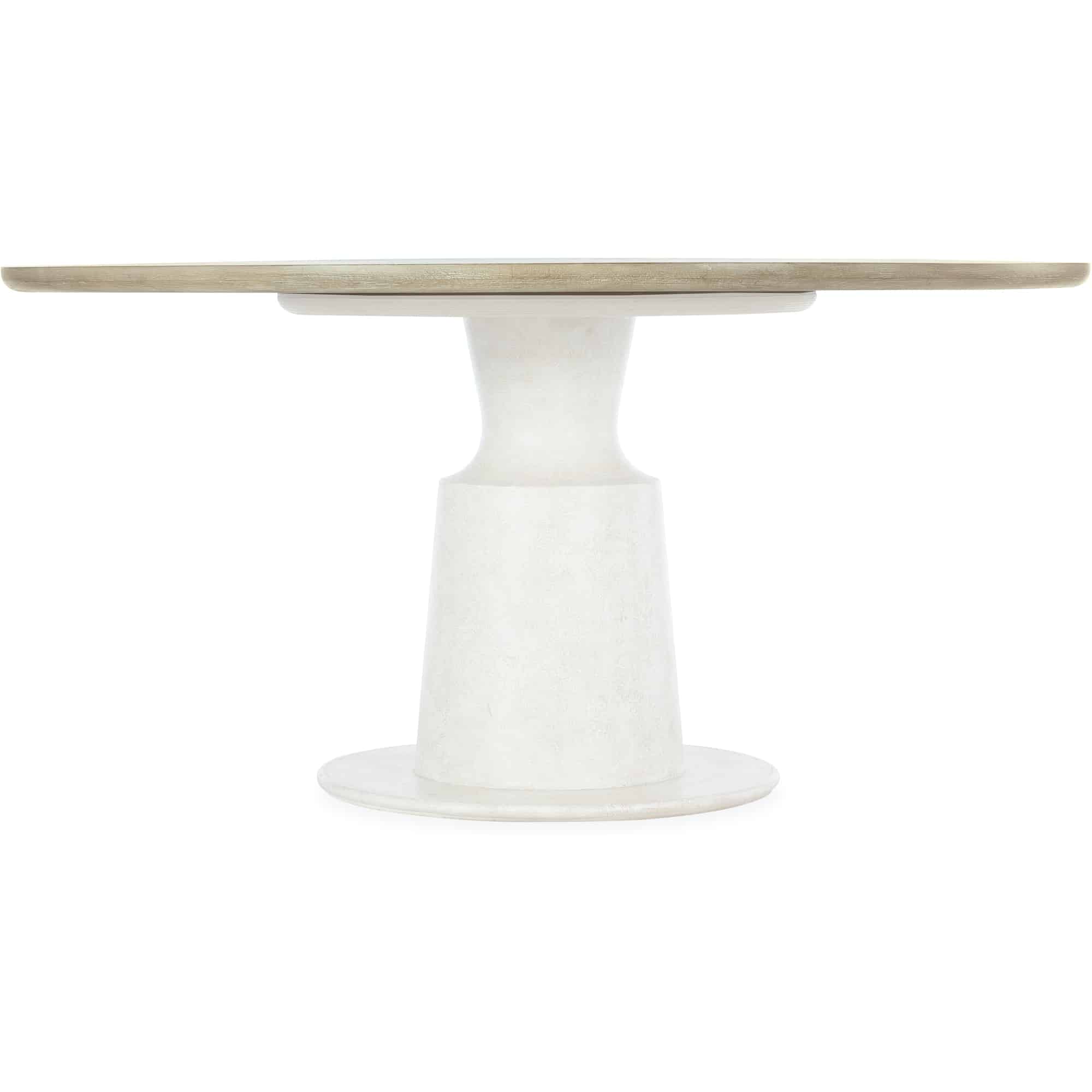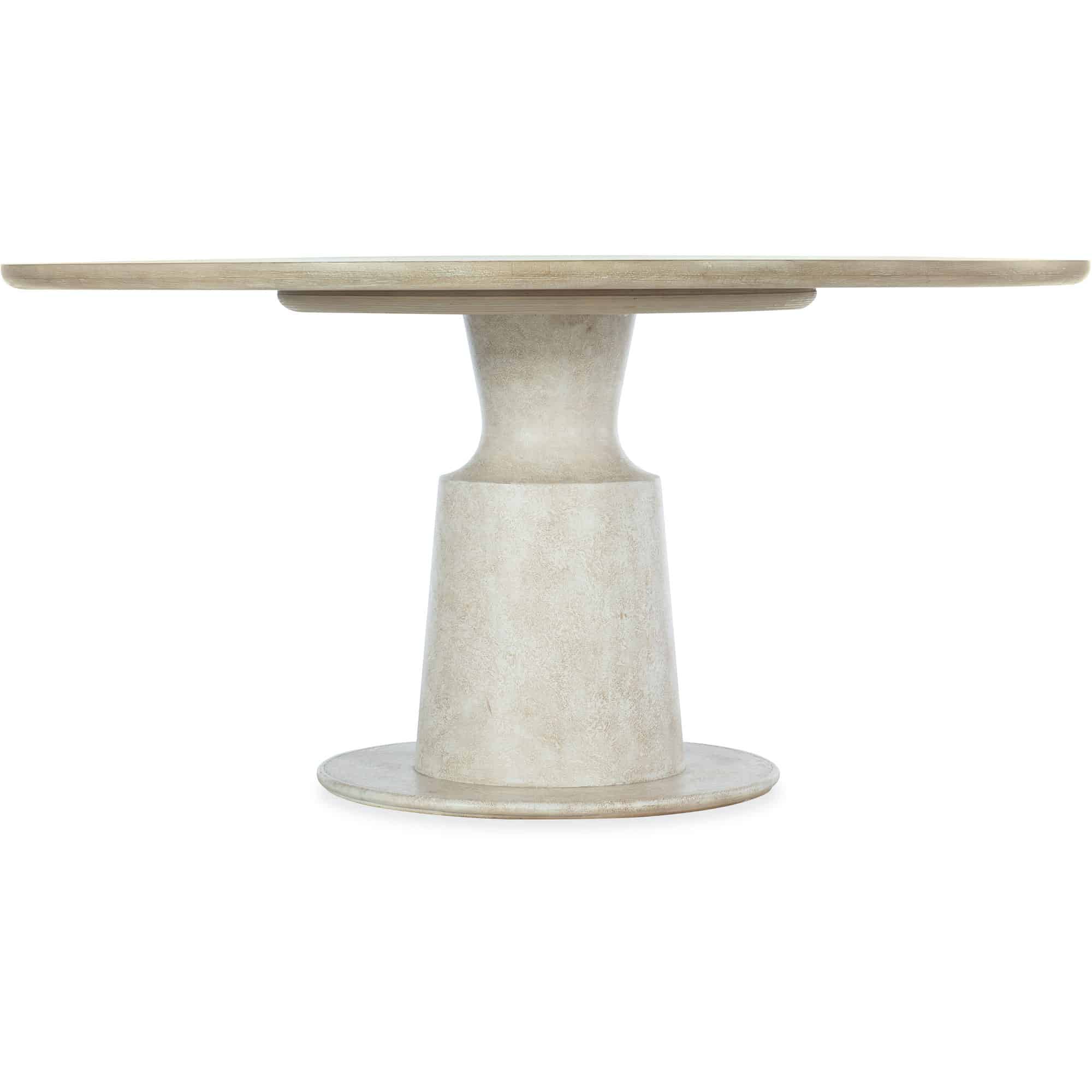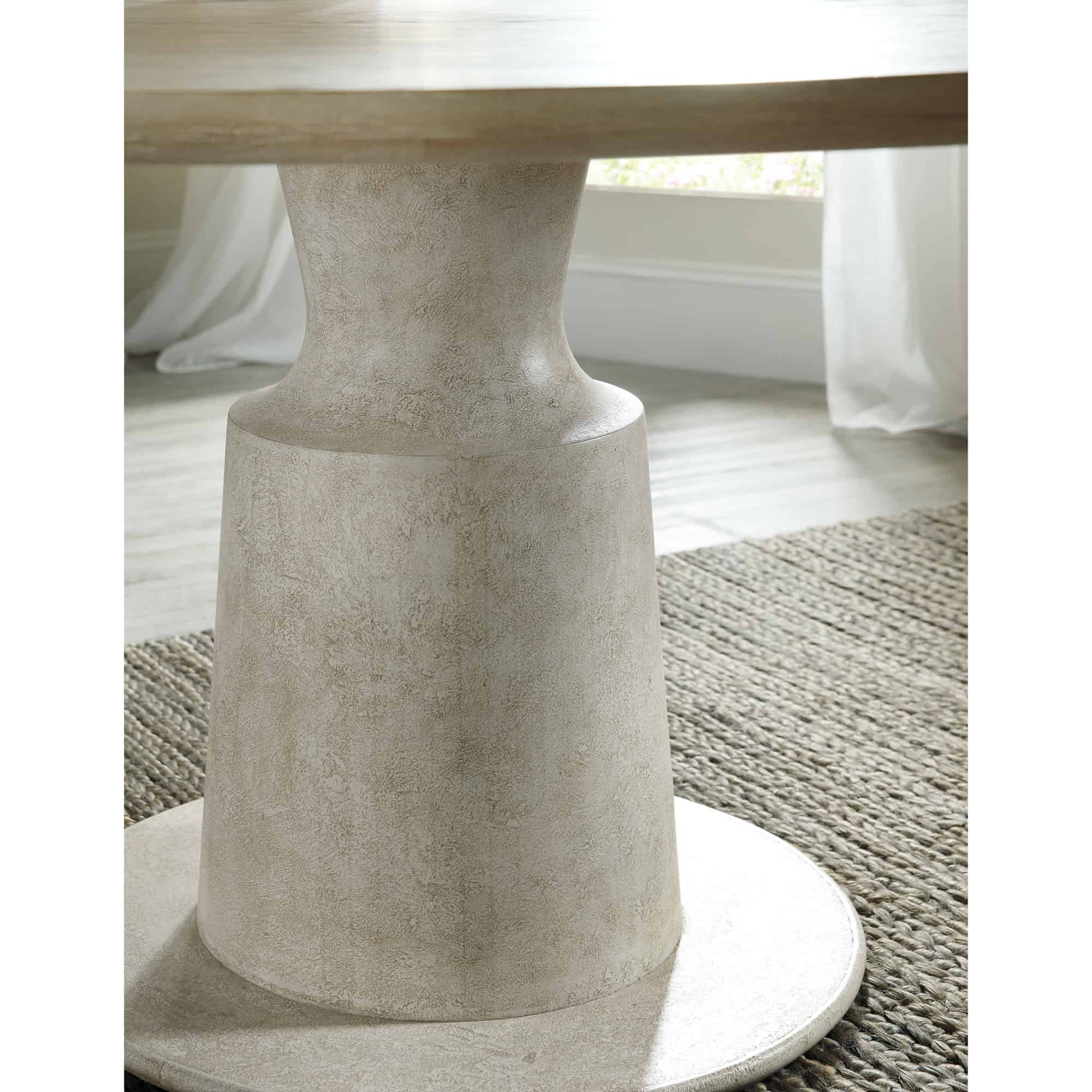 Finish: Table top: Terrain: a soft, taupe finish on oak veneers. Distressing includes dry brushing and shading. Table base: Textured gesso finish with crackle.