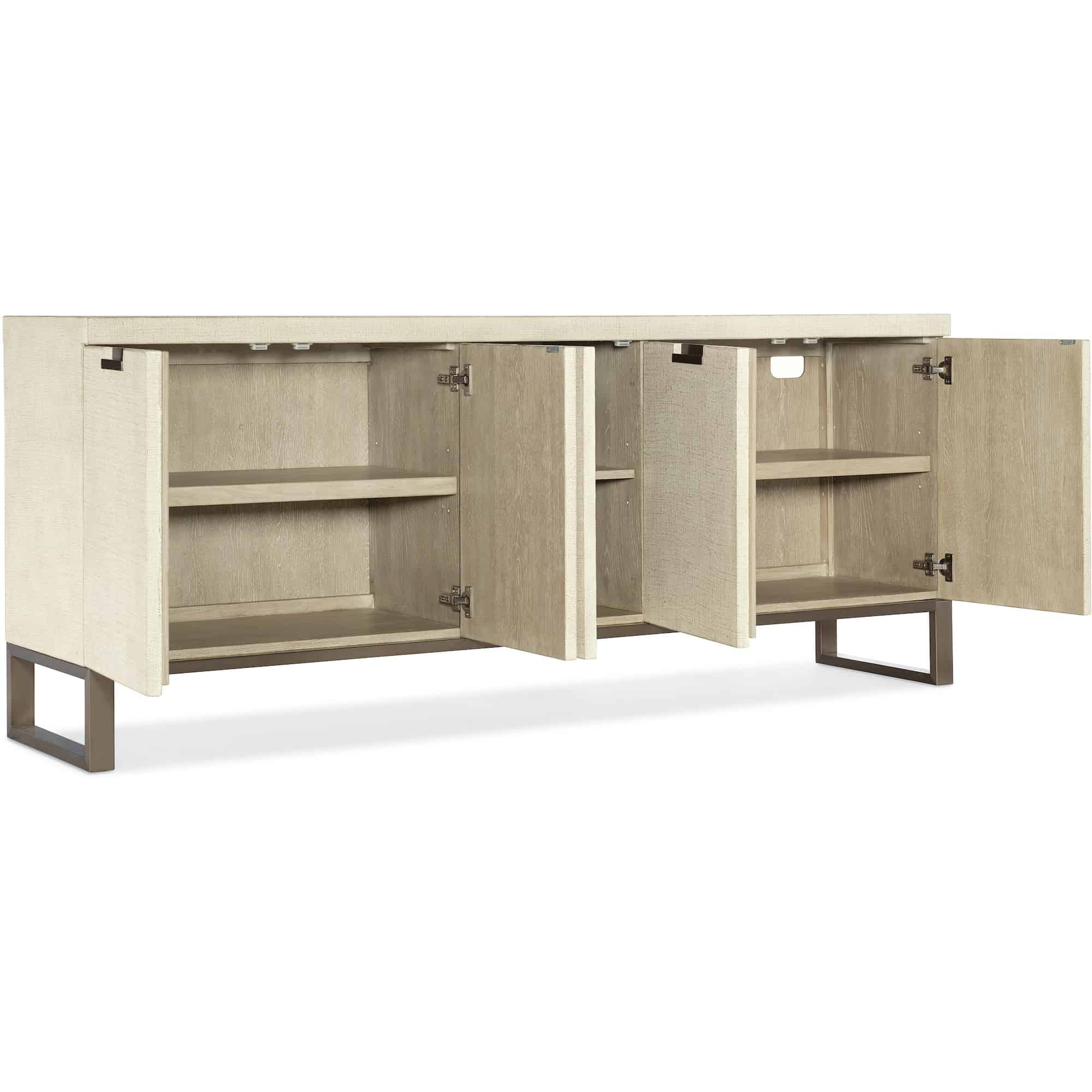 One adjustable shelf behind left and right pair of doors and one adjustable shelf behind center door