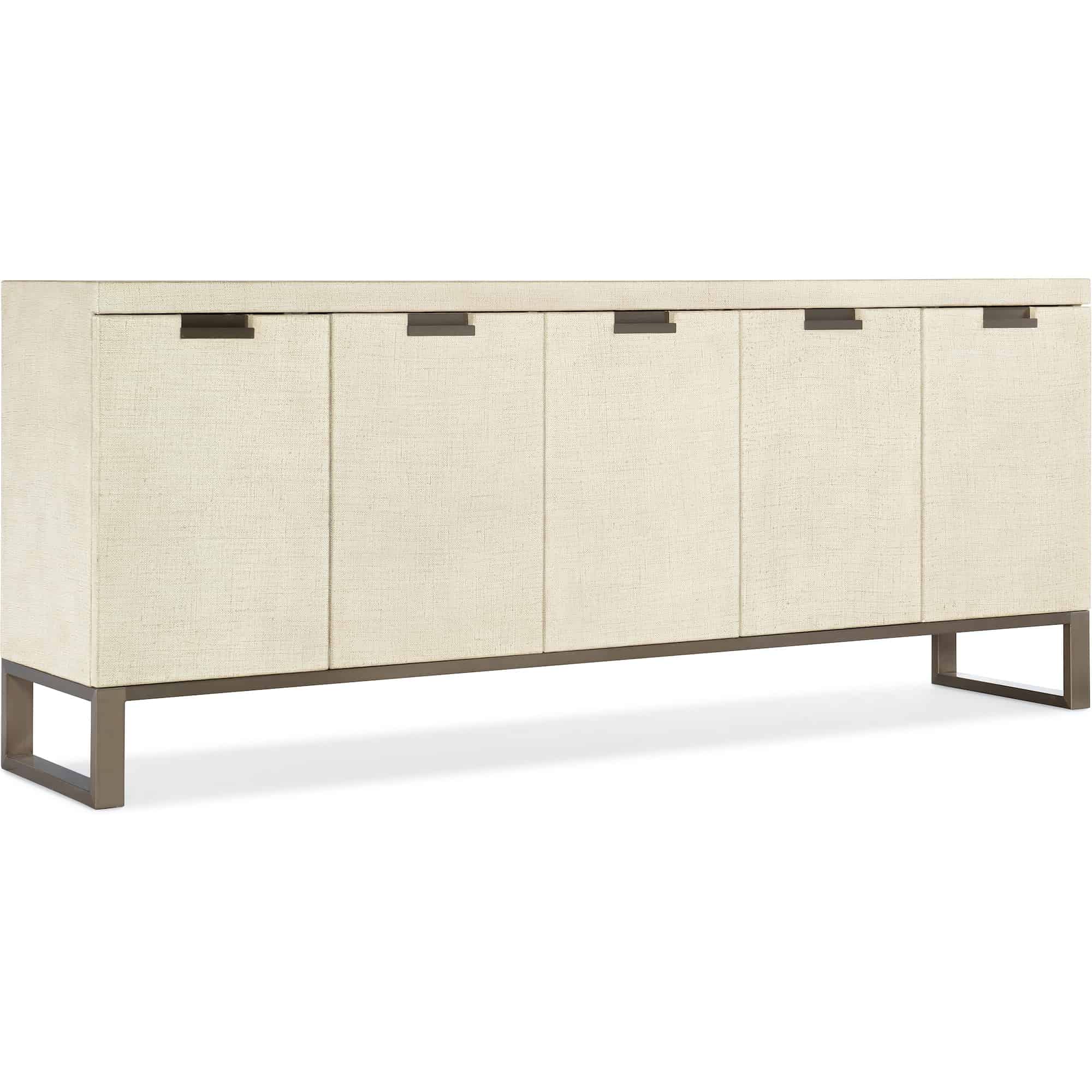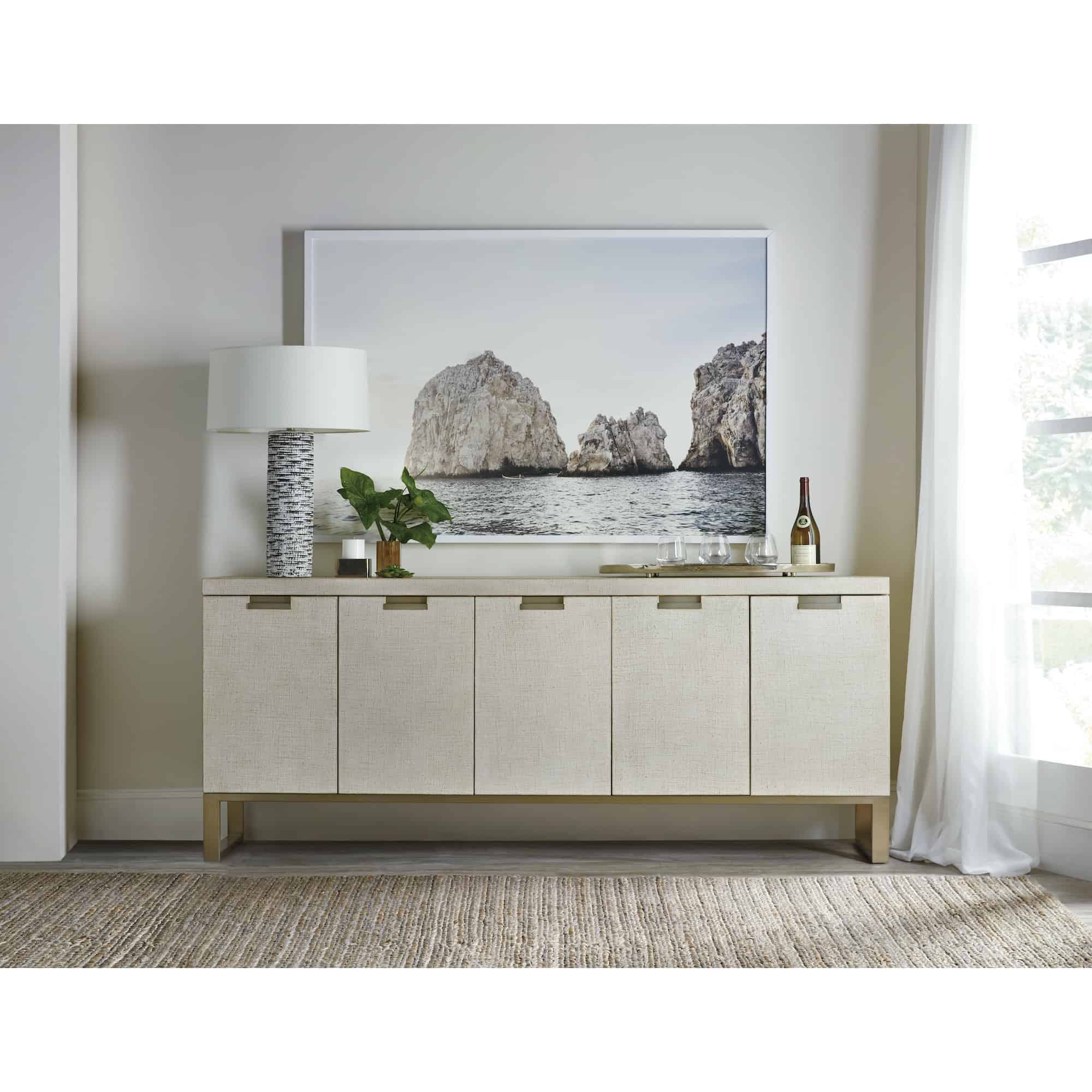 Finish: Pebble Beach: lacquered burlap finish. Champagne colored recessed pulls and metal base.
