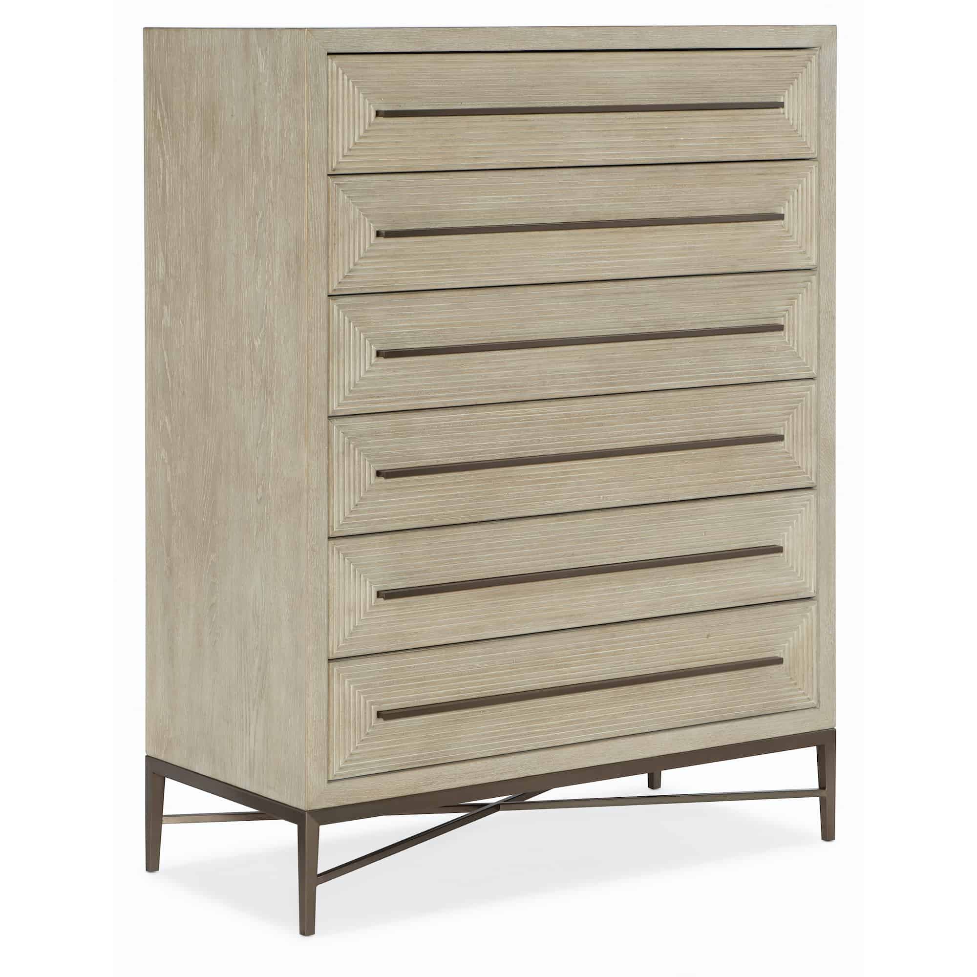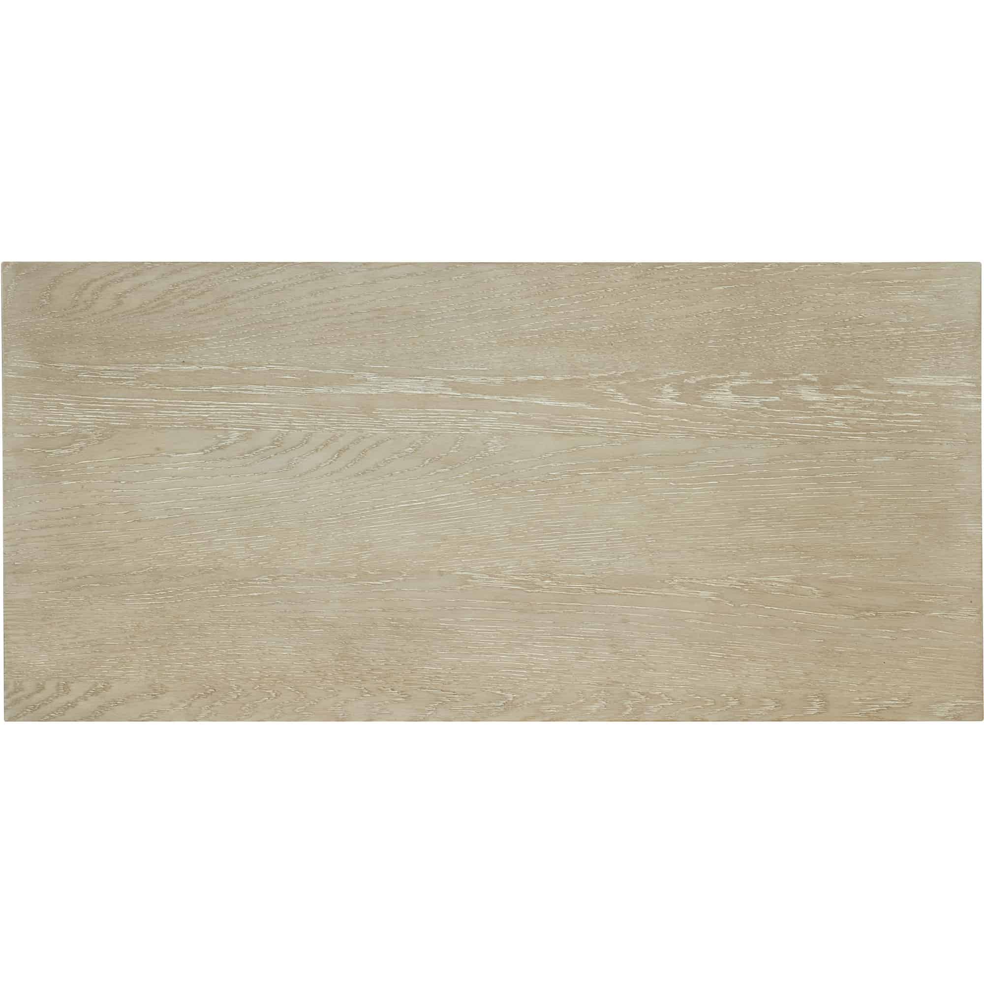 - Finish: Terrain: a soft, taupe finish on oak veneers. Distressing includes dry brushing. Champagne colored bar pull hardware and metal base.