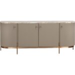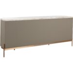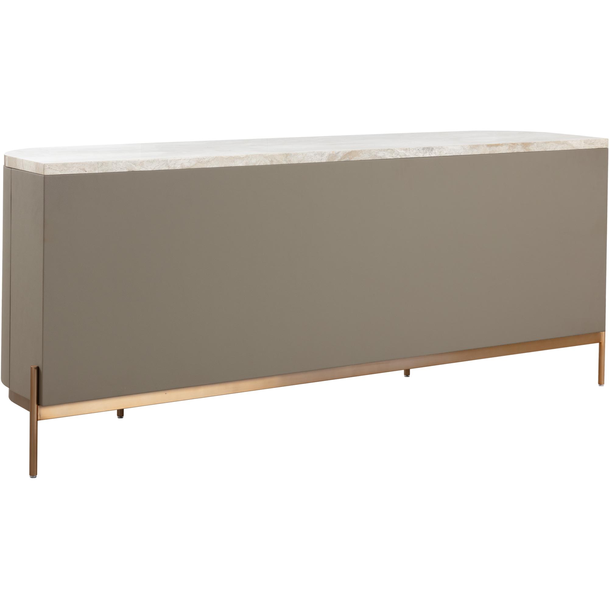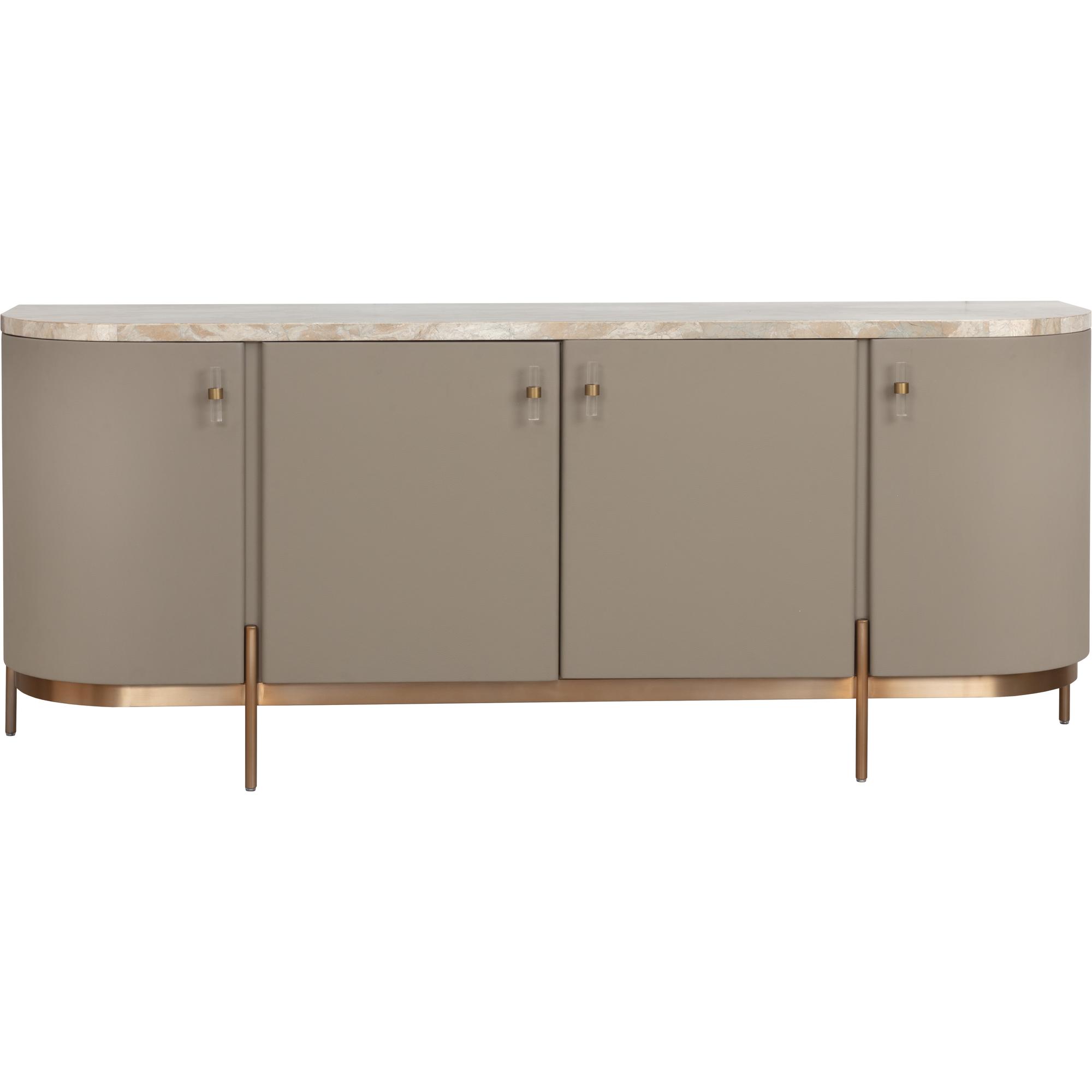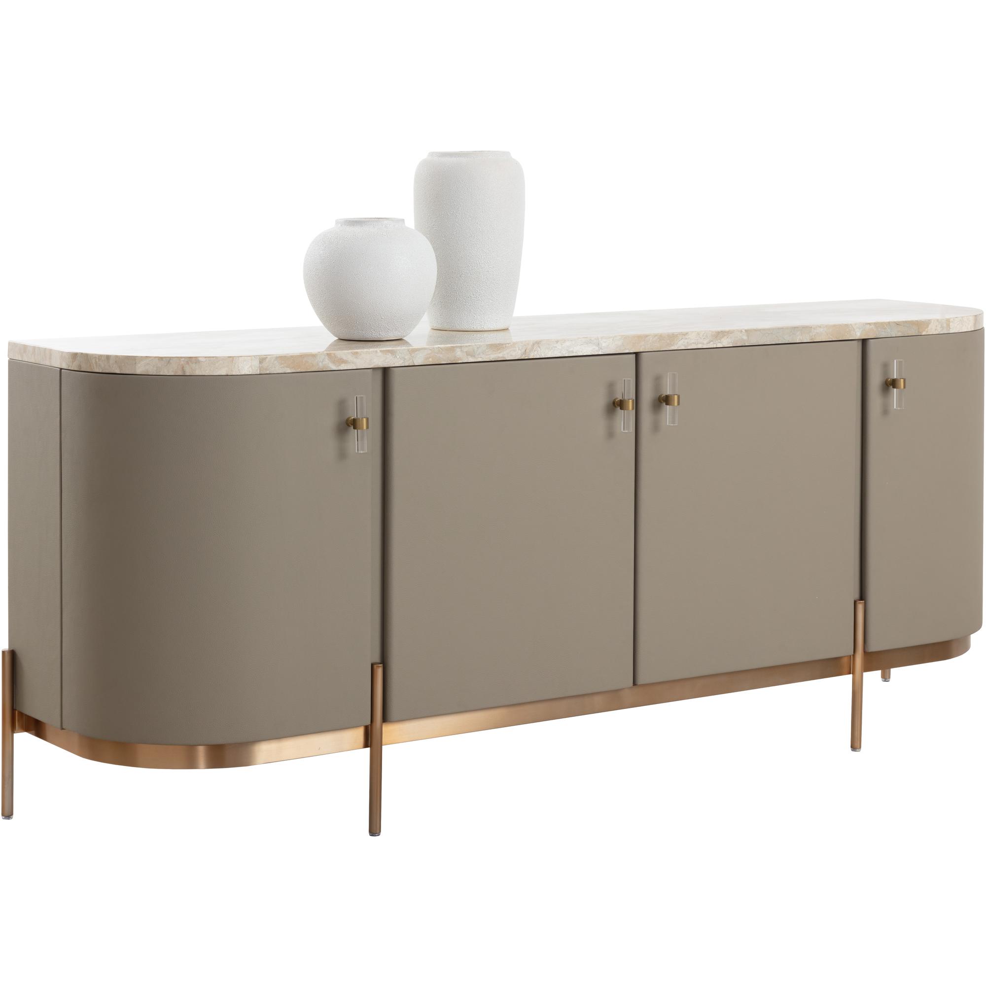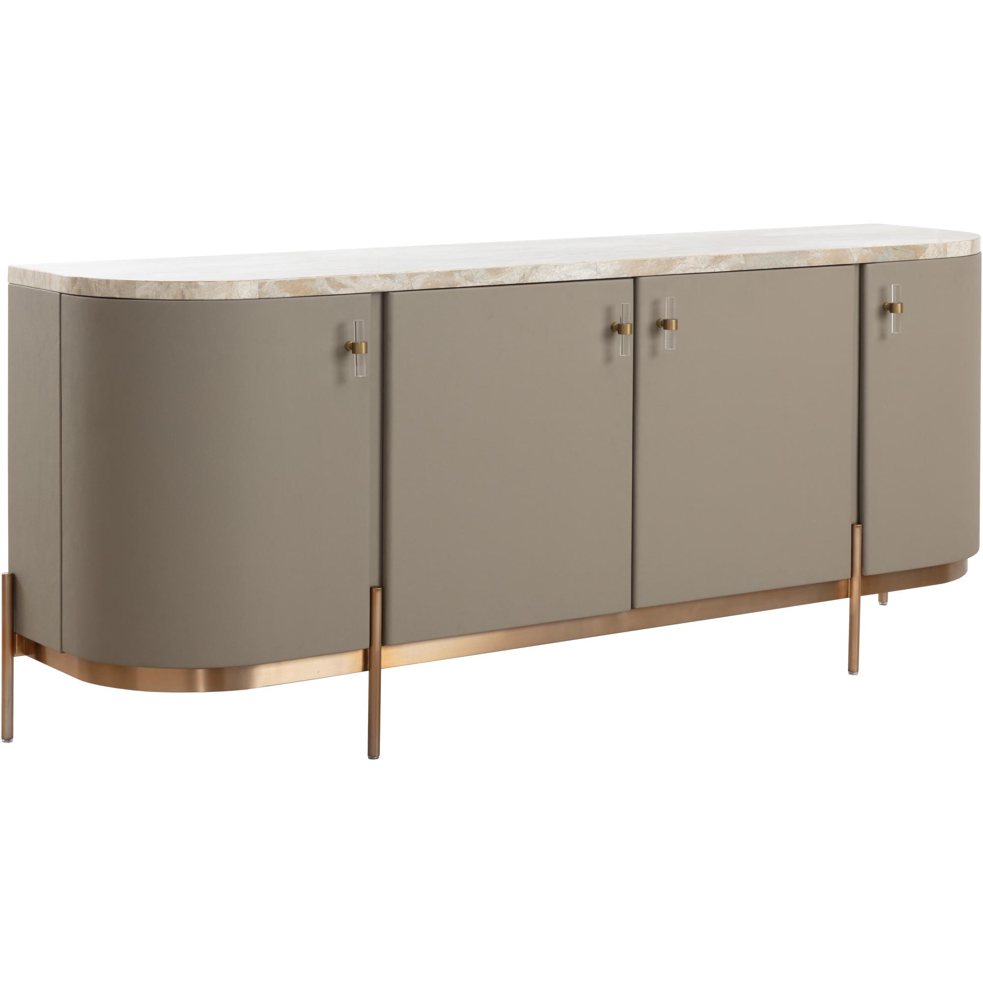 The Cataldi Sideboard defines modern elegance. Luxuriously crafted with a cappuccino marble top, taupe faux leather-wrapped doors and a brushed gold stainless steel base, this piece exudes refined style through its stunning mix of textures and finishes.