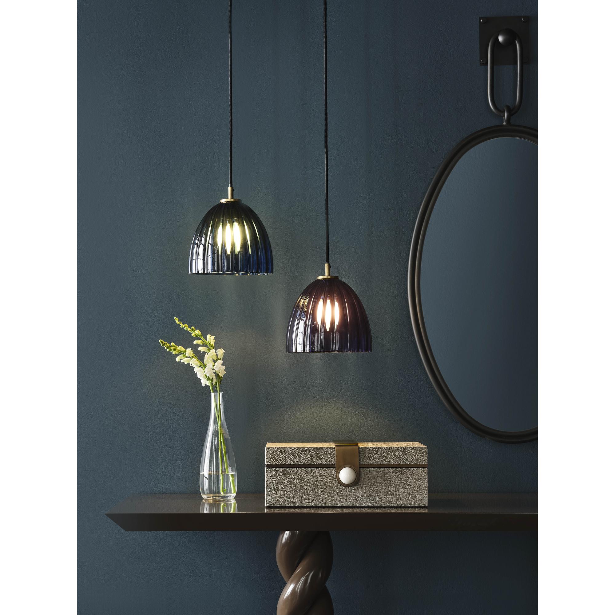 The Caterina Single Pendant in Aubergine adds a rich, dramatic accent to your space. Expertly crafted in Italy from mouth-blown glass, its fluted dome silhouette glows with deep purple tones that shift beautifully with the light.