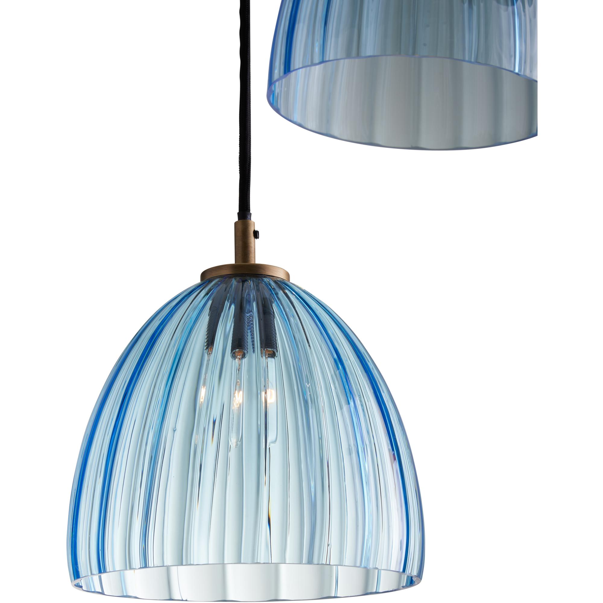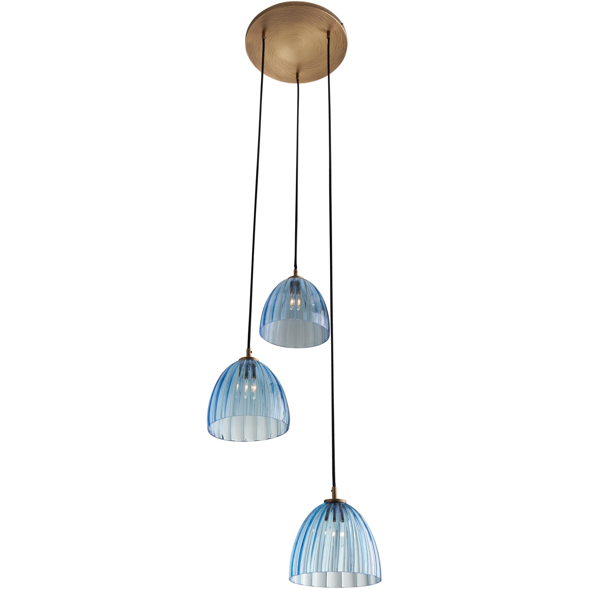 The Caterina Triple Pendant in Aqua offers a refined, sculptural presence with its trio of mouth-blown Italian glass shades. Featuring a softly fluted design in a vibrant aqua tone, each pendant hangs at staggered heights from a warm brass canopy, creating a dynamic and elegant display.