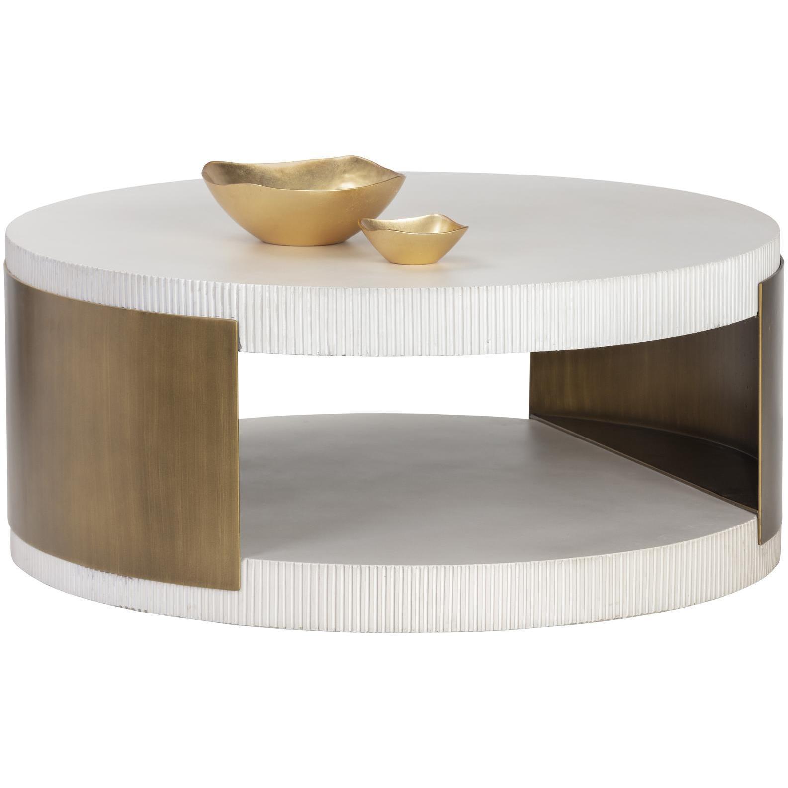 The Cavette coffee table combines old world influence with feminine flair. Features a ridged white concrete top and base with a brass steel frame.
