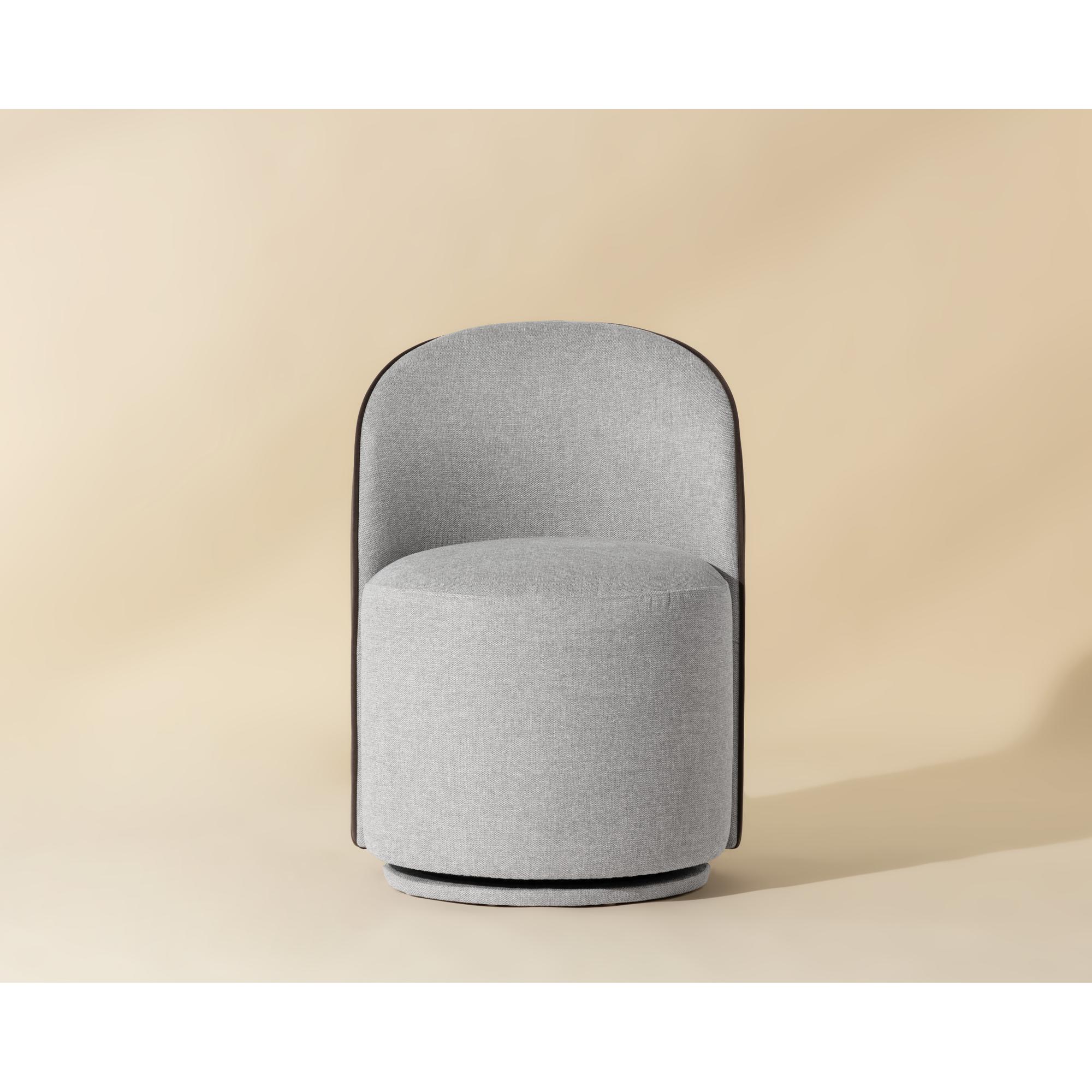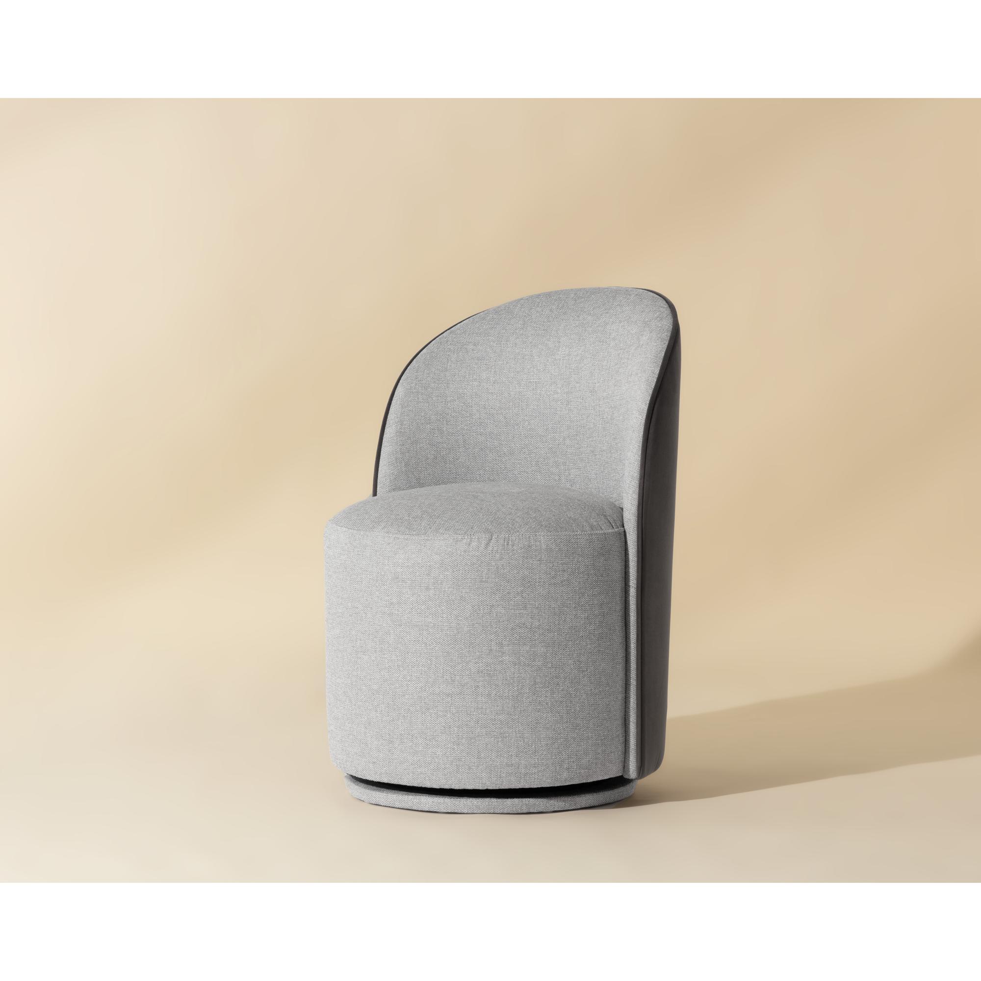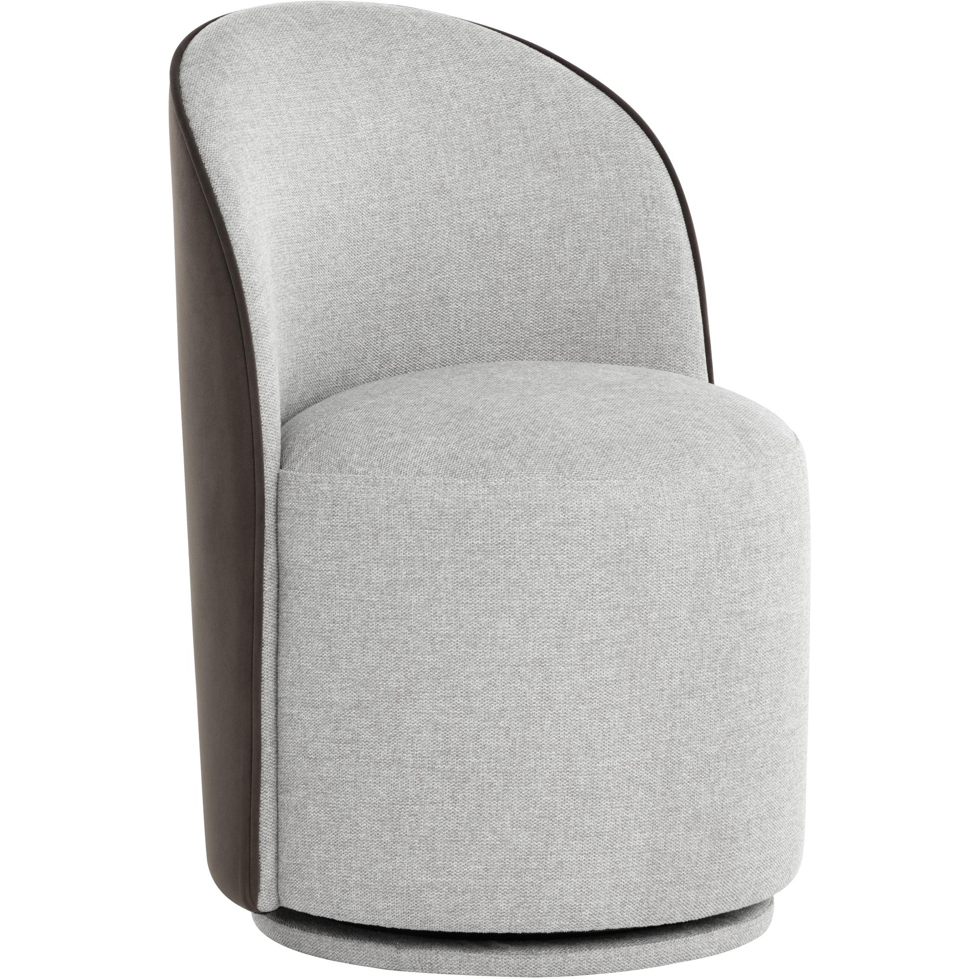 The Cavoli Swivel Dining Chair is distinguished by its curved silhouette. Fully upholstered in belfast heather grey and meg ash fabrics for a contrasting look.