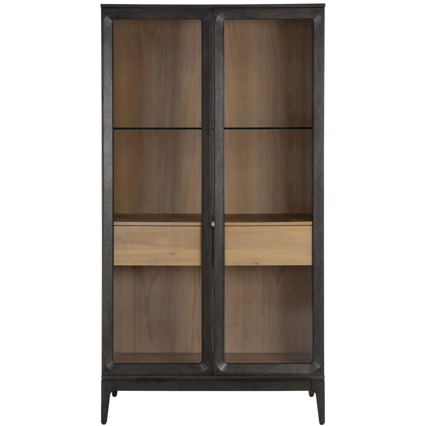 Boasting sharp lines brought to life with acacia veneer, the Cecilia Display Cabinet is a mid-century delight. Accented with brass handles and finished with solid rubberwood legs, this cabinet features generous shelving space and in-cabinet drawers to proudly showcase your beautiful treasures.