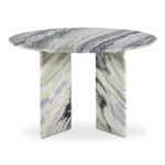 The Celia round dining table effortlessly combines contemporary flair with a timeless silhouette. The table’s allure is further enhanced by expressive green onyx panda marble, adding a touch of artistry and opulence. The smooth and organic textures on the marble beautifully contrast with the table’s geometric base, creating an intriguing visual harmony and exuding an undeniable sense of elegance and versatility.