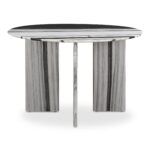 The Celia round dining table effortlessly combines contemporary flair with a timeless silhouette. The table’s allure is further enhanced by expressive white panda marble, adding a touch of artistry and opulence. The smooth and organic textures on the marble beautifully contrast with the table’s geometric base, creating an intriguing visual harmony and exuding an undeniable sense of elegance and versatility.