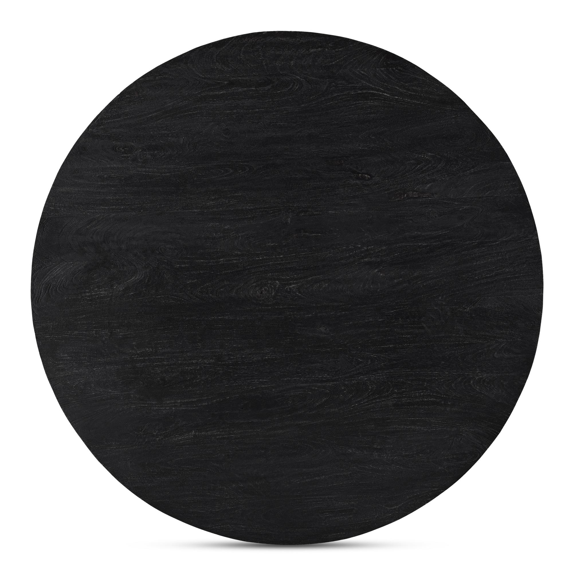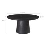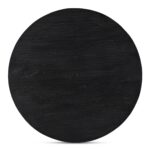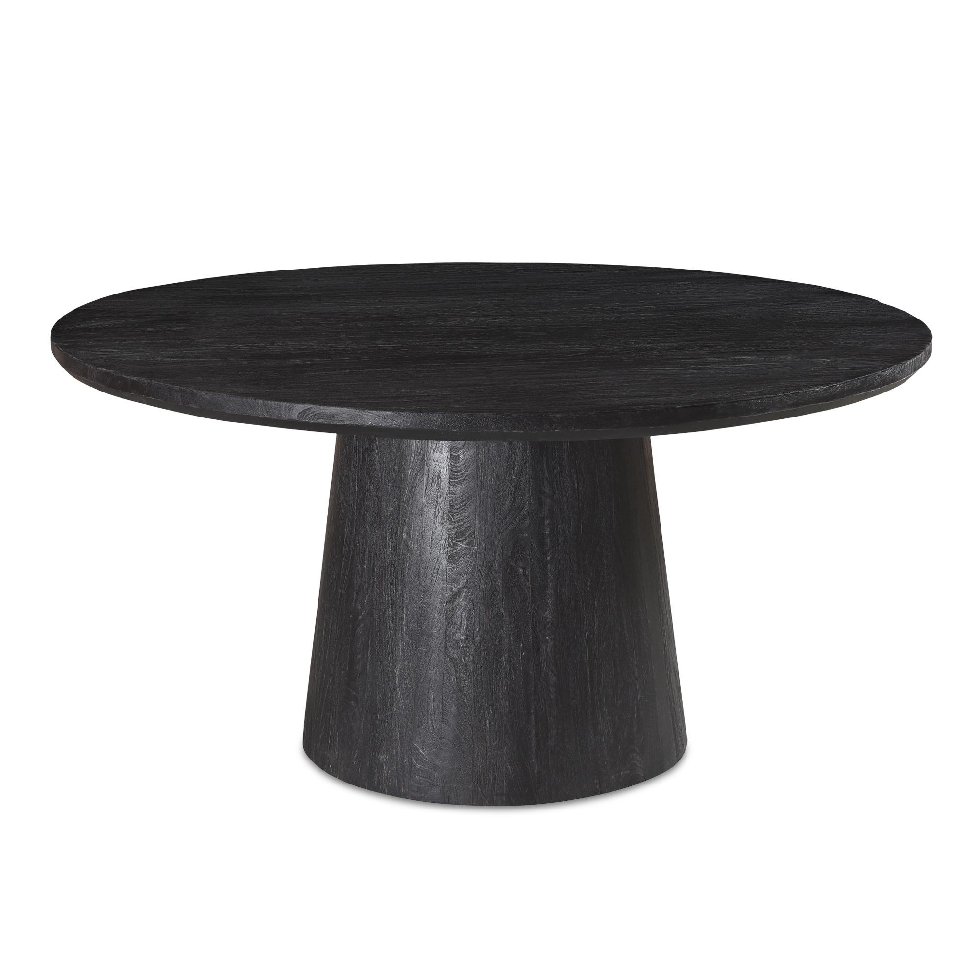 Bold in black with a sandblasted, cerused finish that accentuates the natural wood grain, the Cember dining table adds organic appeal and dramatic presence to any condo or smaller living space. A natural expression of modern rustic style, this piece features an oversized drum-shaped, tapered pedestal base, a solid foundation to a stately silhouette.