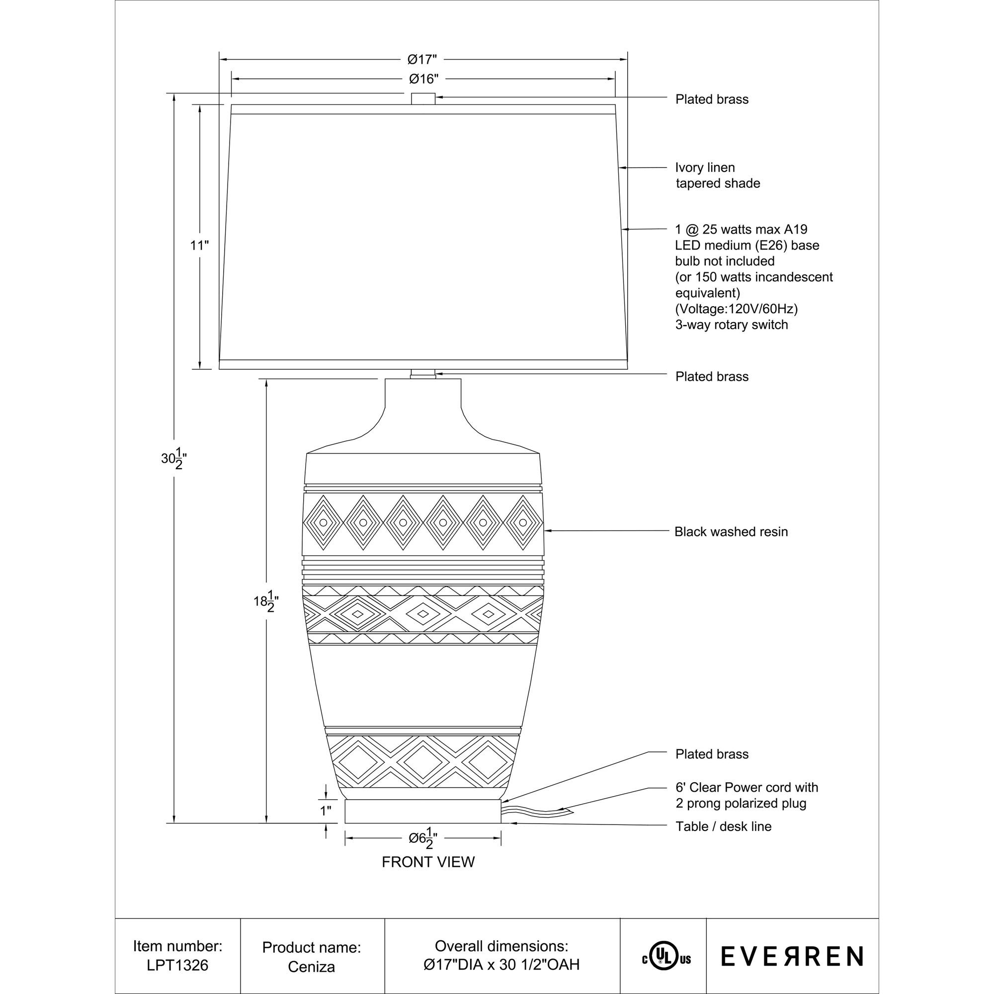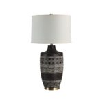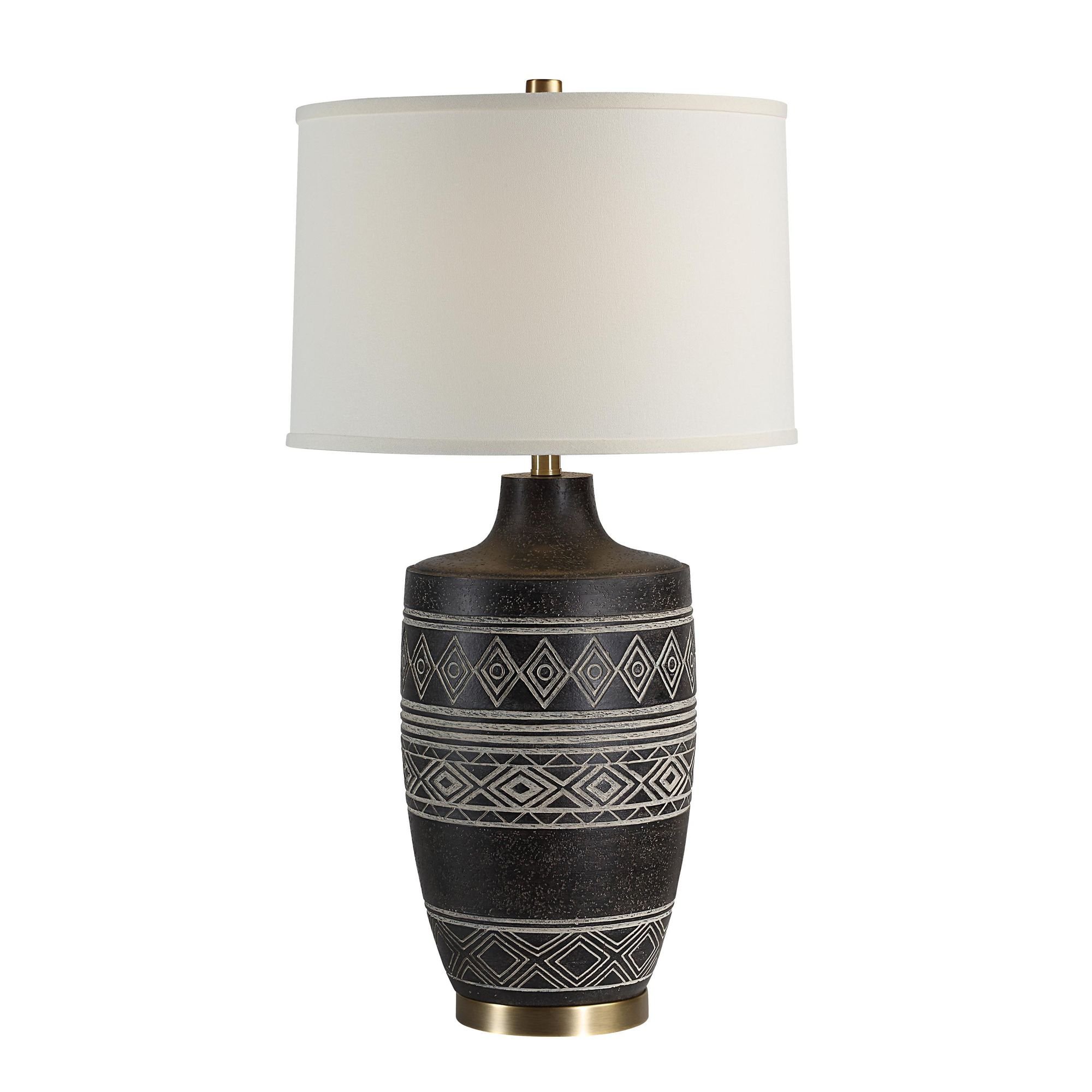 Create an eye-catching focal point in any decorating scheme with the Ceniza table lamp. Featuring a black-washed body patterned with a striking geometric motif, brushed brass-plated accents, and topped with a classic oatmeal linen drum shade, this lamp is a prime example of what happens when style meets function. Setting the ambiance in a bedroom, dining room, or living room is easy with this light’s 3-way switch that adjusts the lighting to suit any mood.