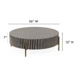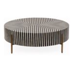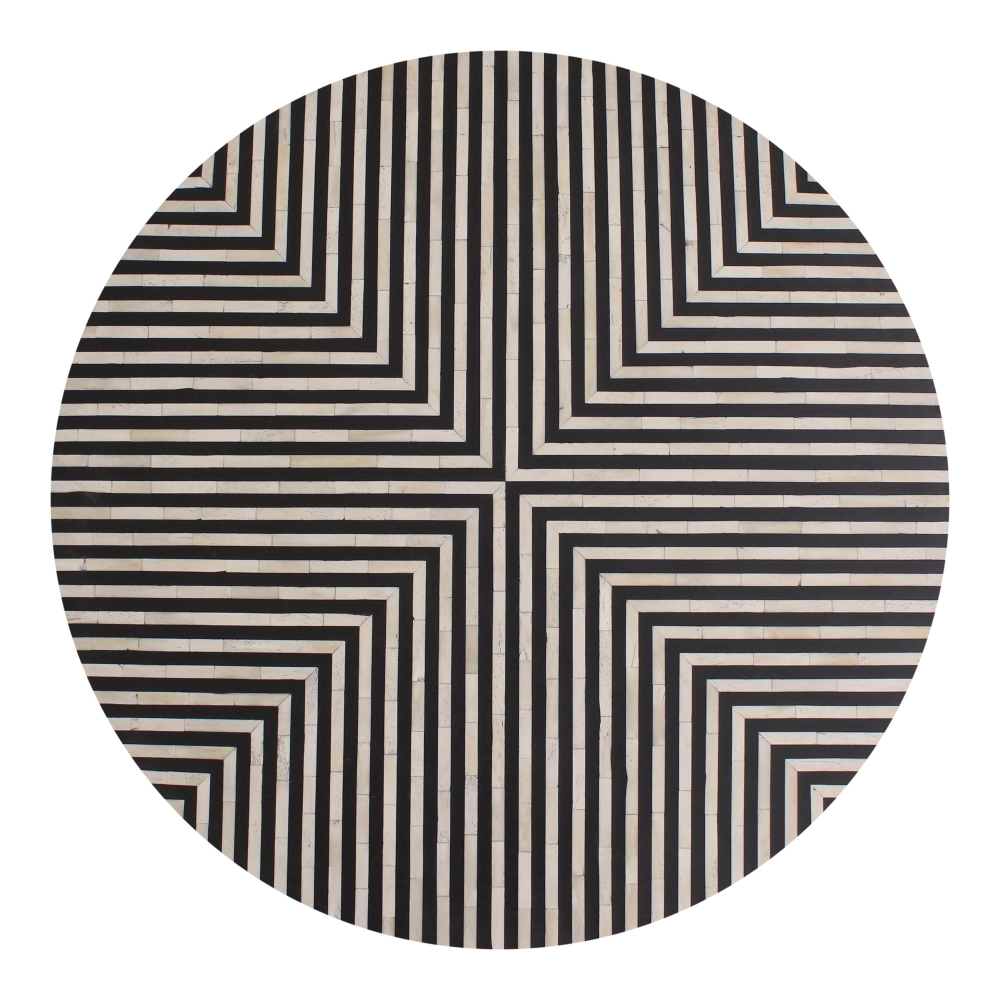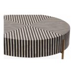 Simplistic and bold, the Chameau coffee table is an exercise in contrast, featuring a hypnotic art deco design. Simple construction and a delicate brass-finished base set off a veneer of white and black camel bone and resin, making a spellbinding visual statement. The Chameau series features a coffee table in three sizes and a side table perfect for any living space.