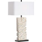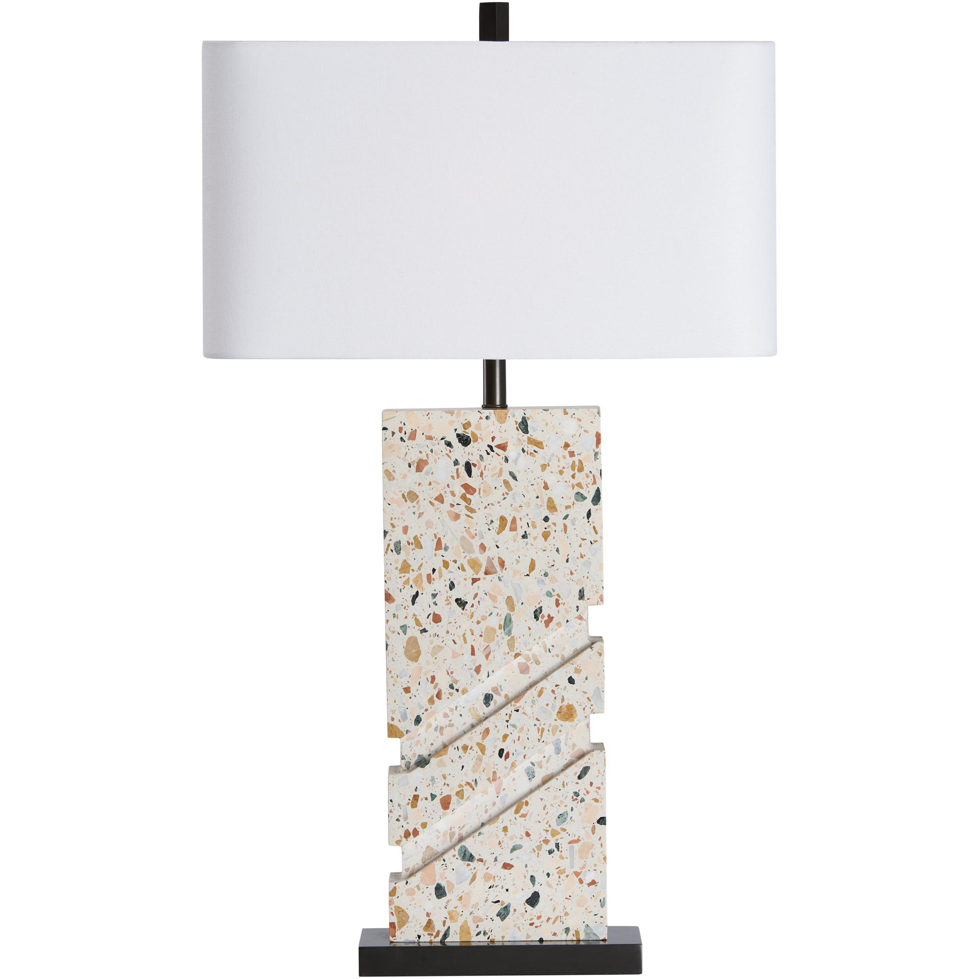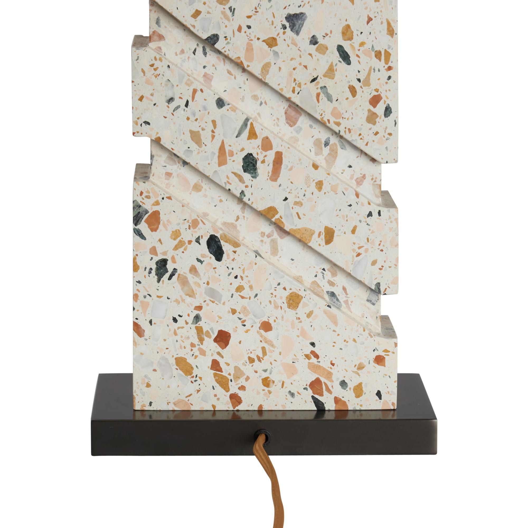 Make a bold statement with the Chandra Lamp, featuring a striking terrazzo base accented with dynamic angular cuts and grounded by a sleek bronze platform. Topped with a crisp rectangular shade, this piece blends artistic flair with modern sophistication.