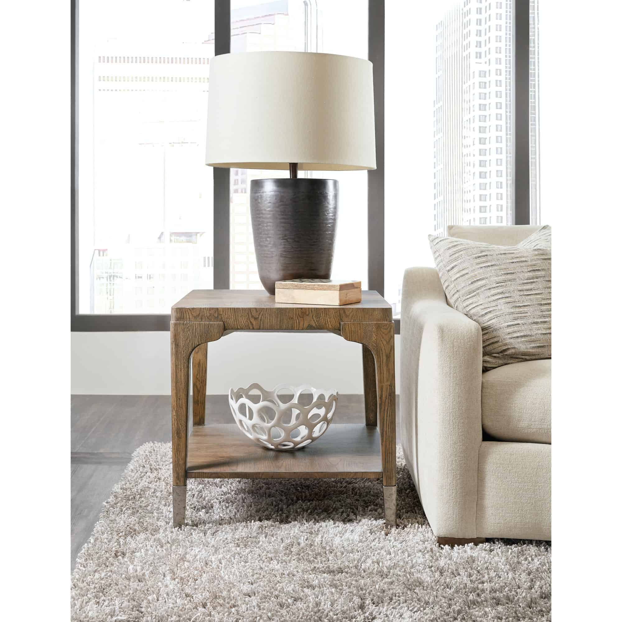 Finish: The Sorrel finish is features oak veneers in a warm brown finish. Unique hand-hammered metal accents in a forged pewter finish add to the contemporary style. Distressing includes sandblasting, wirebrushings, worm holes, and rock distressing.