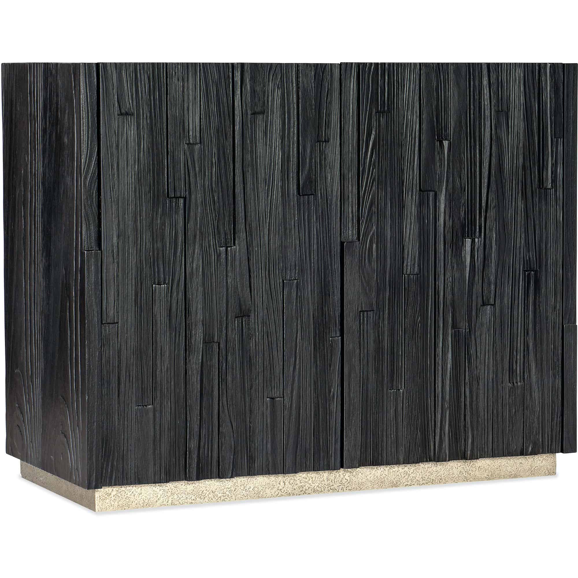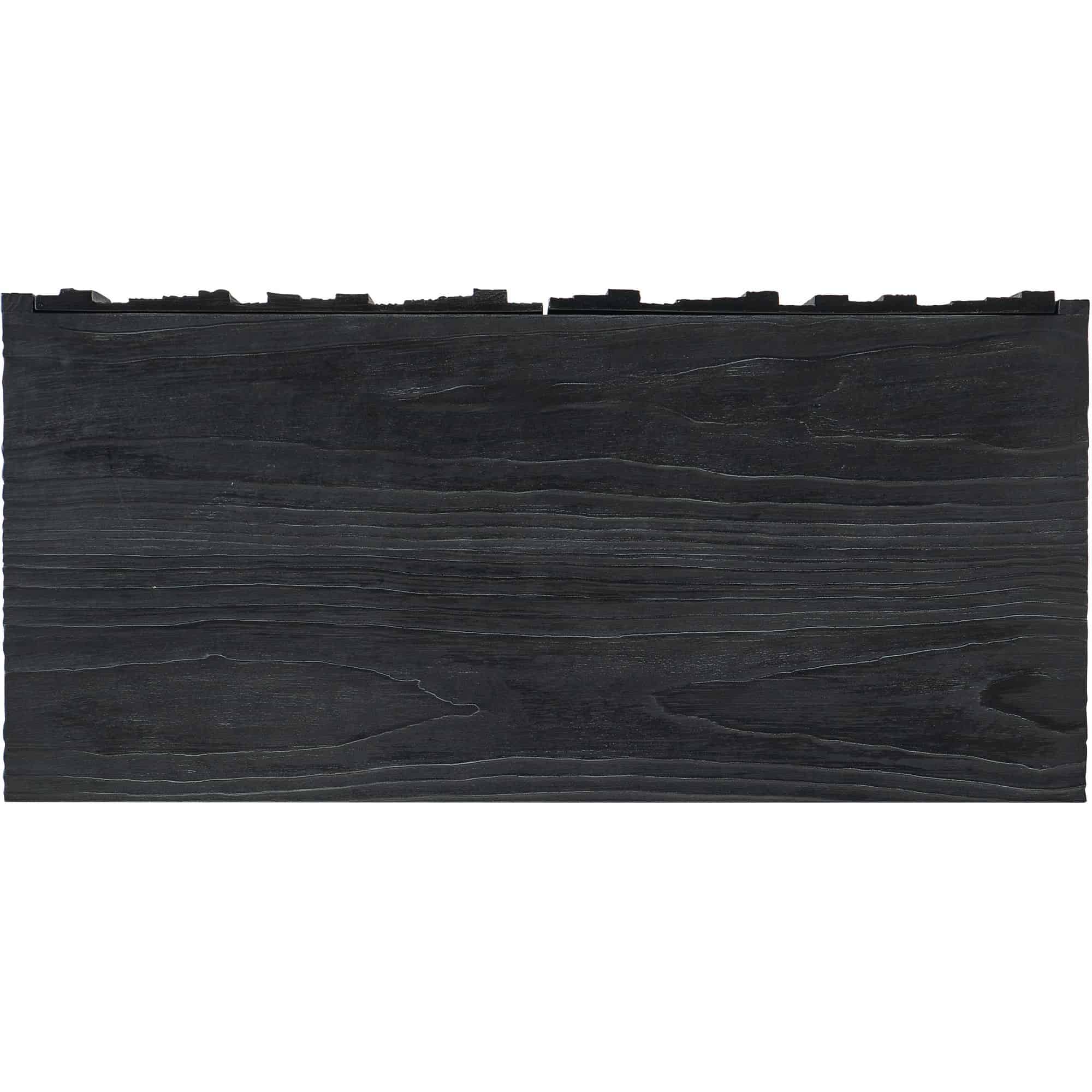 Finish: The Charred Black finish is achieved through Shou Sugi Ban, a Japanese technique that creates a look resembling burnt wood. Accent pewter finish on base to simulate metal. Distressing includes sandblasing, wirebrushing, wormholes, and rock distressing.