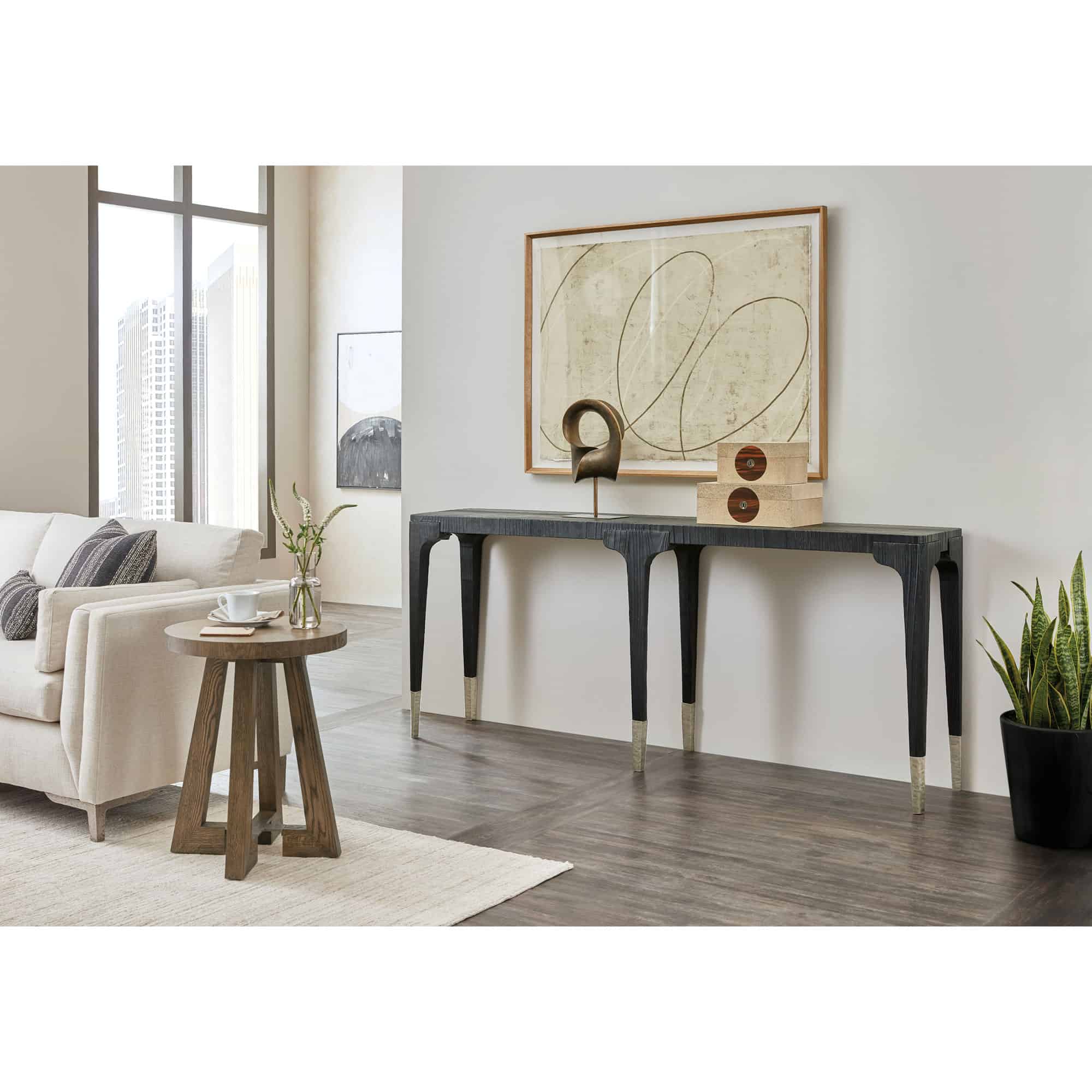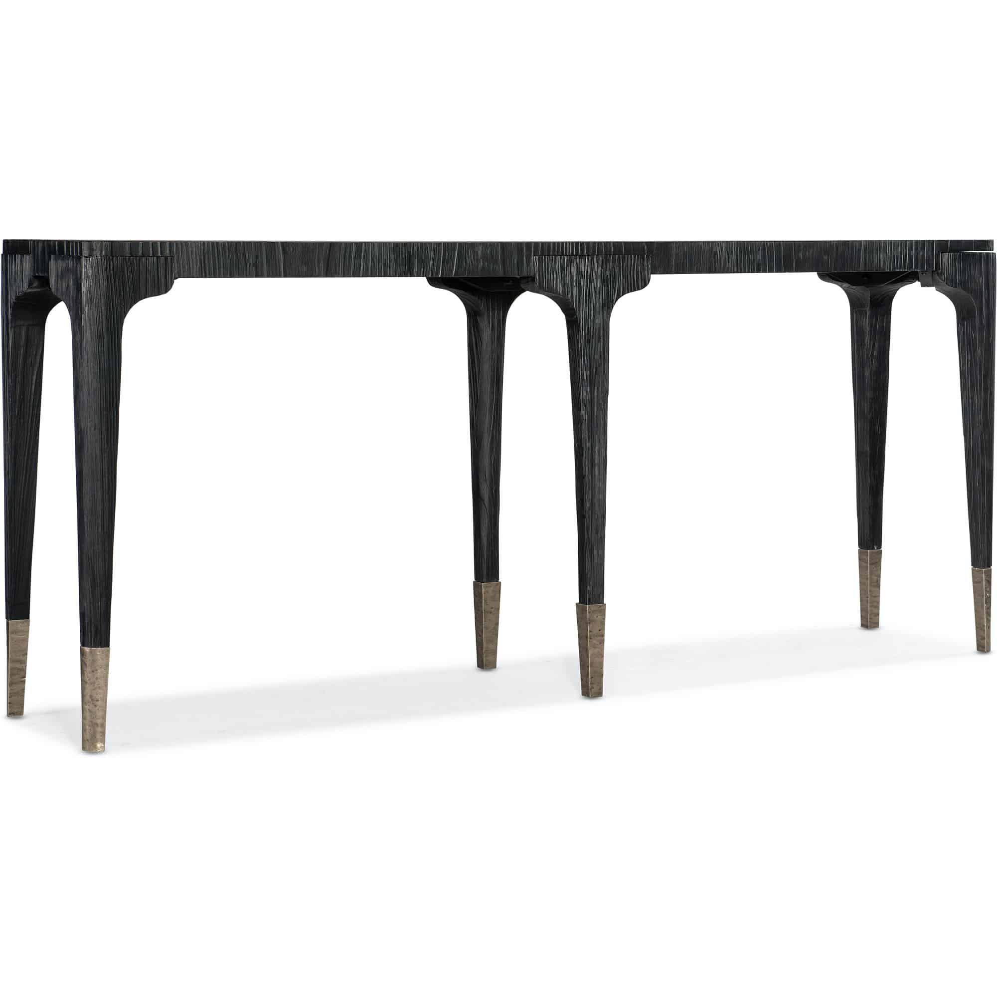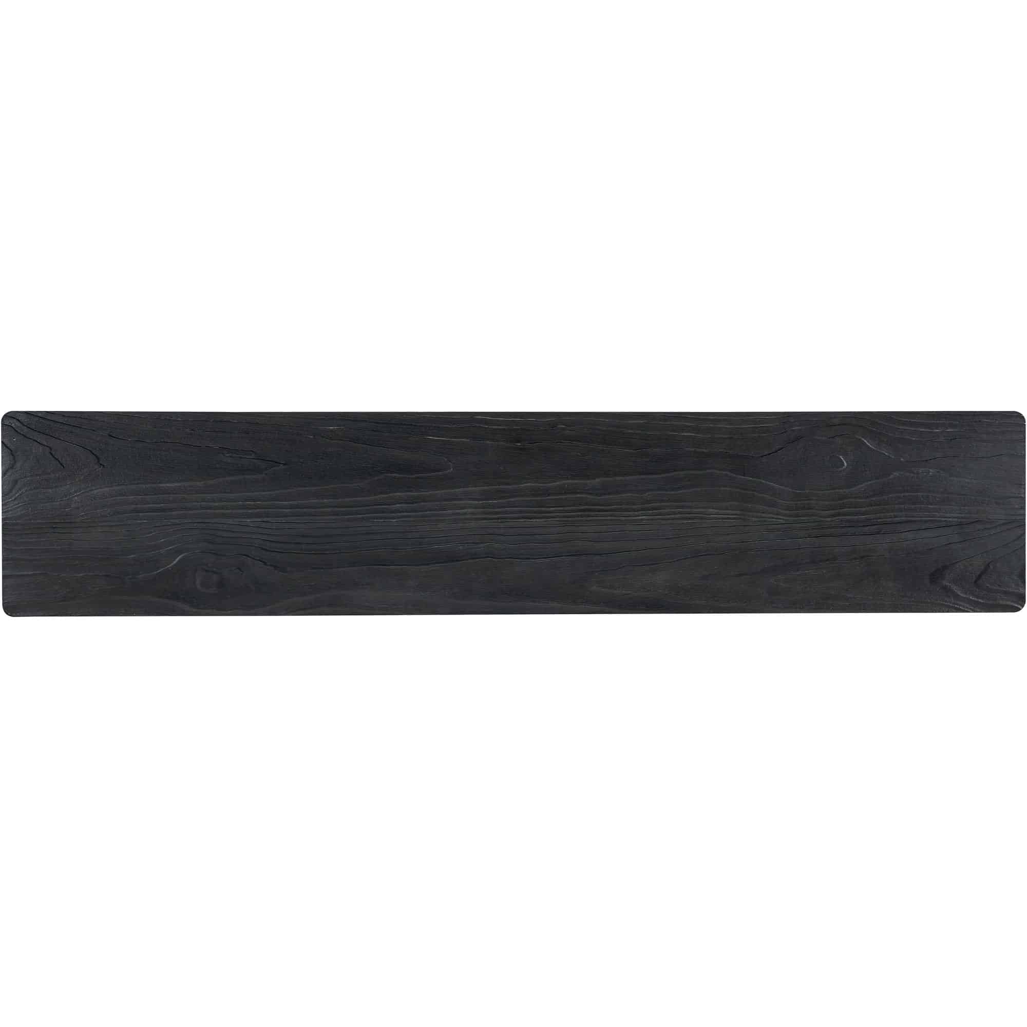 Finish: The Charred Black finish is achieved through Shou Sugi Ban, a Japanese technique that creates a look resembling burnt wood. Unique hand-hammered metal accents in a forged pewter finish add to the contemporary style. Distressing includes sandblasing, wirebrushing, wormholes, and rock distressing.