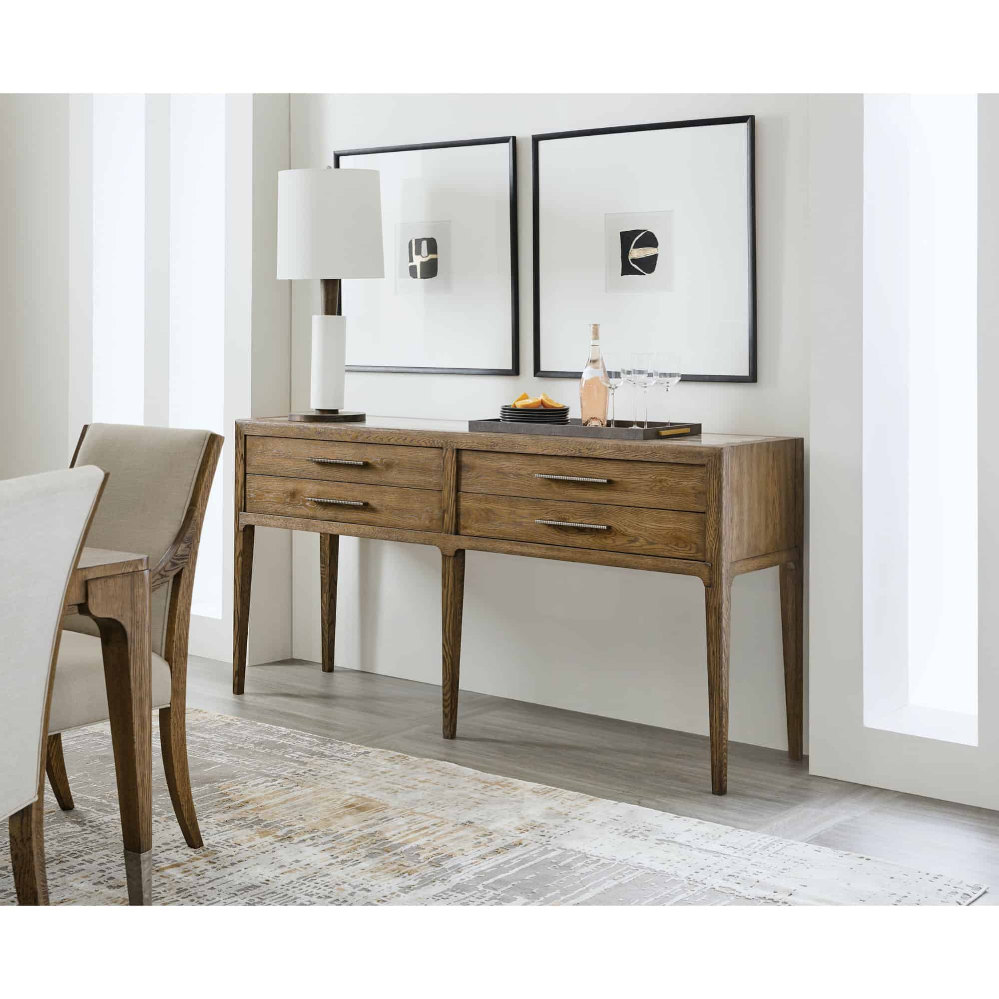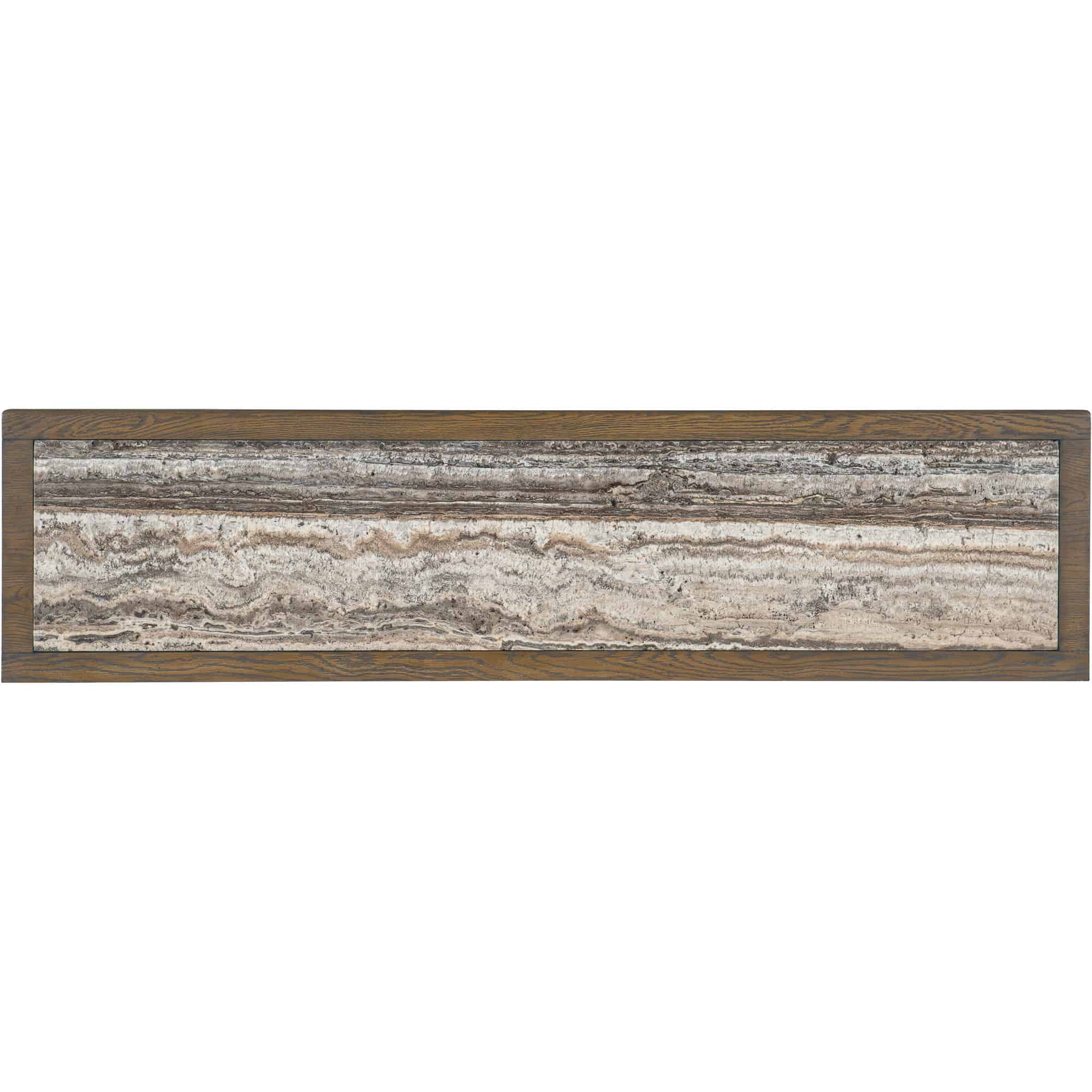 Finish: The Sorrel finish is features oak veneers in a warm brown finish. Custom hardware in a forged pewter finish add to the contemporary style. Honed Silver Travertine stone veneer top features gray, brown and beige coloring. Distressing includes sandblasting, wirebrushings, worm holes, and rock distressing.