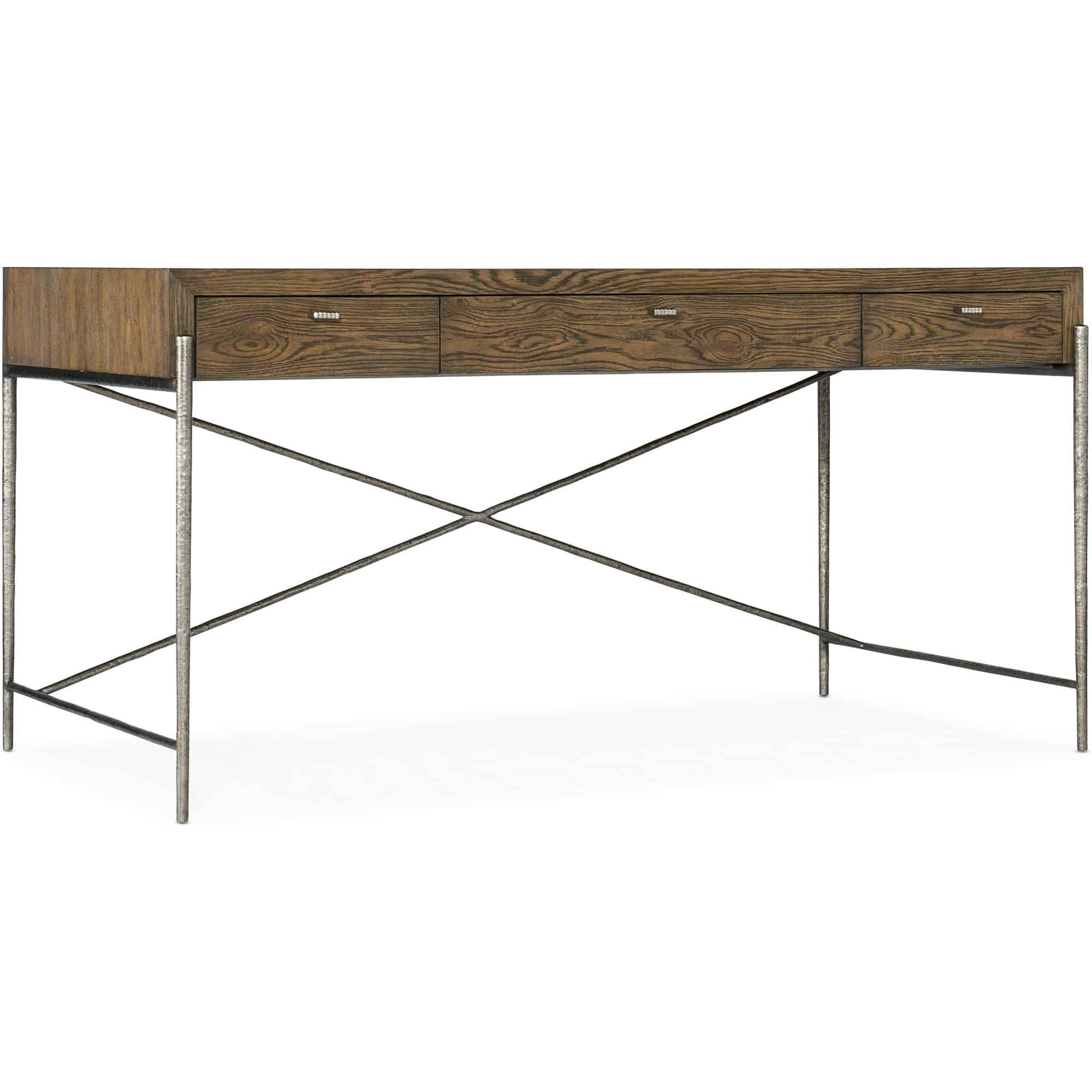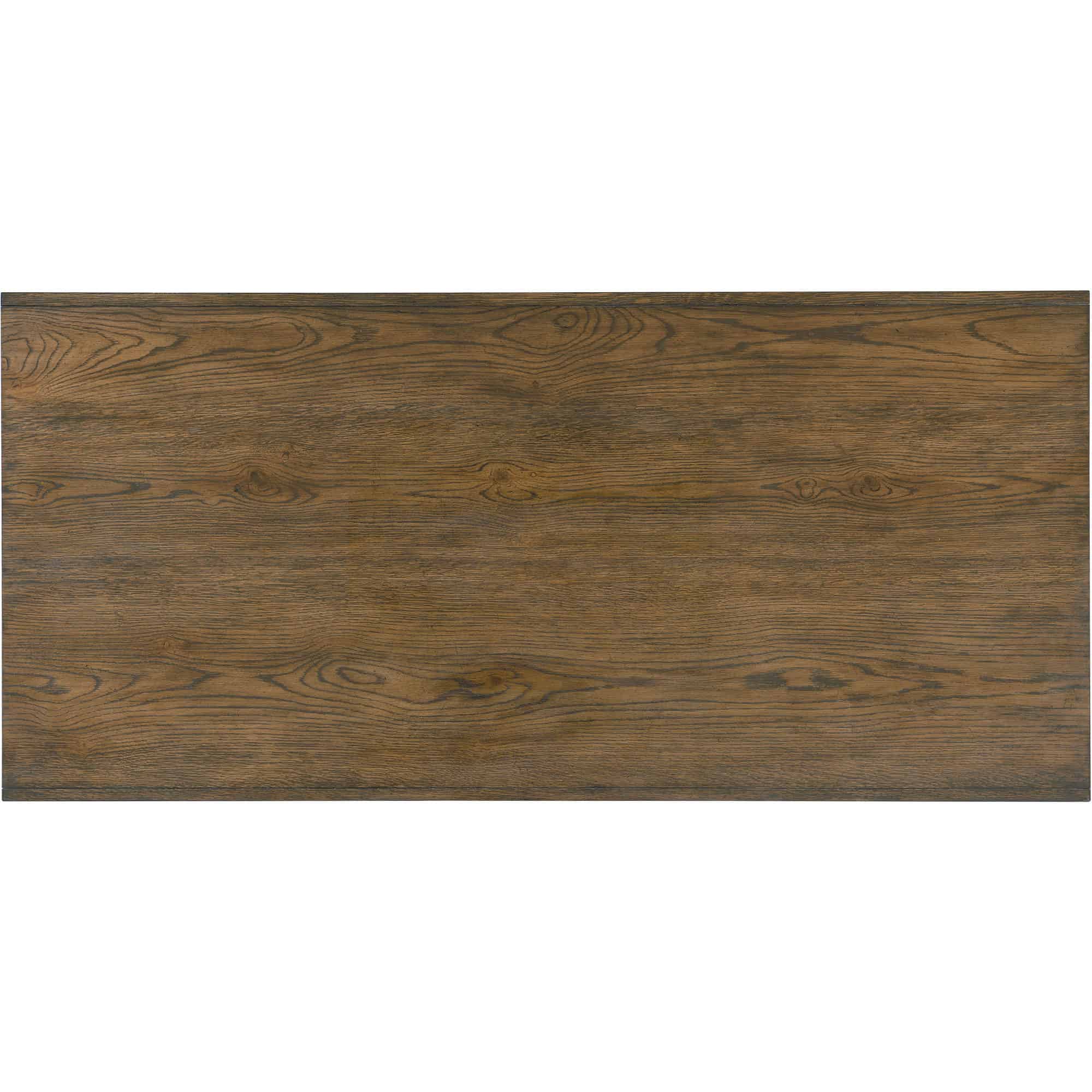 Finish: The Sorrel finish is features oak veneers in a warm brown finish. Custom hardware and unique hand-hammered metal accents in a forged pewter finish add to the contemporary style. Distressing includes sandblasting, wirebrushings, worm holes, and rock distressing.