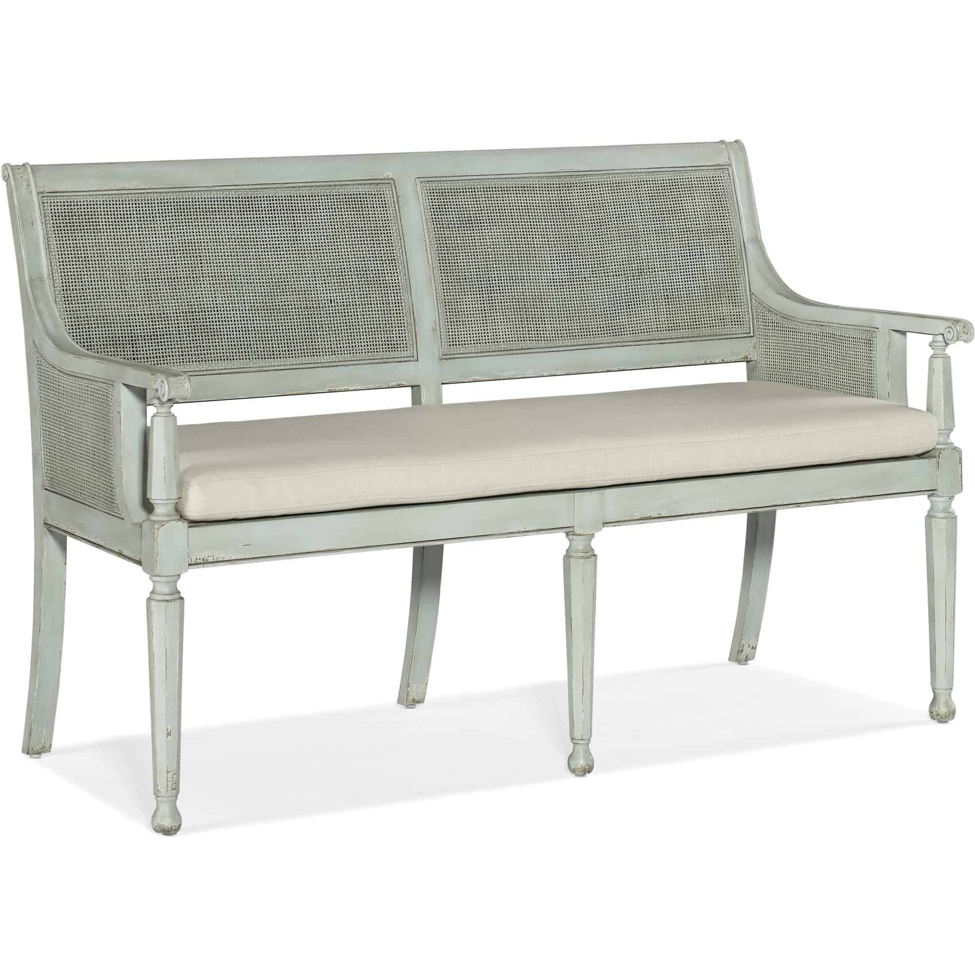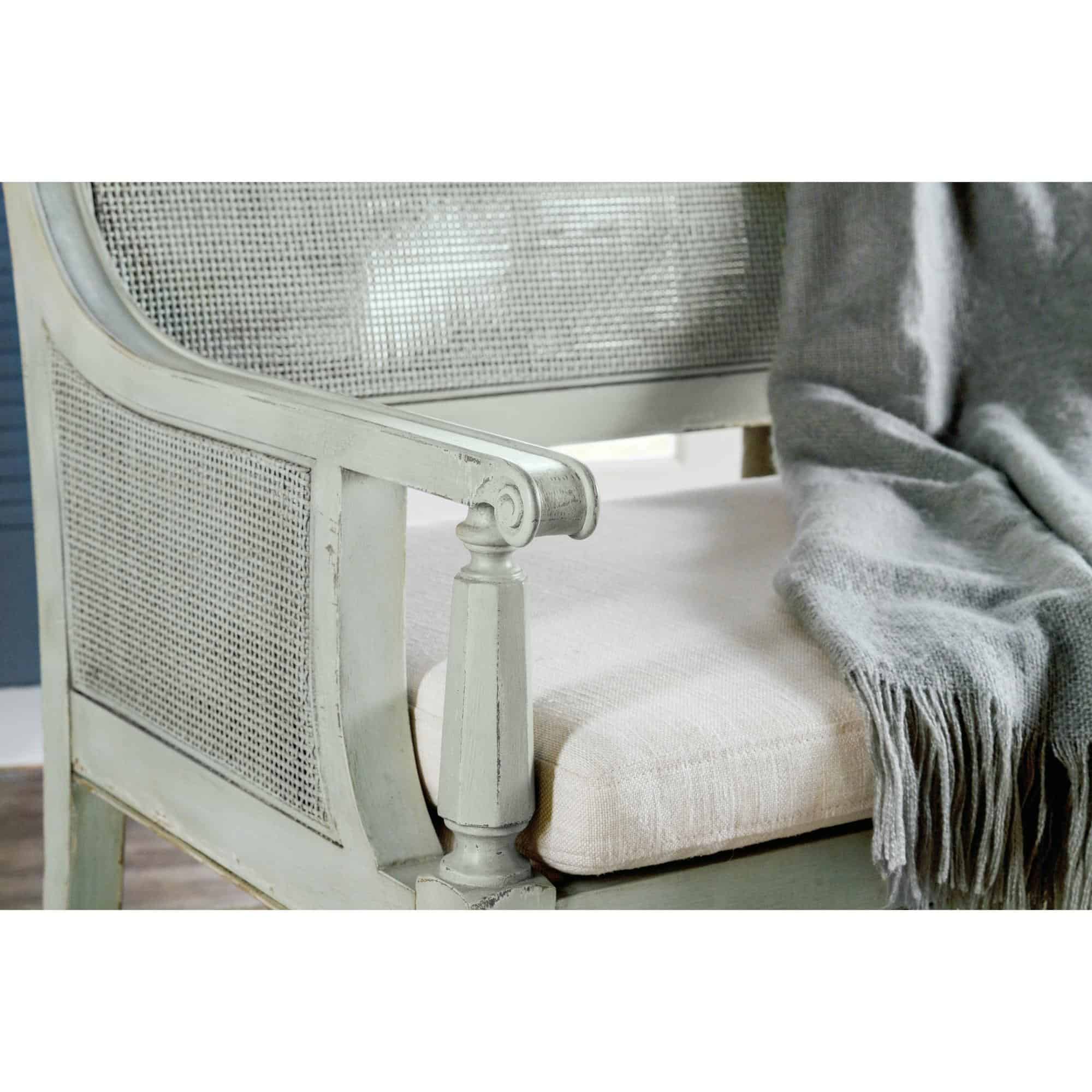 Features: Fabric seat cushion Performance fabric Tack in floor glide Cane back and inside and outside arms