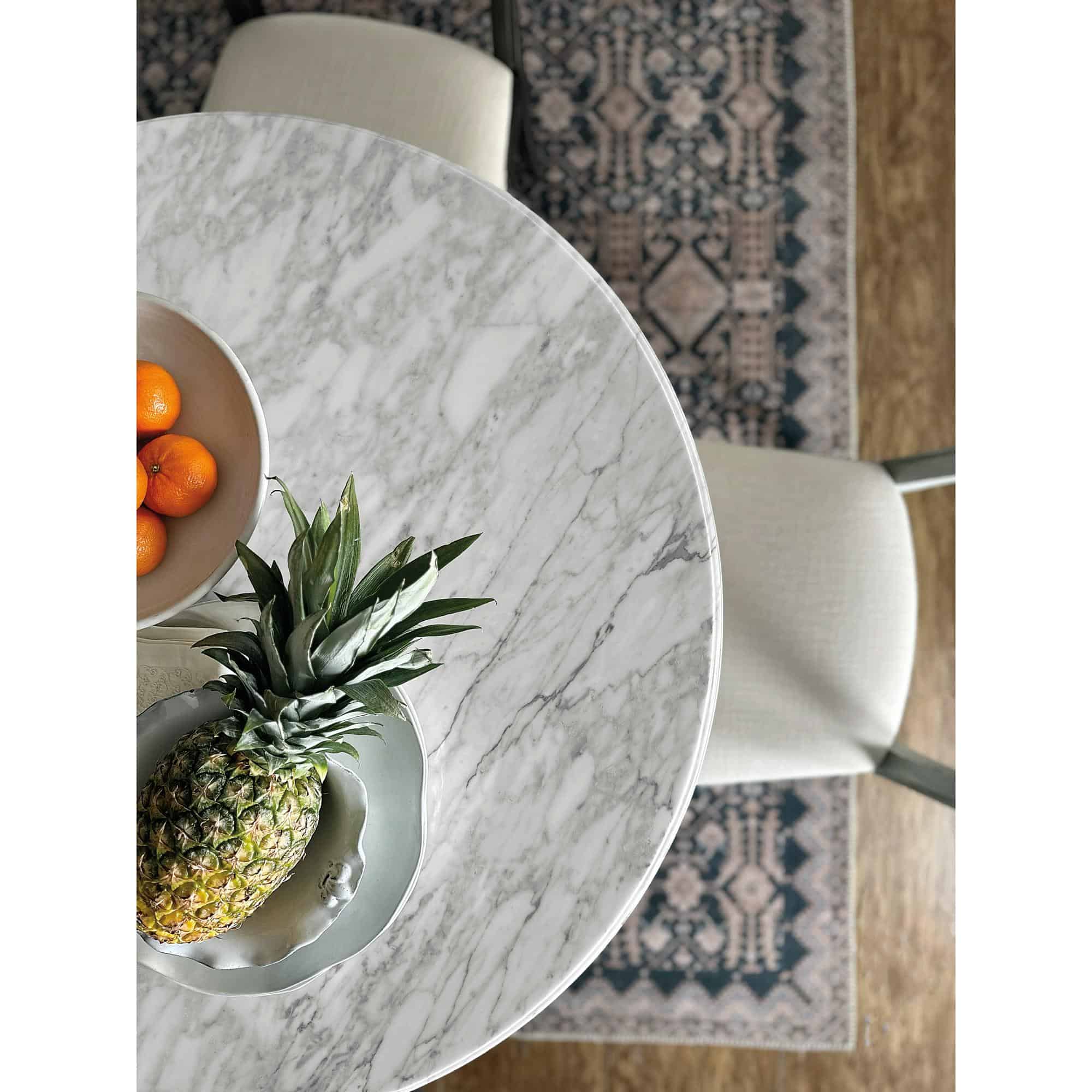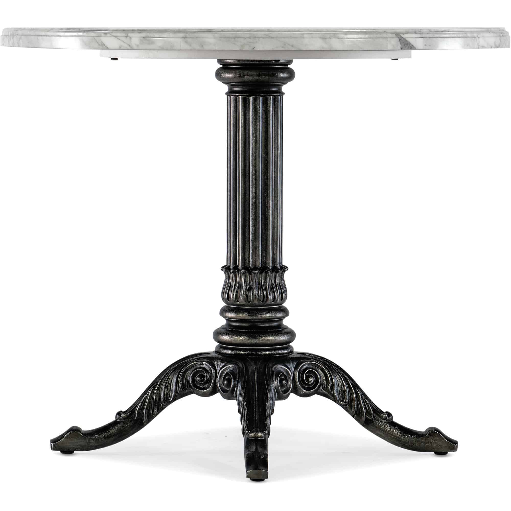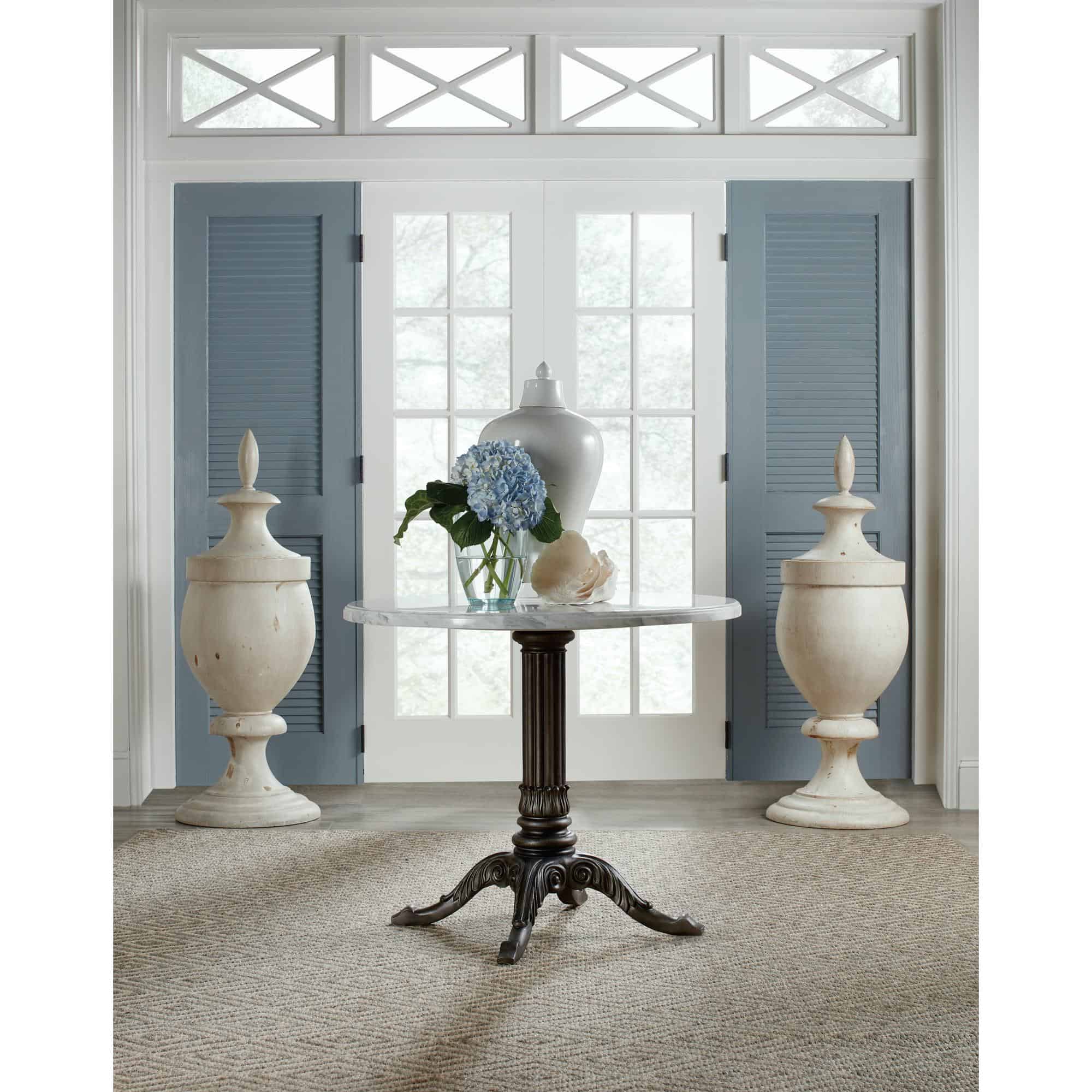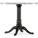Features: Round shape Stone veneer top Carved pedestal base Will accommodate up to four coordinating chairs Levelers