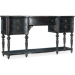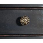 Finish: Black Cherry: this finish emulates the vibrancy of the warm cherry finish shining from beneath the Black Cherry patina and includes subtle distressing which exemplifies the heirloom nature of the collection. Decorative ring pulls and carved round knob hardware features antique bronze color.