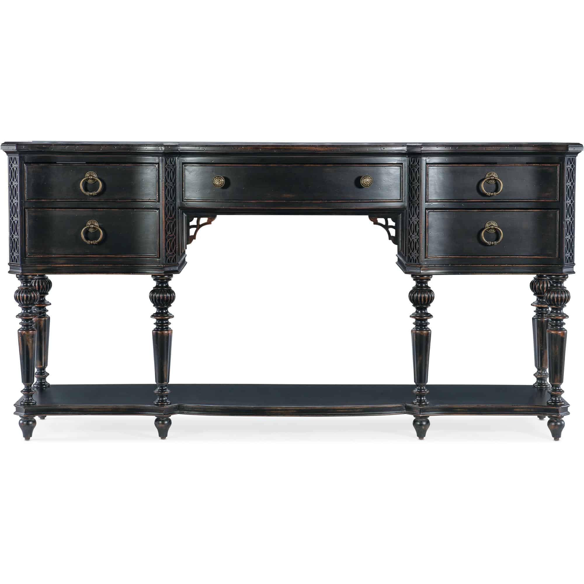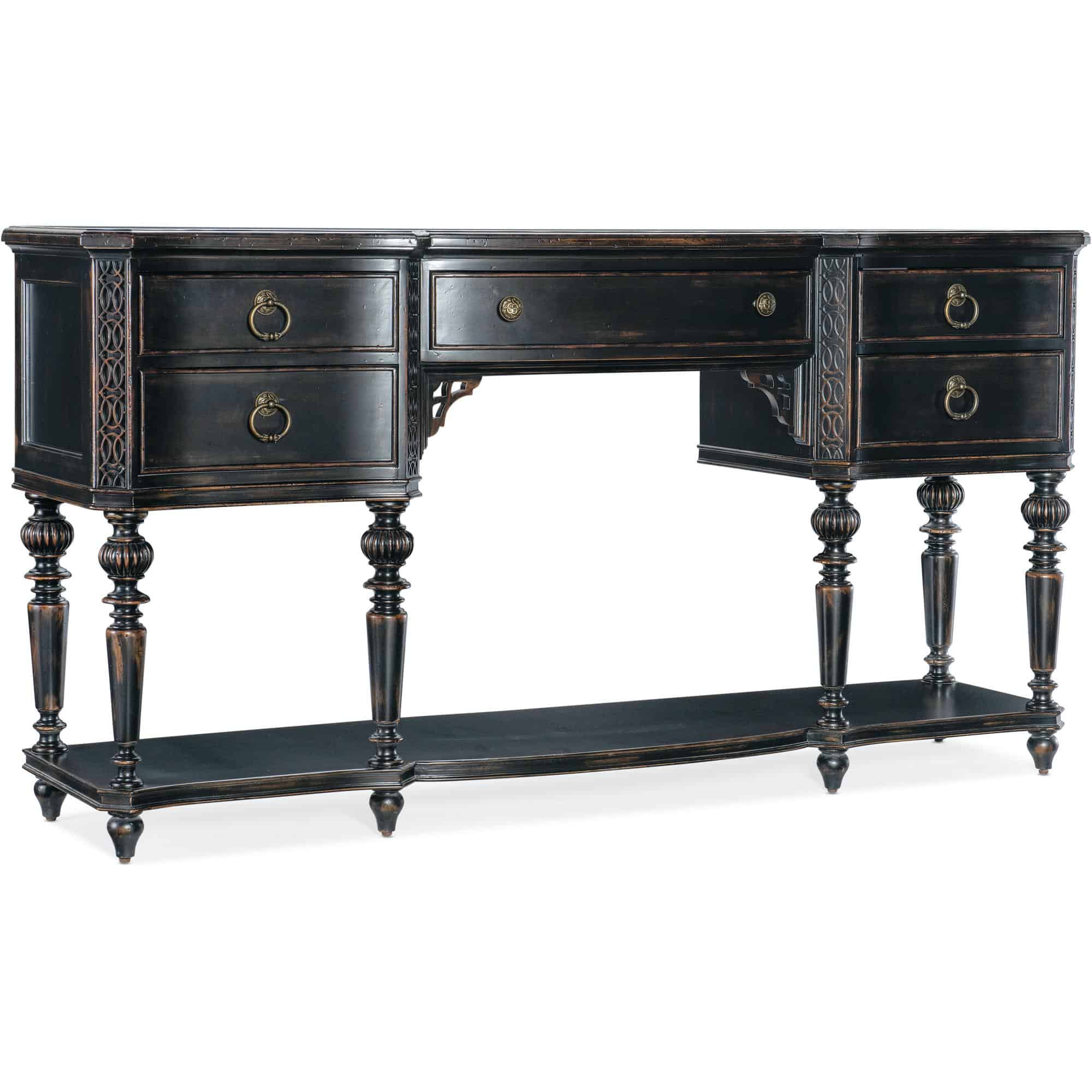 Features: Five self-closing drawers Cherry color on drawer interiors Left and right top drawers have removable felt liners Center drawer has a removable felt lined silverware tray Levelers Fretwork accents on edges Scroll bracket accents below center drawer Six turned, carved legs One fixed shelf at the bottom