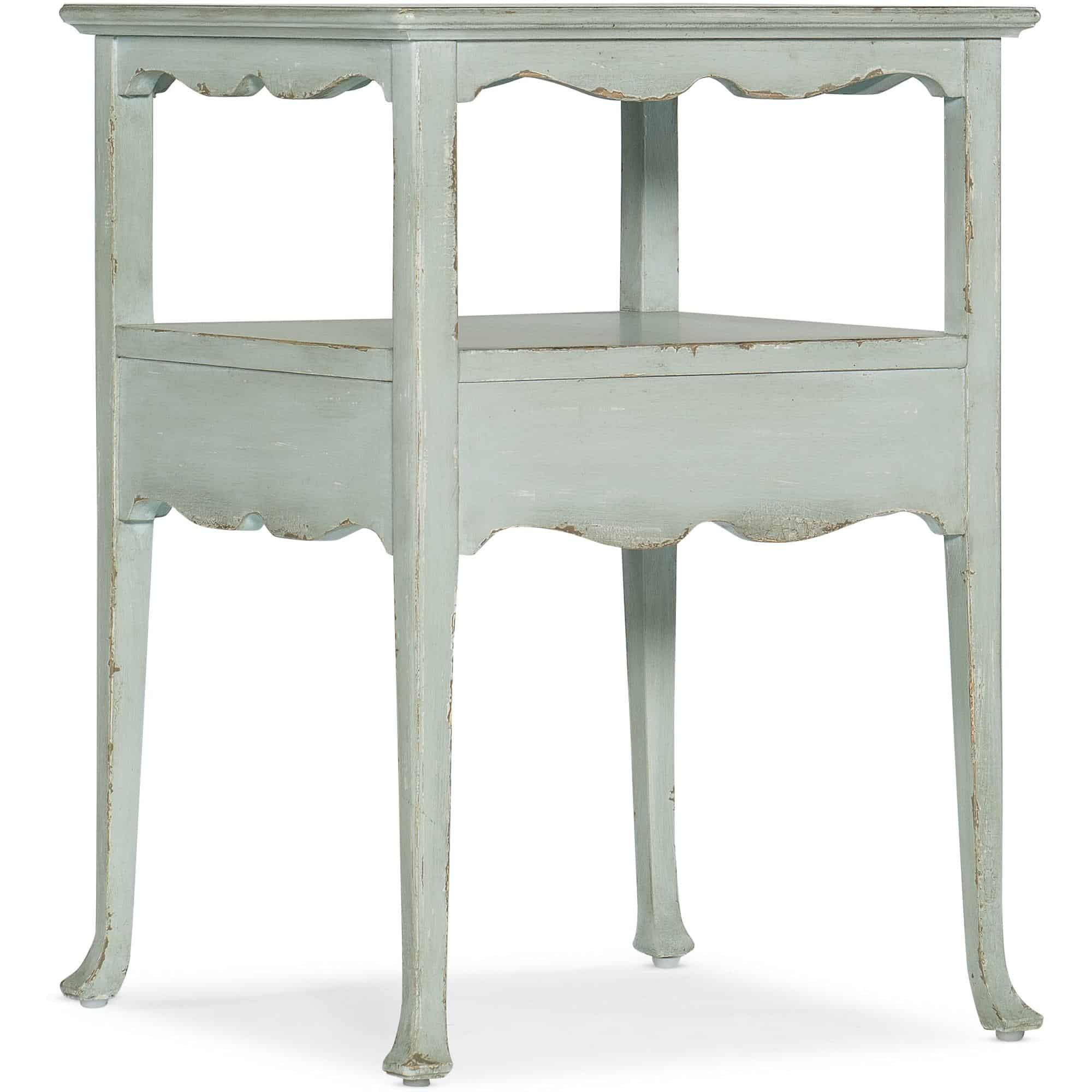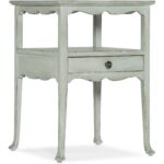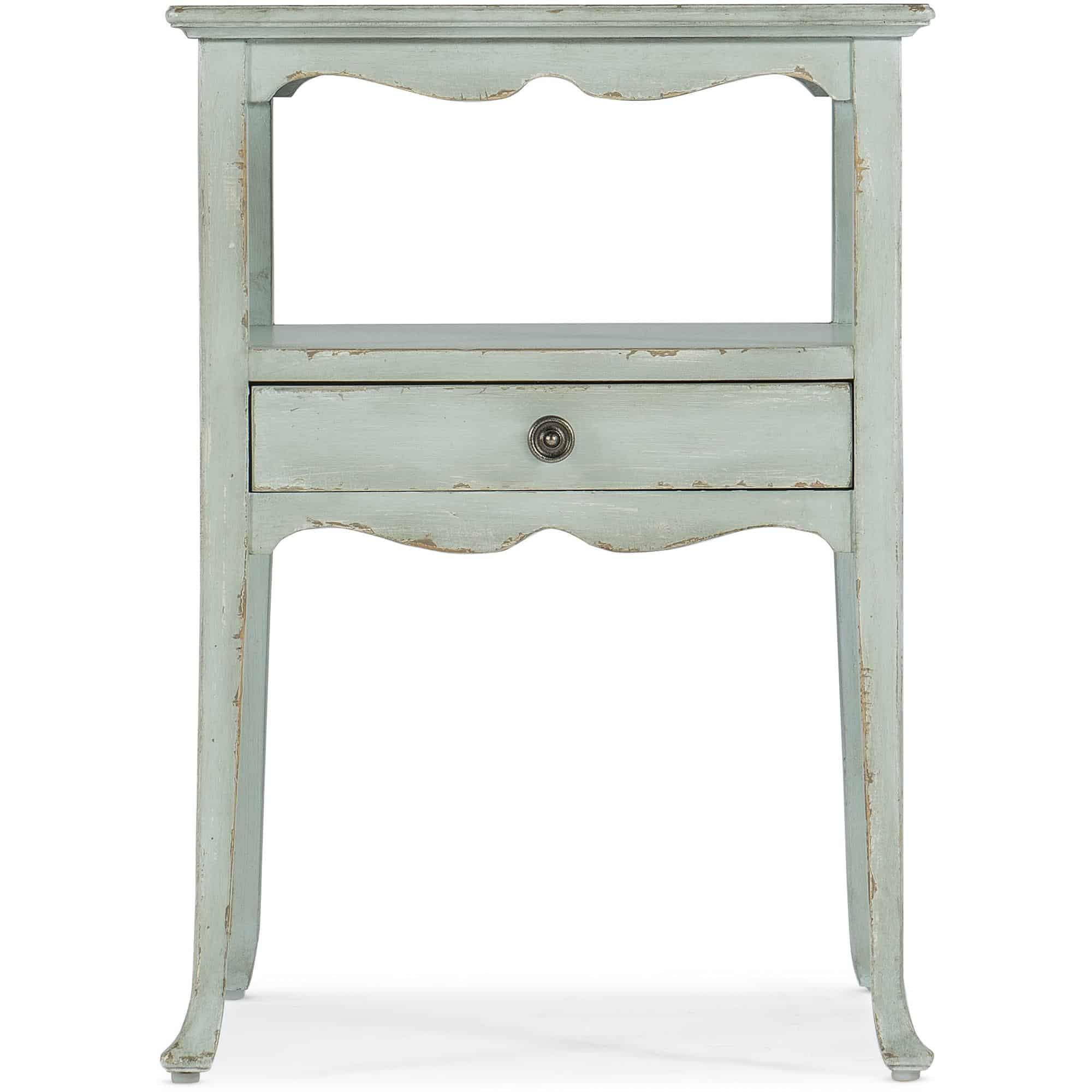 Features: One drawer with self-close drawer guides Matching finish drawer interior Open area above drawer creates shelf storage Finished on all sides and can float in a room Scalloped accent trim Levelers