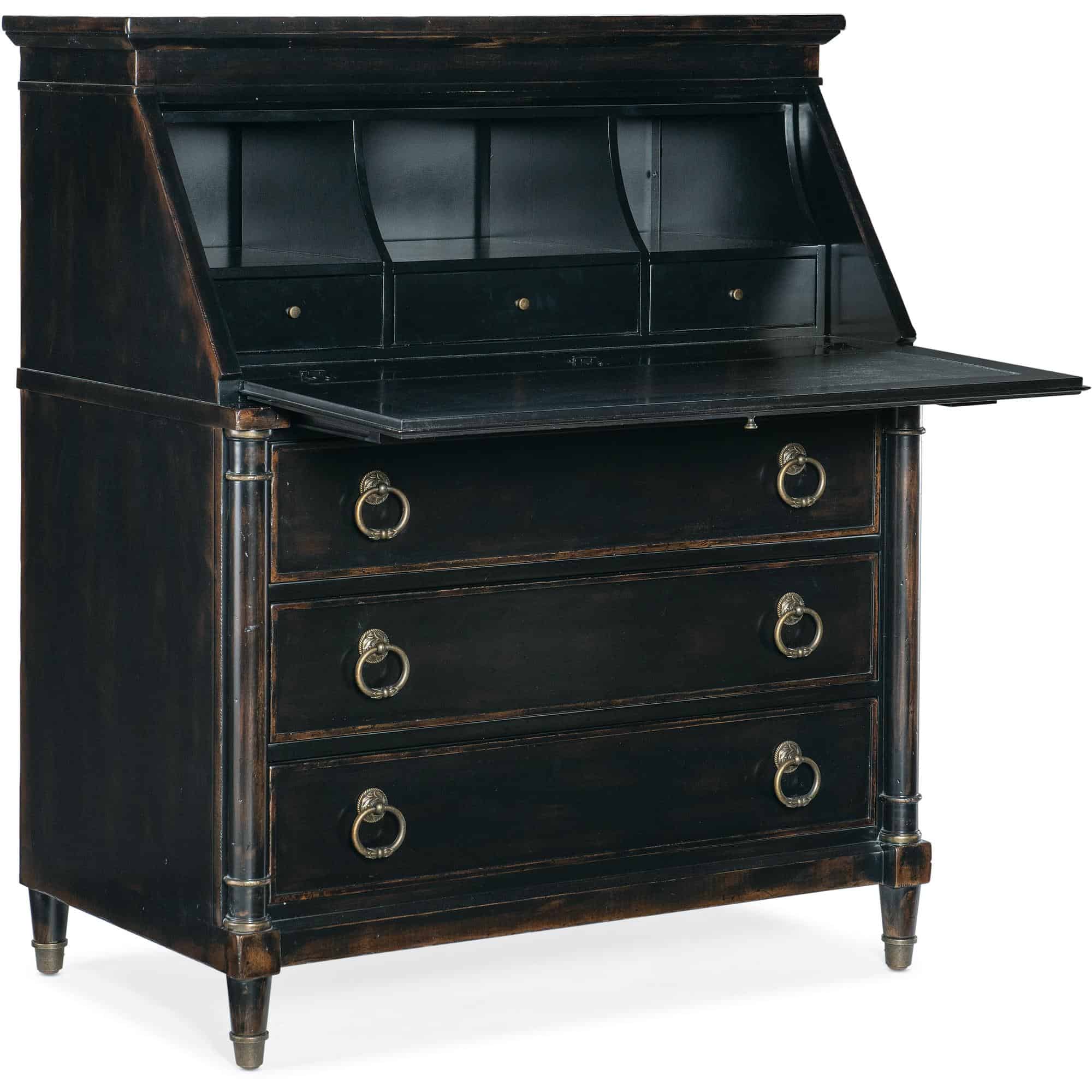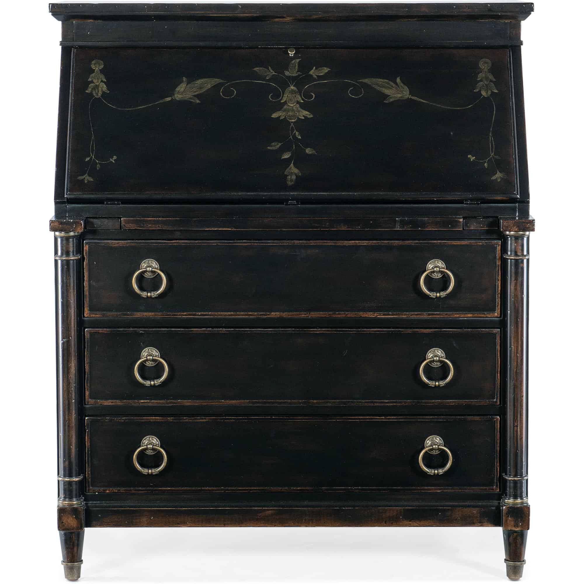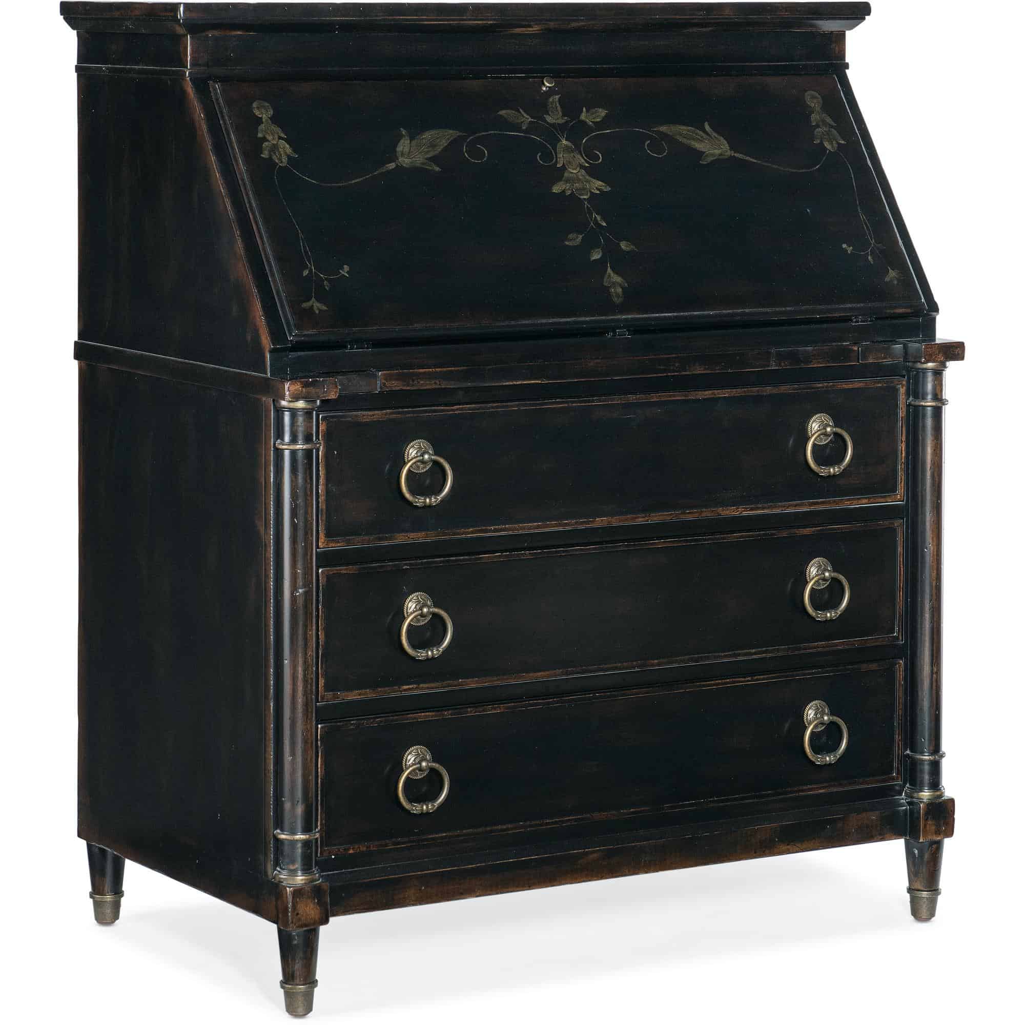 Finish: Black Cherry: this finish emulates the vibrancy of the warm cherry finish shining from beneath the Black Cherry patina and includes subtle distressing which exemplifies the heirloom nature of the collection. Handpainted accents on the drop-front. Knobs and decorative ring pulls feature an antique bronze color.