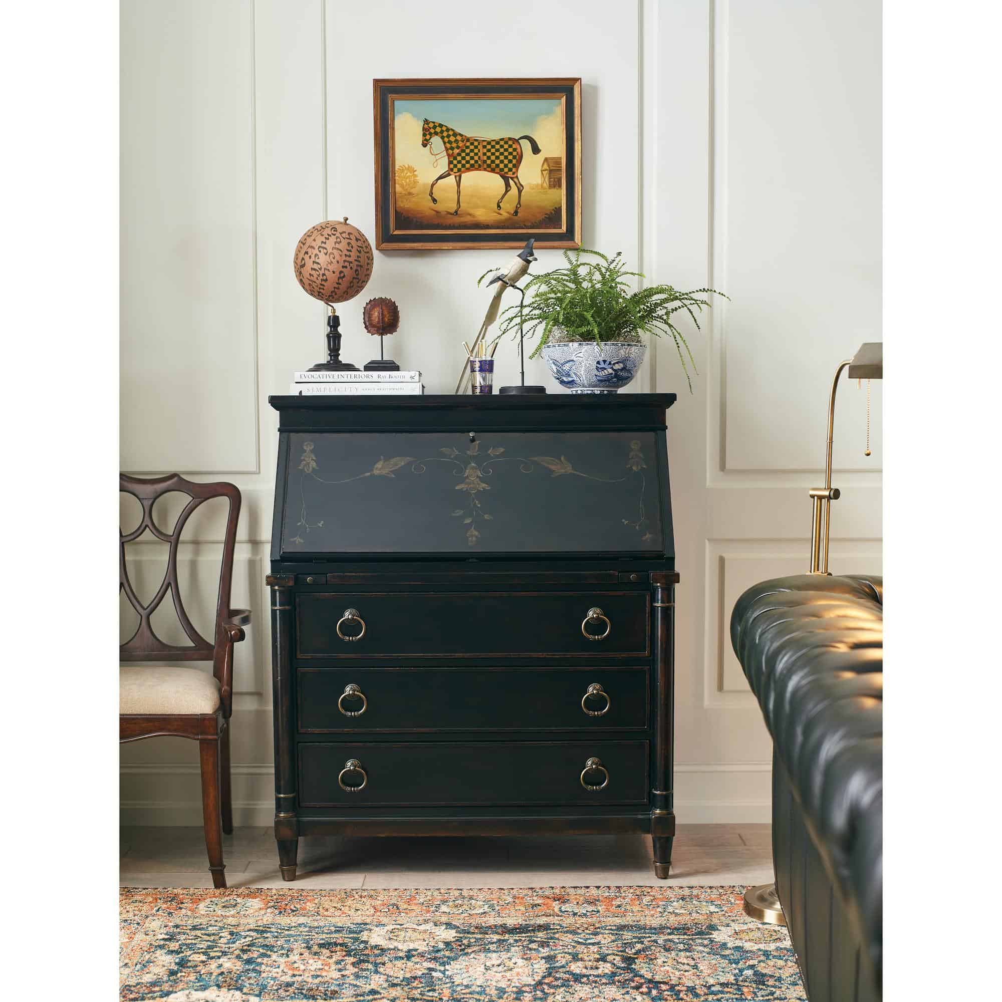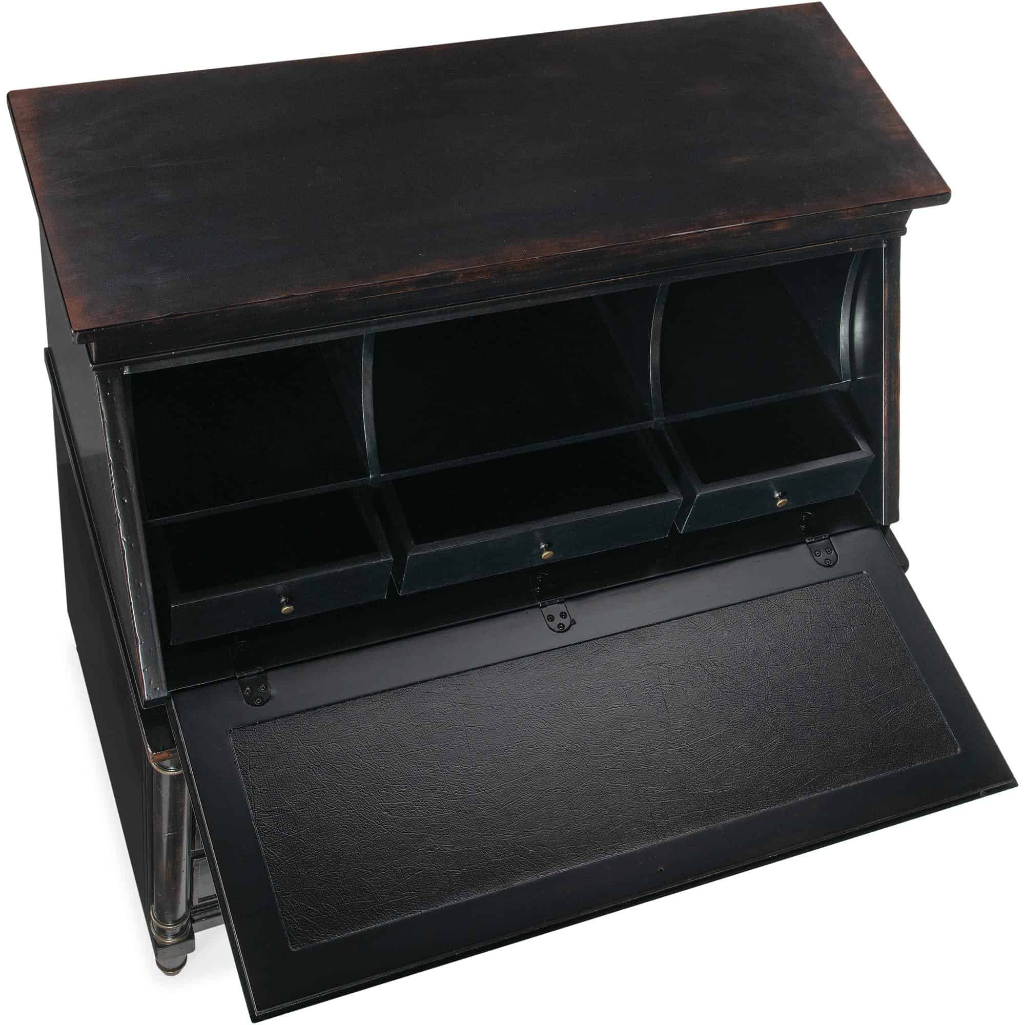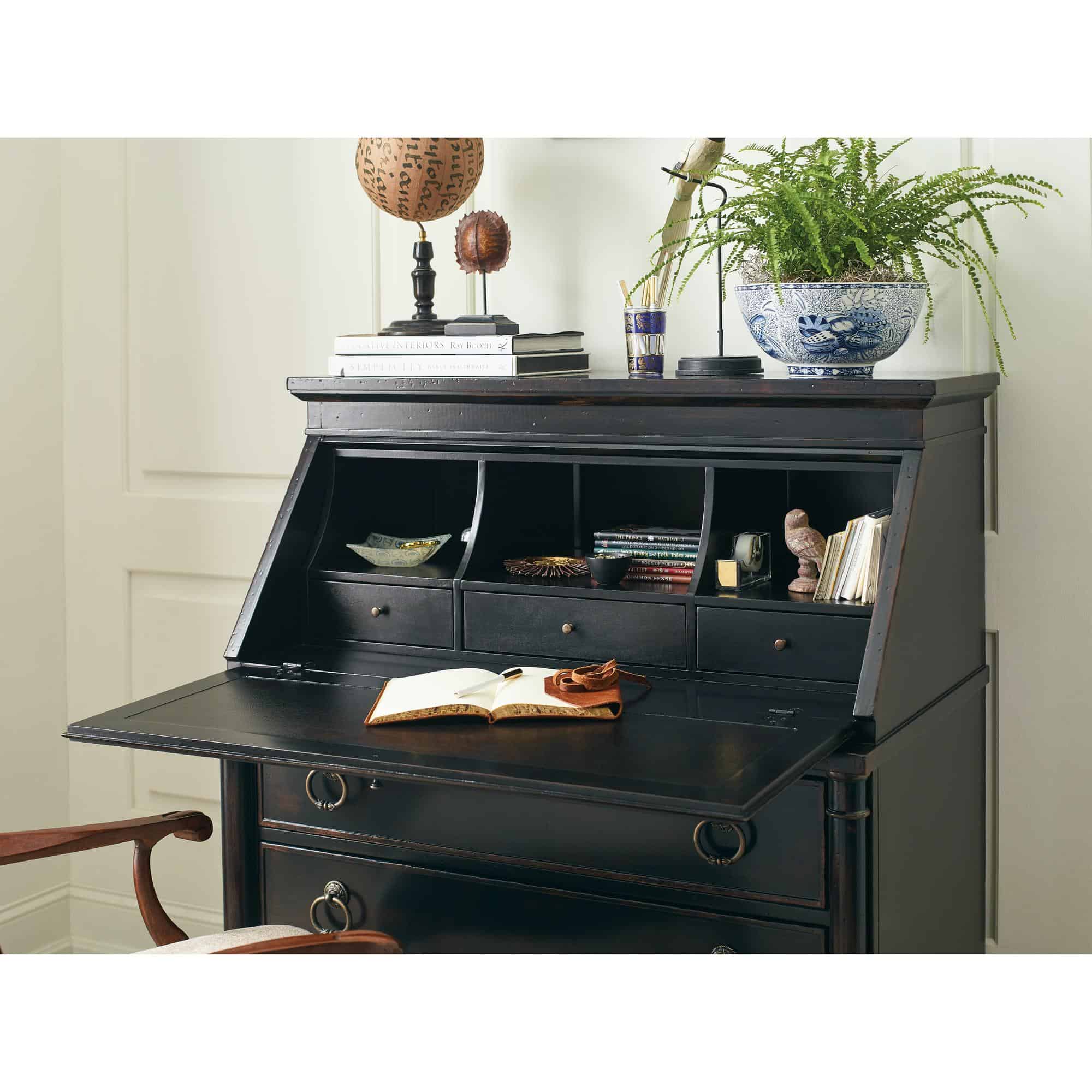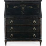 Finish: Black Cherry: this finish emulates the vibrancy of the warm cherry finish shining from beneath the Black Cherry patina and includes subtle distressing which exemplifies the heirloom nature of the collection. Handpainted accents on the drop-front. Knobs and decorative ring pulls feature an antique bronze color.