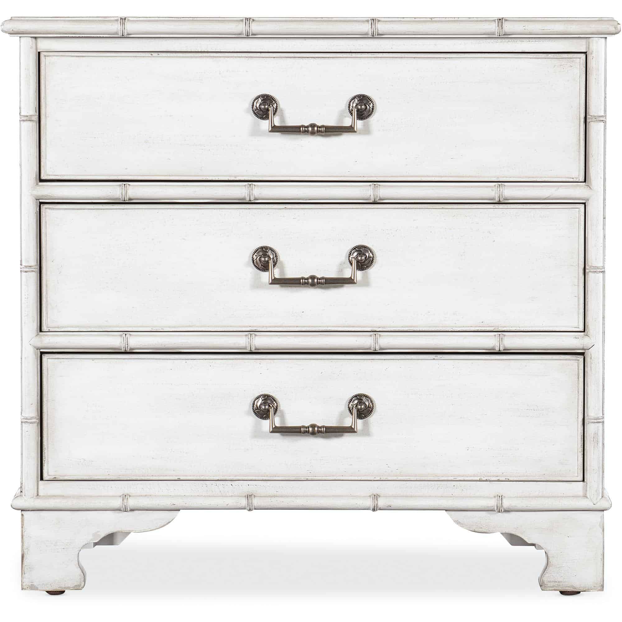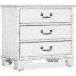 Features: Three drawers with self-closing drawer guides Drawer interior is painted gray Levelers Bamboo designed accents
