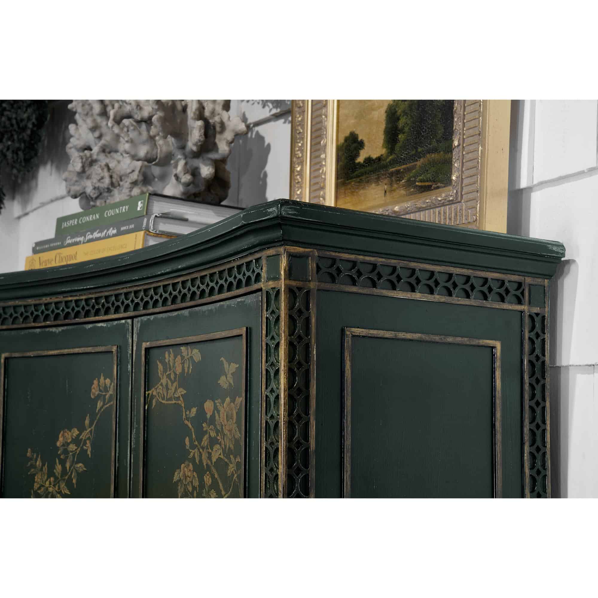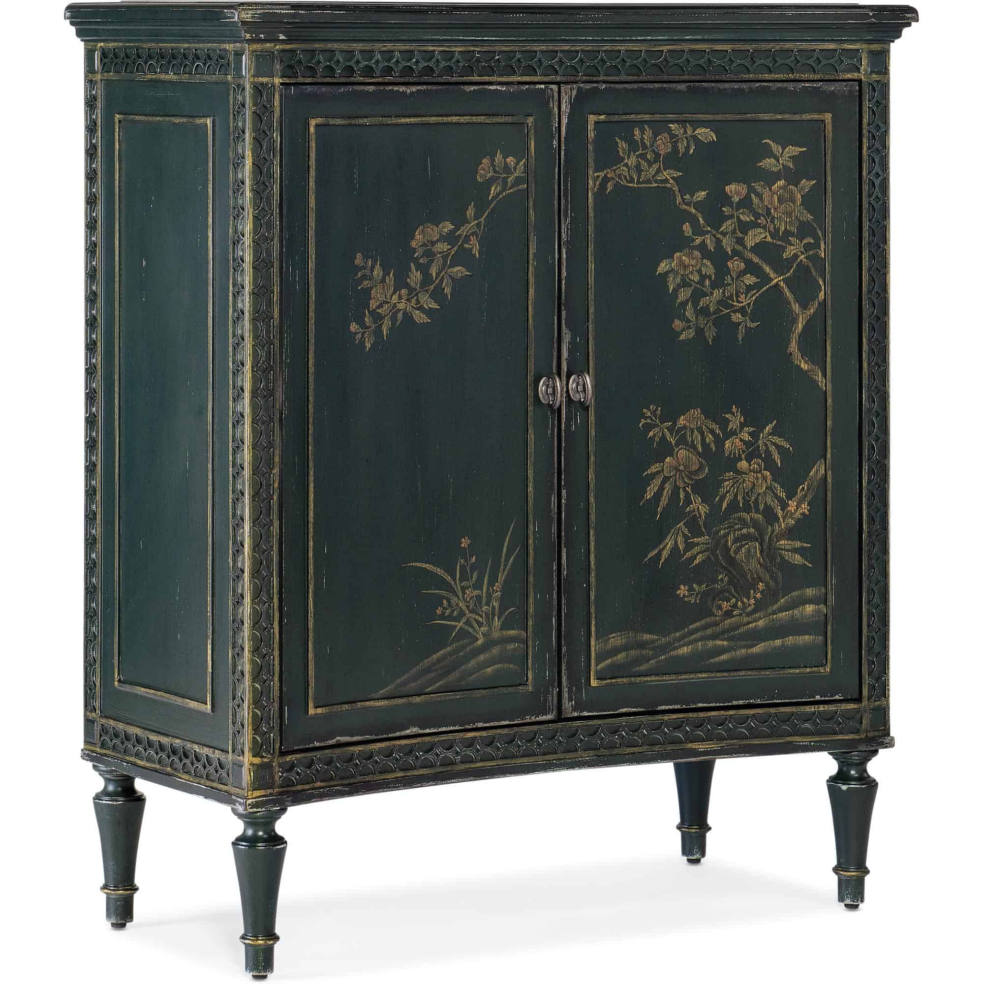 Finish: Charleston Green: A weathered interpretation of the classic dark (almost black) green that adorns trim, shutters and doors across all the historic district of Charleston. Embellished with regionally inspired hand painting and highlighting. Loop pulls features antique bronze color.