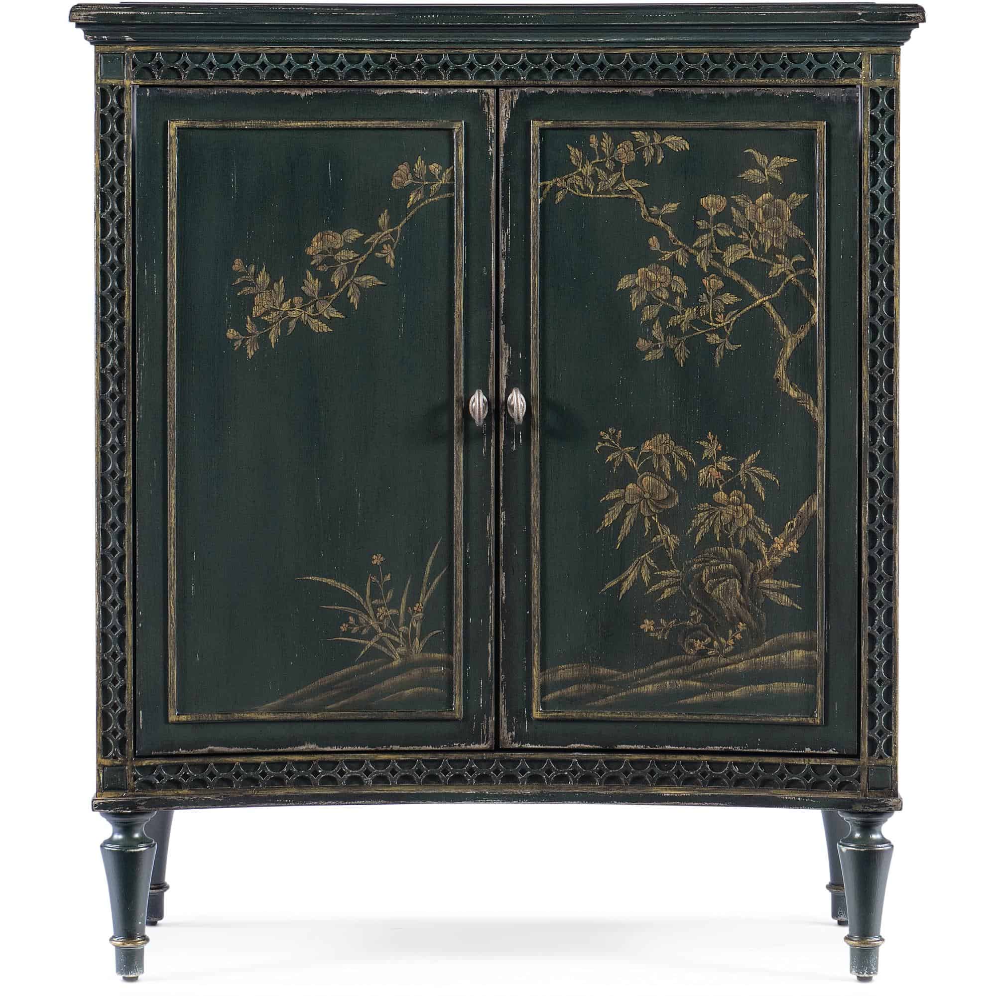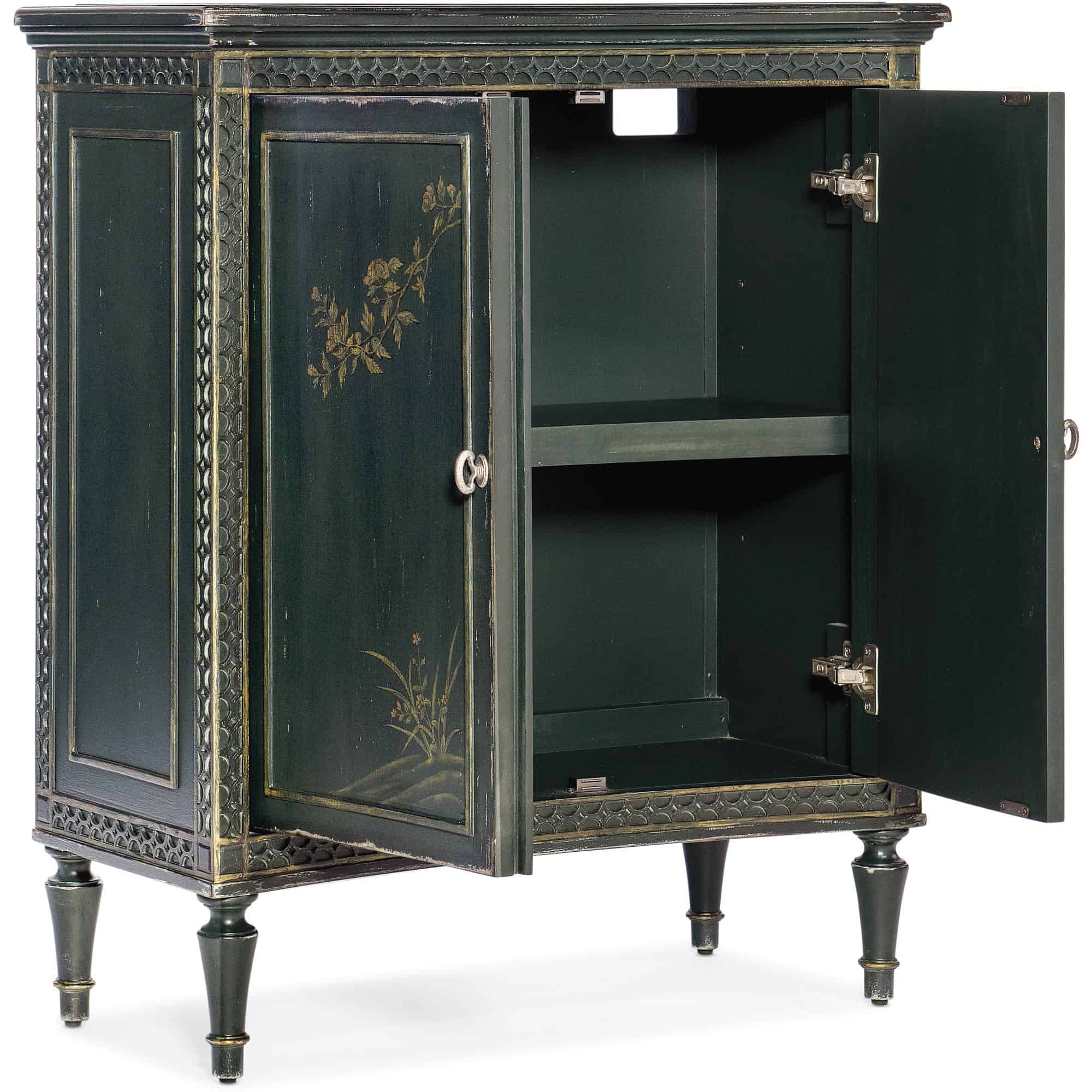 Features: Two doors with soft-close hinges and magnetic door catches One adjustable shelf behind doors Levelers Concave shape Decorative fretwork accents along edges Handpainted door fronts