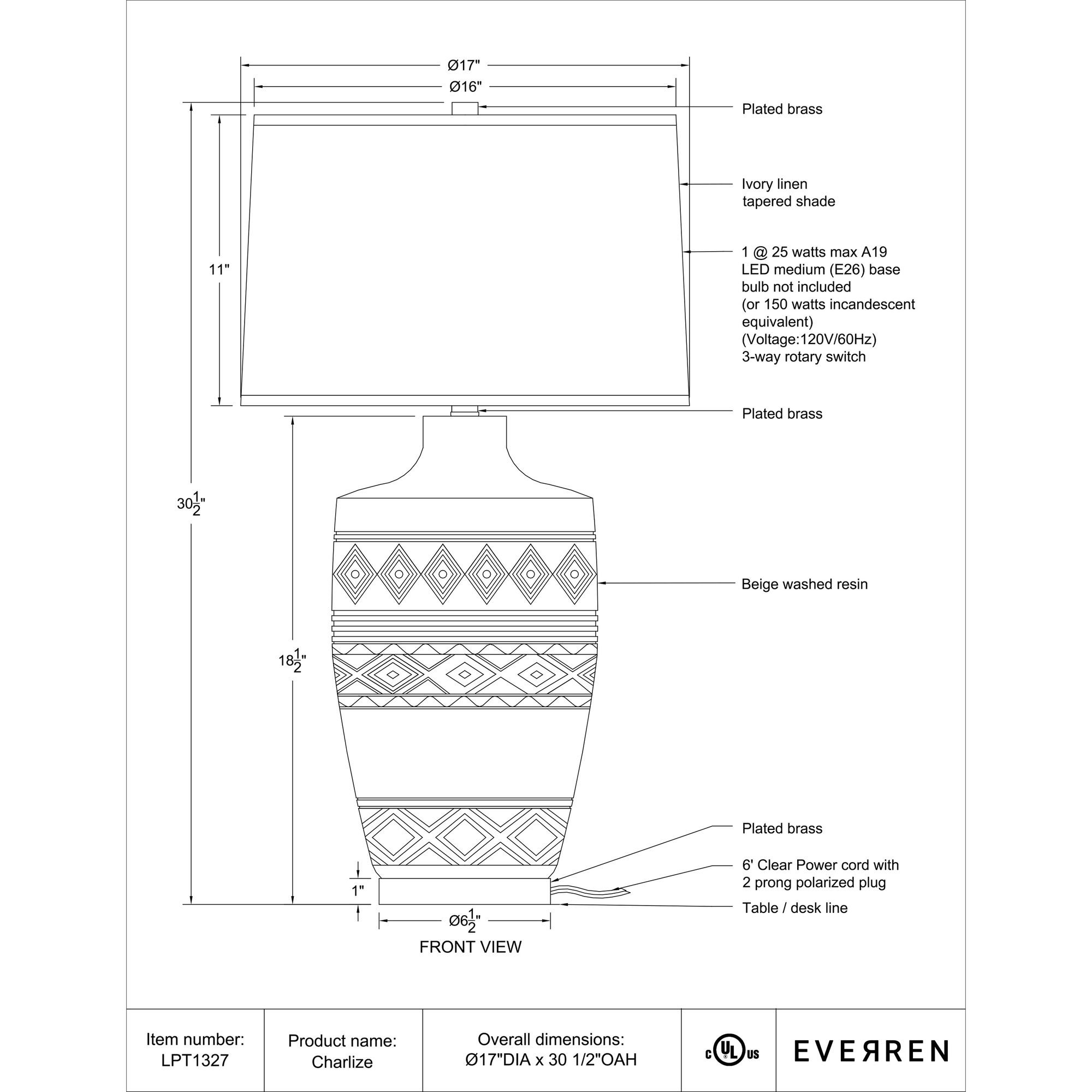 Create an eye-catching focal point in any decorating scheme with the Charlize table lamp. Featuring a beige-washed body patterned with a striking geometric motif, brushed brass-plated accents, and topped with a classic oatmeal linen drum shade, this lamp is a prime example of what happens when style meets function. Setting the ambiance in a bedroom, dining room, or living room is easy with this light’s 3-way switch that adjusts the lighting to suit any mood.