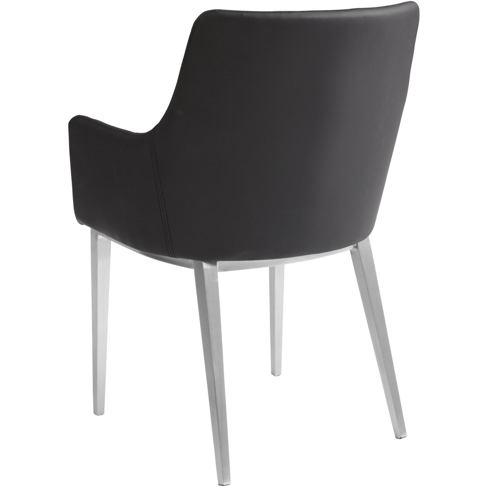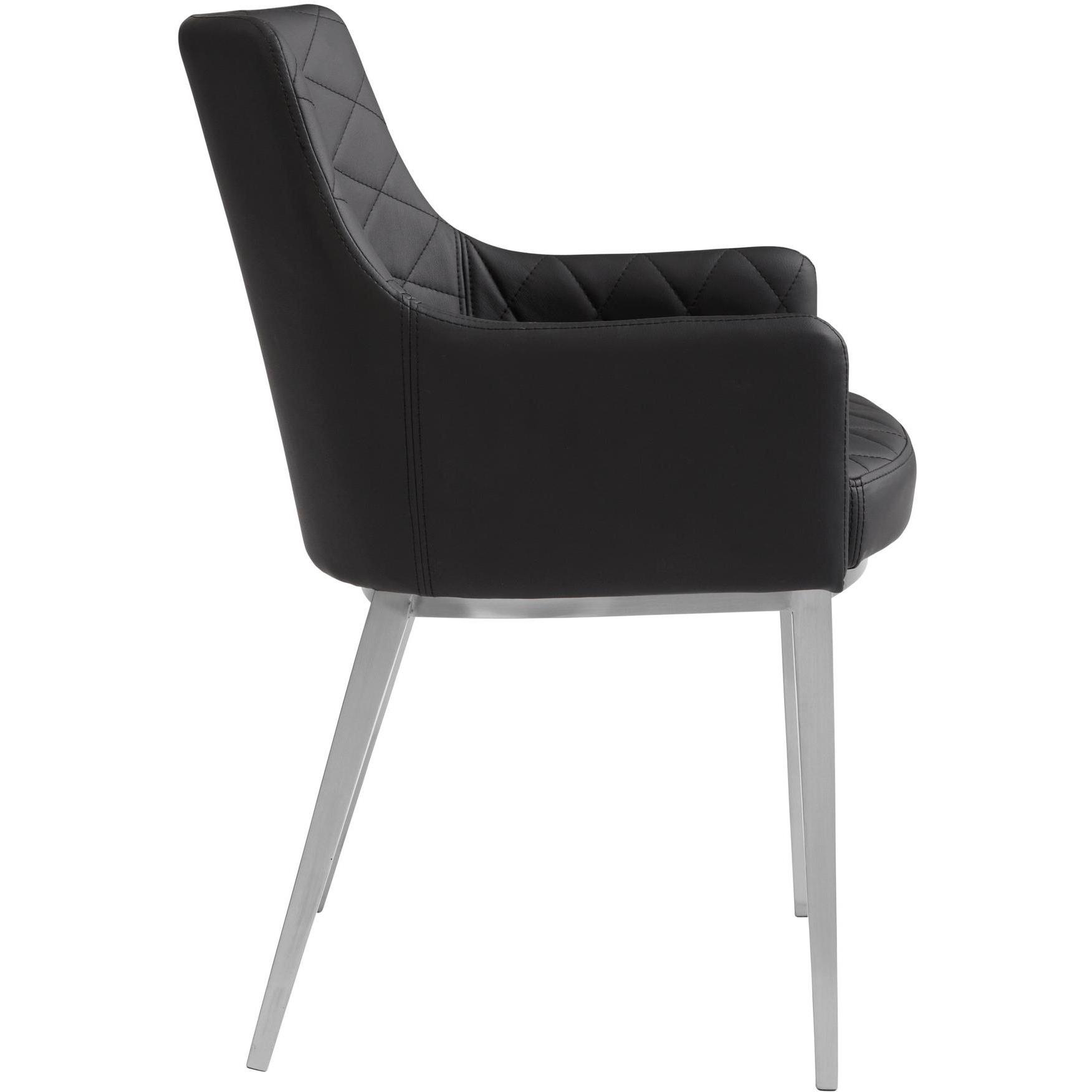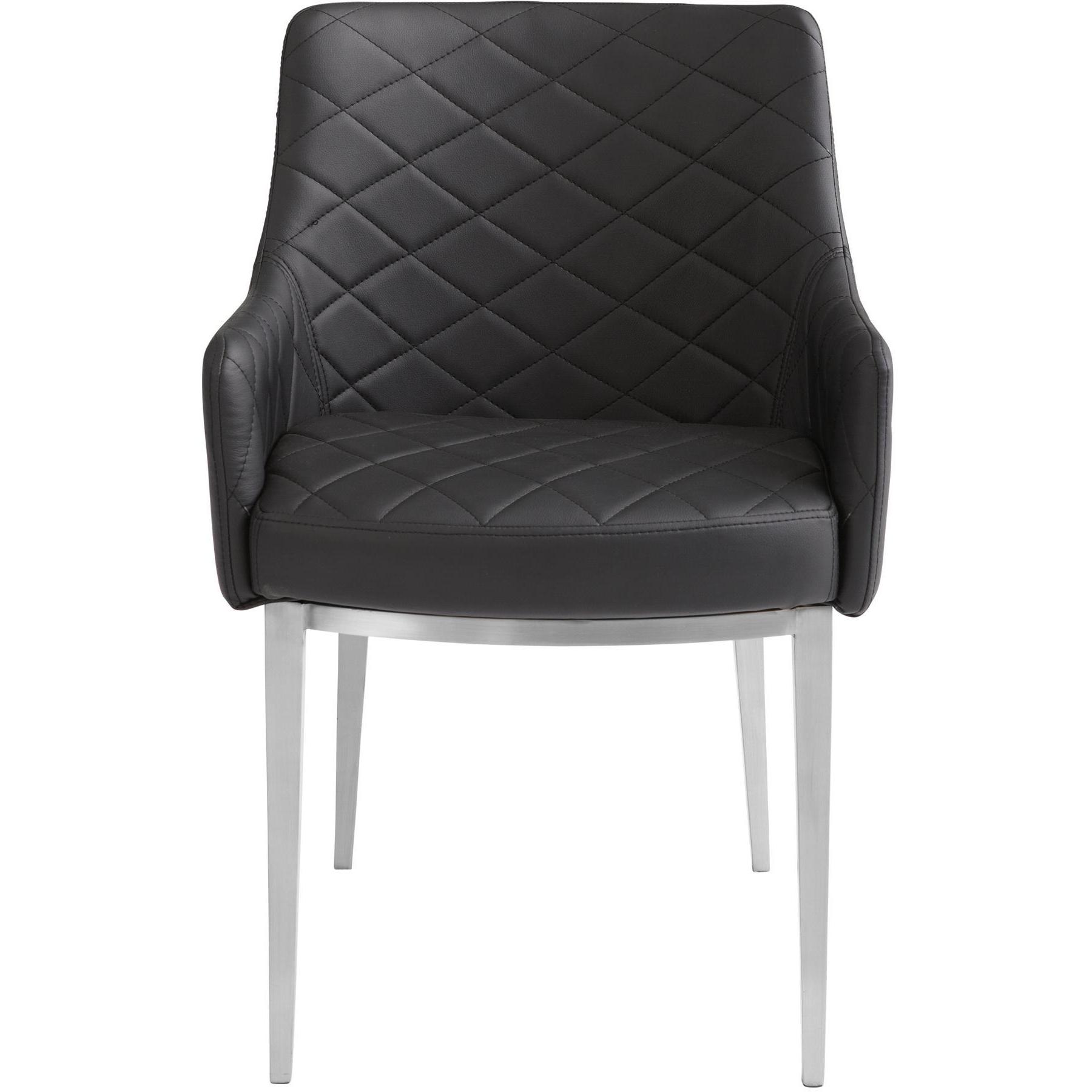 This sleek and classic dining armchair features brushed stainless steel legs with a diamond tufted seat and back. Stocked in black faux leather. Sits beautifully. Handle With Care: This design has been crafted with faux leather. Faux leather is manufactured to reflect the natural characteristics of leather; as such, colour variations, markings, wrinkles, grooves, and light scratches are appreciated characteristics. No two pieces will be alike. Visit our Product Care page for more information on how to ensure the lasting beauty of this piece.