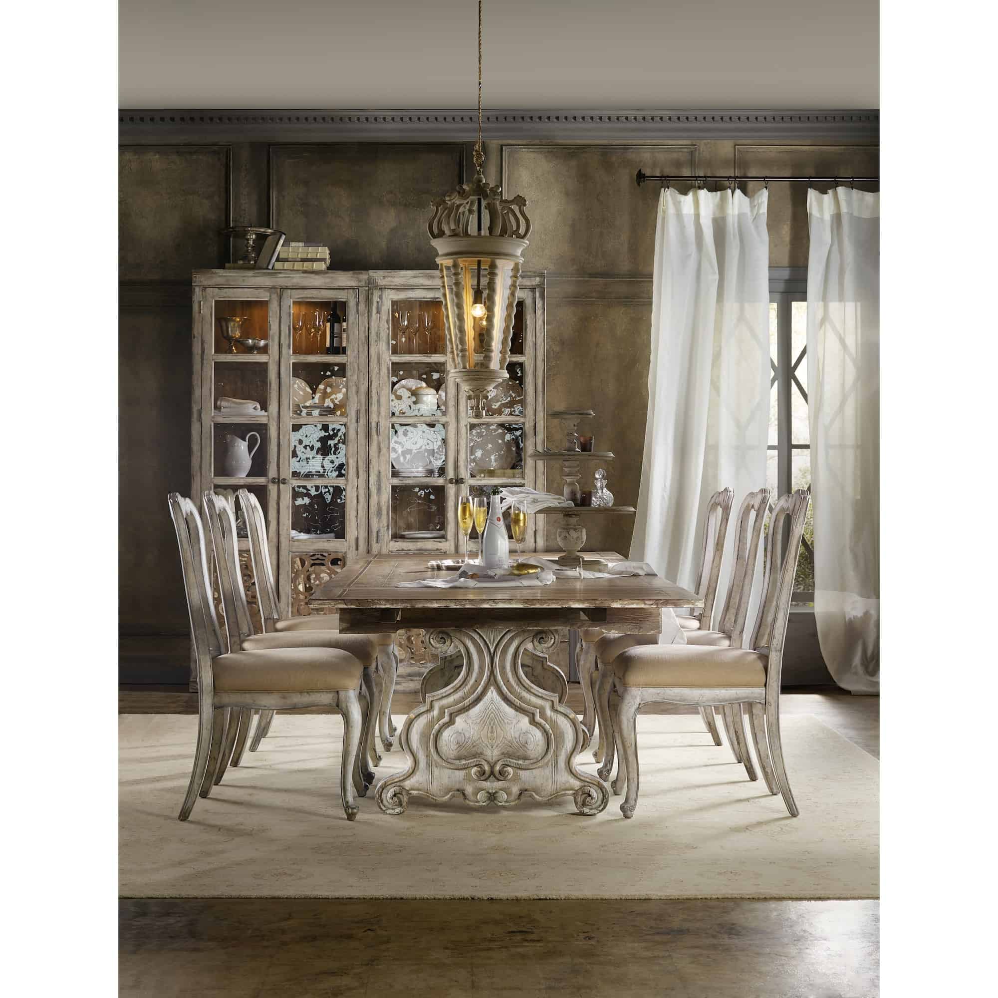 Finish: A combination of Caramel Froth and Paris Vintage. Pecky pecan veneers are warmed by a soft amber color and a touch of aged white paint to highlight distinctive grains and moldings in the Caramel Froth finish. The Paris Vintage finish is a distressed vintage white with fretwork overlay on select pieces. Custom-designed, generously scaled, burnished bronze drawer pulls and hardware is inspired by antiques. Distressing includes scraping lines, sloping lines and rasping.