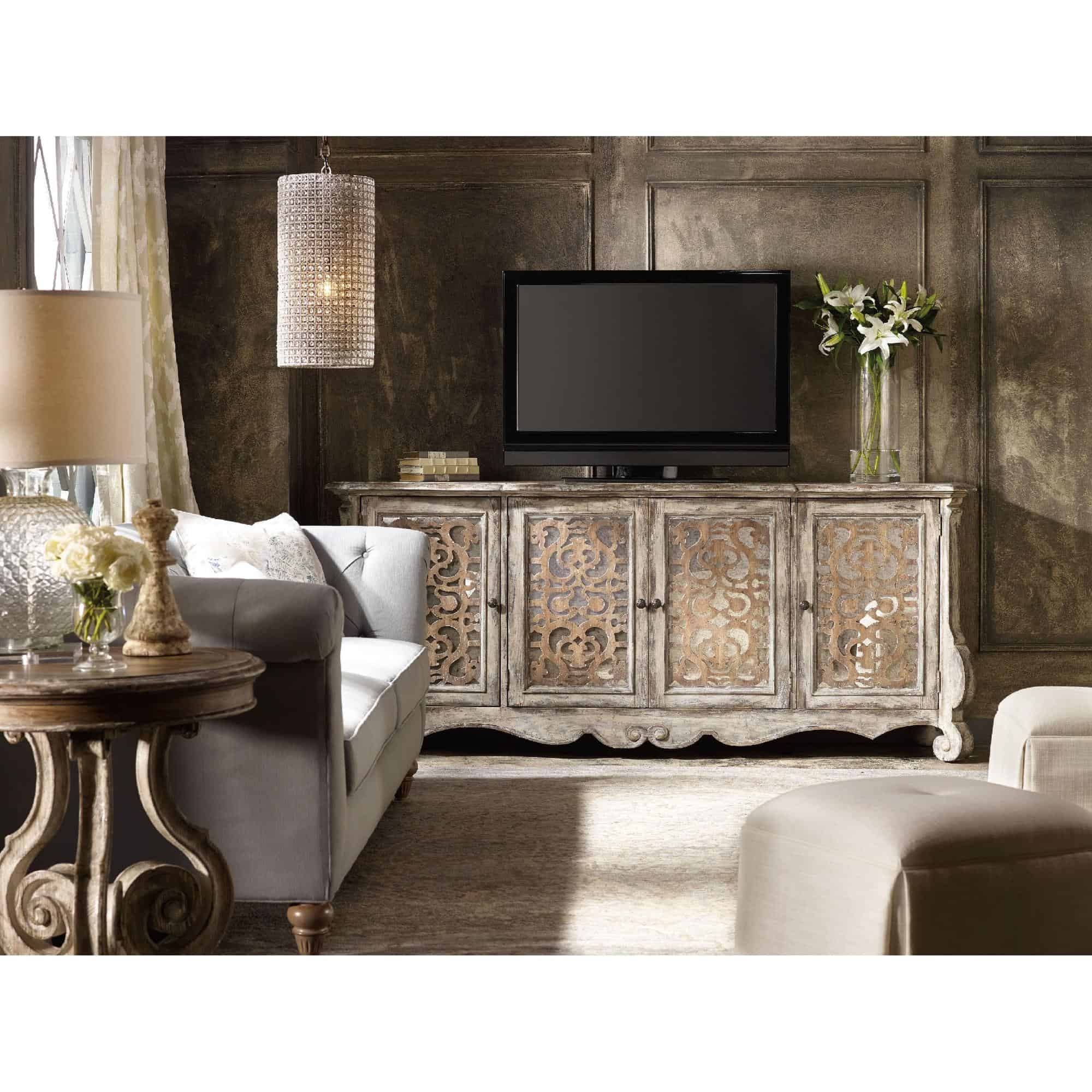 Finish: A combination of Caramel Froth and Paris Vintage. Pecky pecan veneers are warmed by a soft amber color and a touch of aged white paint to highlight distinctive grains and moldings in the Caramel Froth finish. The Paris Vintage finish is a distressed vintage white with fretwork overlay on select pieces. Custom-designed, generously scaled, burnished bronze drawer pulls and hardware is inspired by antiques. Distressing includes scraping lines, sloping lines and rasping.