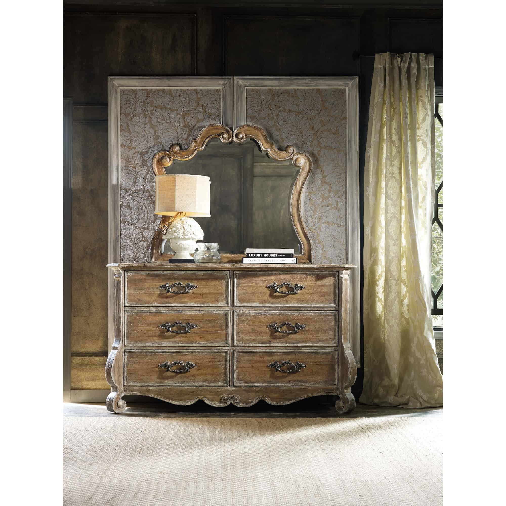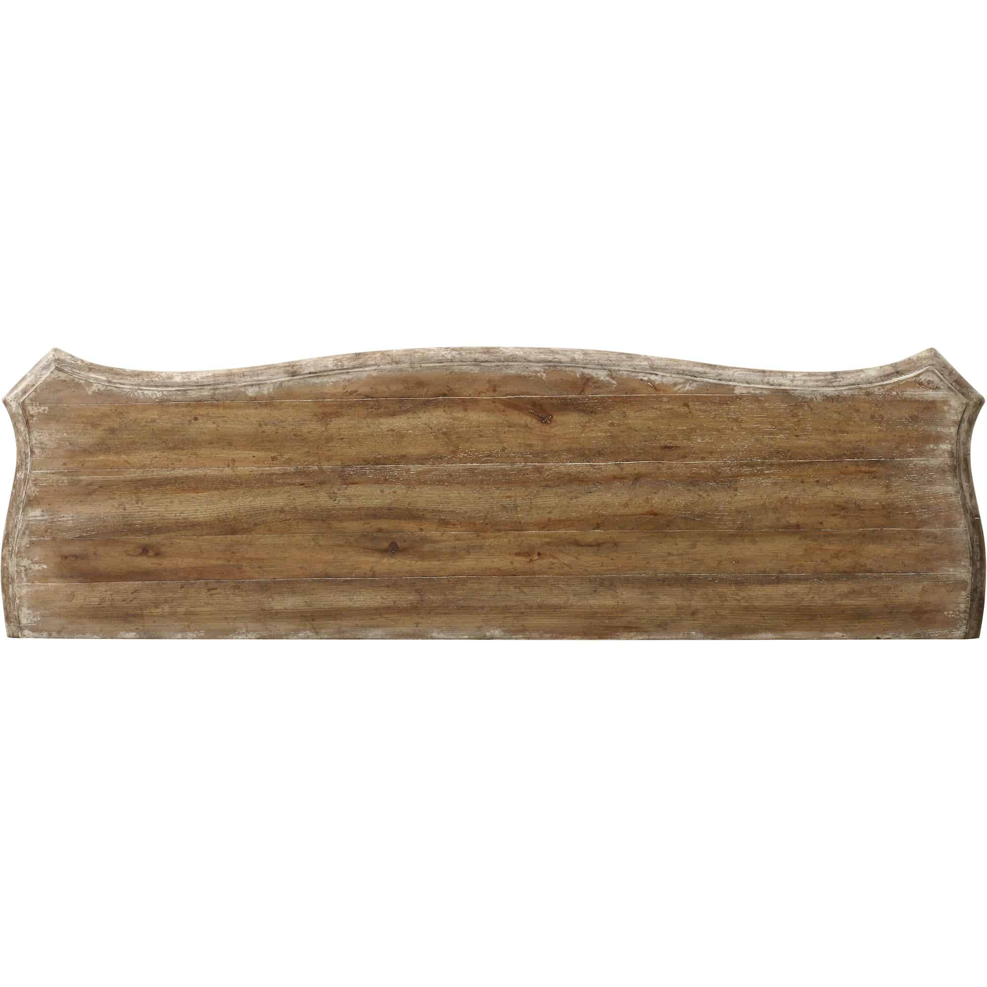 Finish: Pecky pecan veneers are warmed by a soft amber color and a touch of aged white paint to highlight distinctive grains and moldings in the Caramel Froth finish. Custom-designed, generously scaled burnished bronze drawer pulls and hardware is inspired by antiques. Distressing includes scraping lines, sloping lines, rasping and worm holes.
