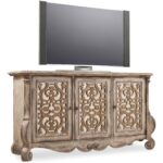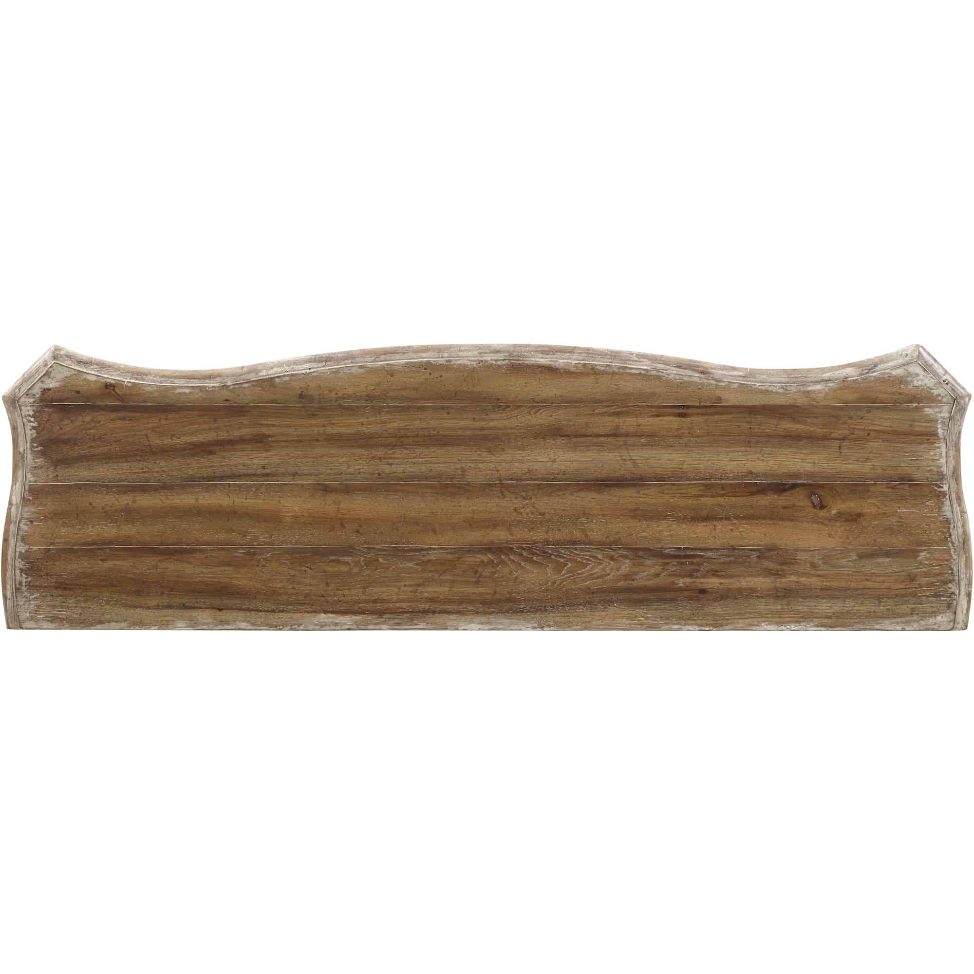 Finish: A combination of Caramel Froth and Paris Vintage. Pecky pecan veneers are warmed by a soft amber color and a touch of aged white paint to highlight distinctive grains and moldings in the Caramel Froth finish. The Paris Vintage finish is a distressed vintage white with fretwork overlay on select pieces. Custom-designed, generously scaled, burnished bronze drawer pulls and hardware is inspired by antiques. Distressing includes scraping lines, sloping lines and rasping.
