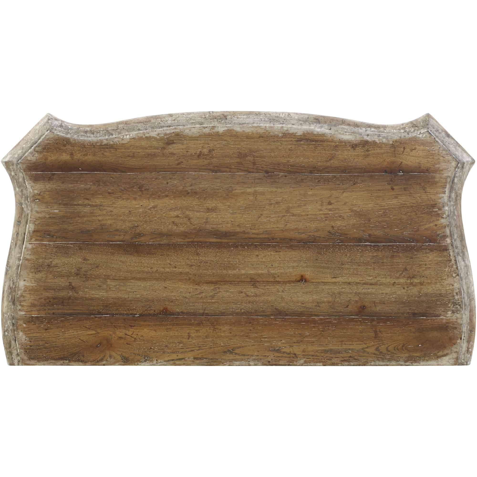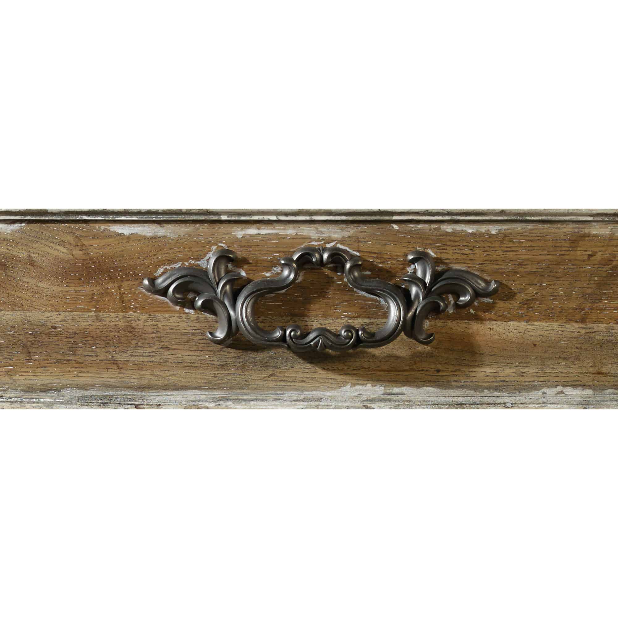 Finish: Pecky pecan veneers are warmed by a soft amber color and a touch of aged white paint to highlight distinctive grains and moldings in the Caramel Froth finish. Custom-designed, generously scaled burnished bronze drawer pulls and hardware is inspired by antiques. Distressing includes scraping lines, sloping lines, rasping and worm holes.