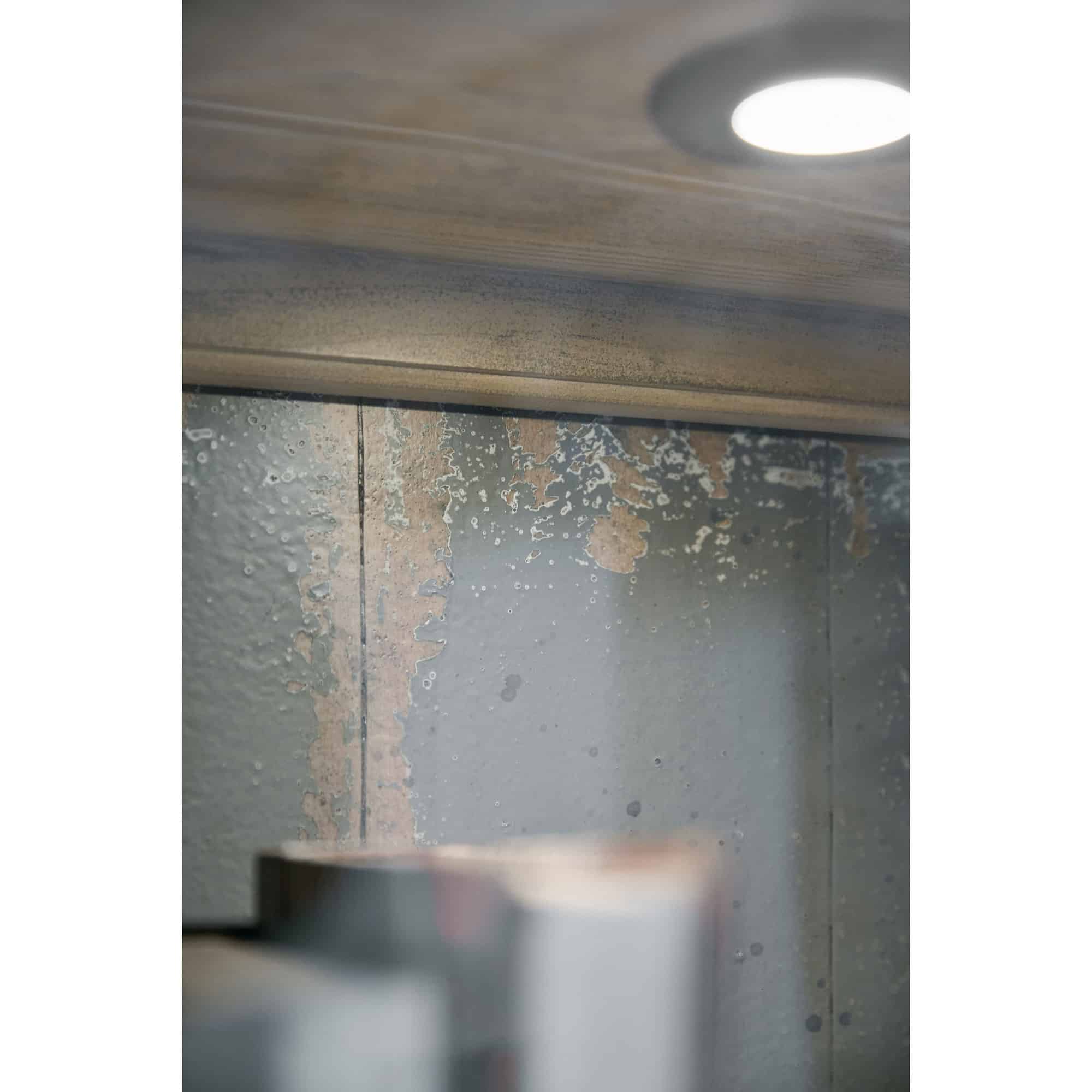 - Finish: Natural finish with distressing including sand blasting, saw marks, hand chiseling, cow tailing, and water marks. Burnished brass hardware.