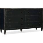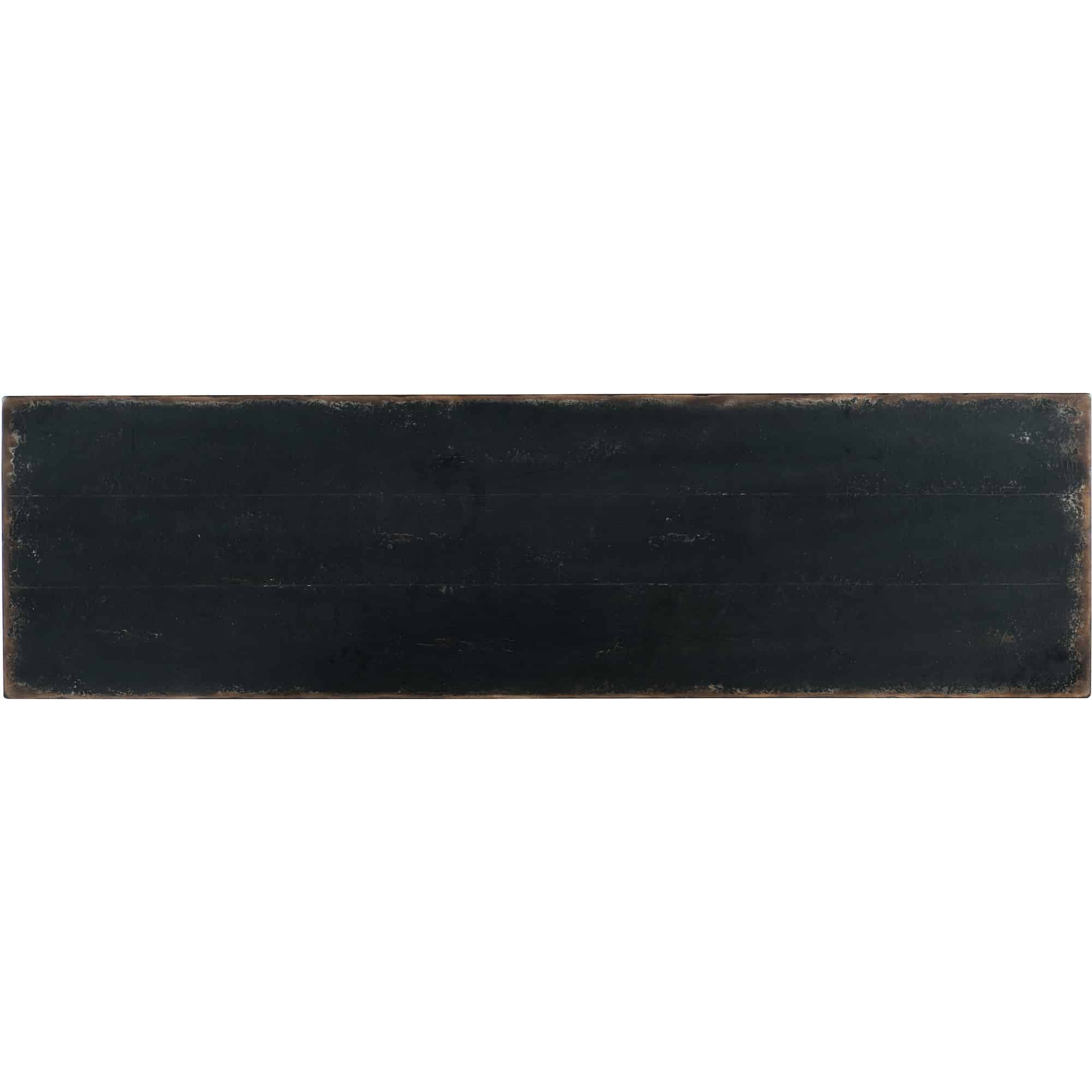 Finish: Black finish. Distressing includes worm holes, rasping, multi-layer rub through and emolsion. Burnished brass hardware.