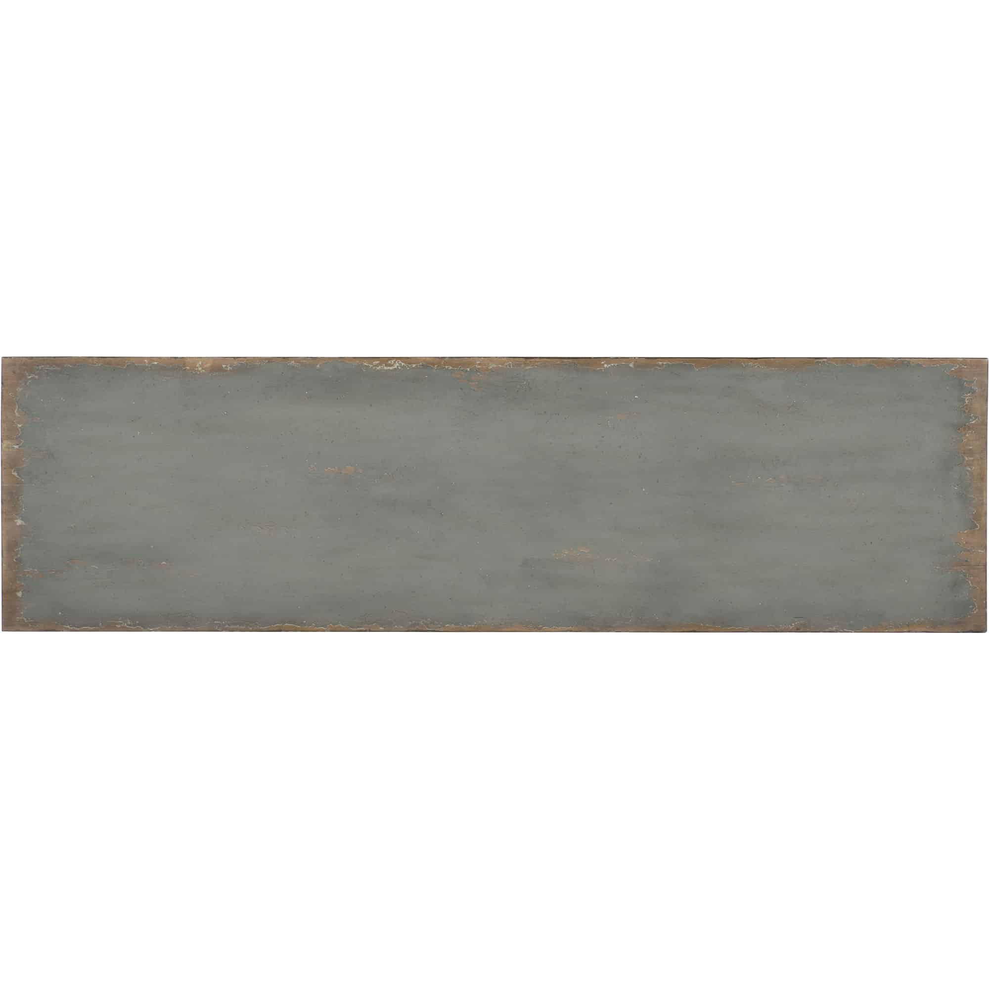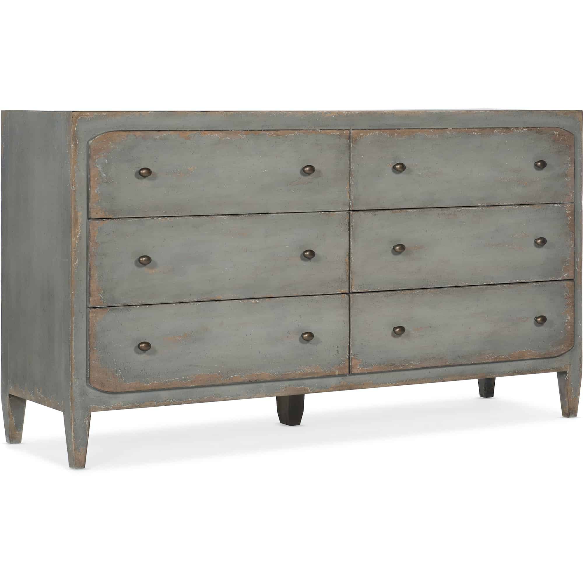 Finish: Time Worn gray finish with distressing including rasping, emolsion, multi-layer rub-through, spatter, water marks and cow tailing. Burnished brass hardware.
