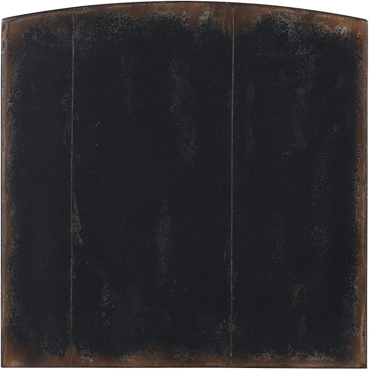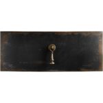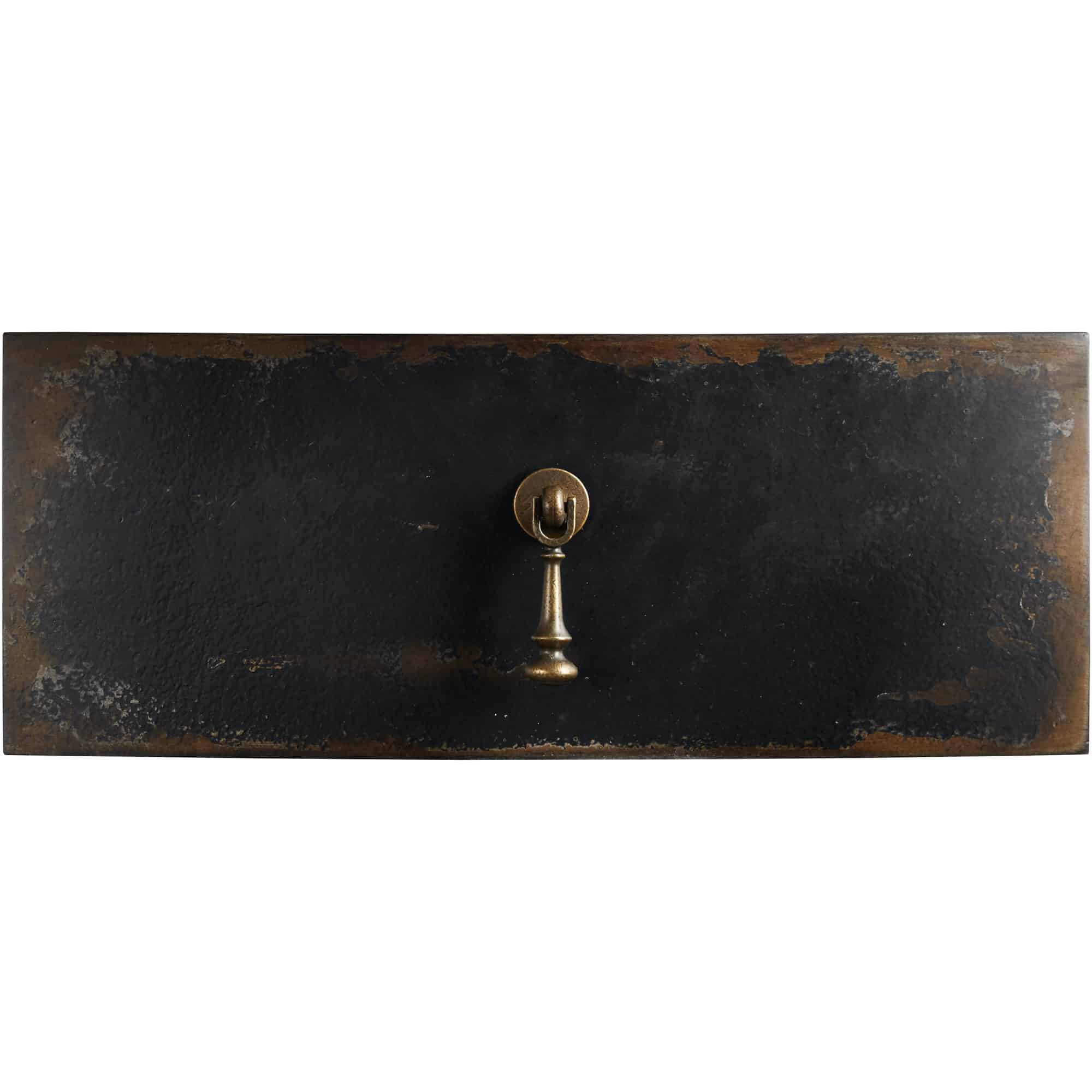- Finish: Black finish. Distressing includes worm holes, rasping, multi-layer rub through and emolsion. Burnished brass hardware.