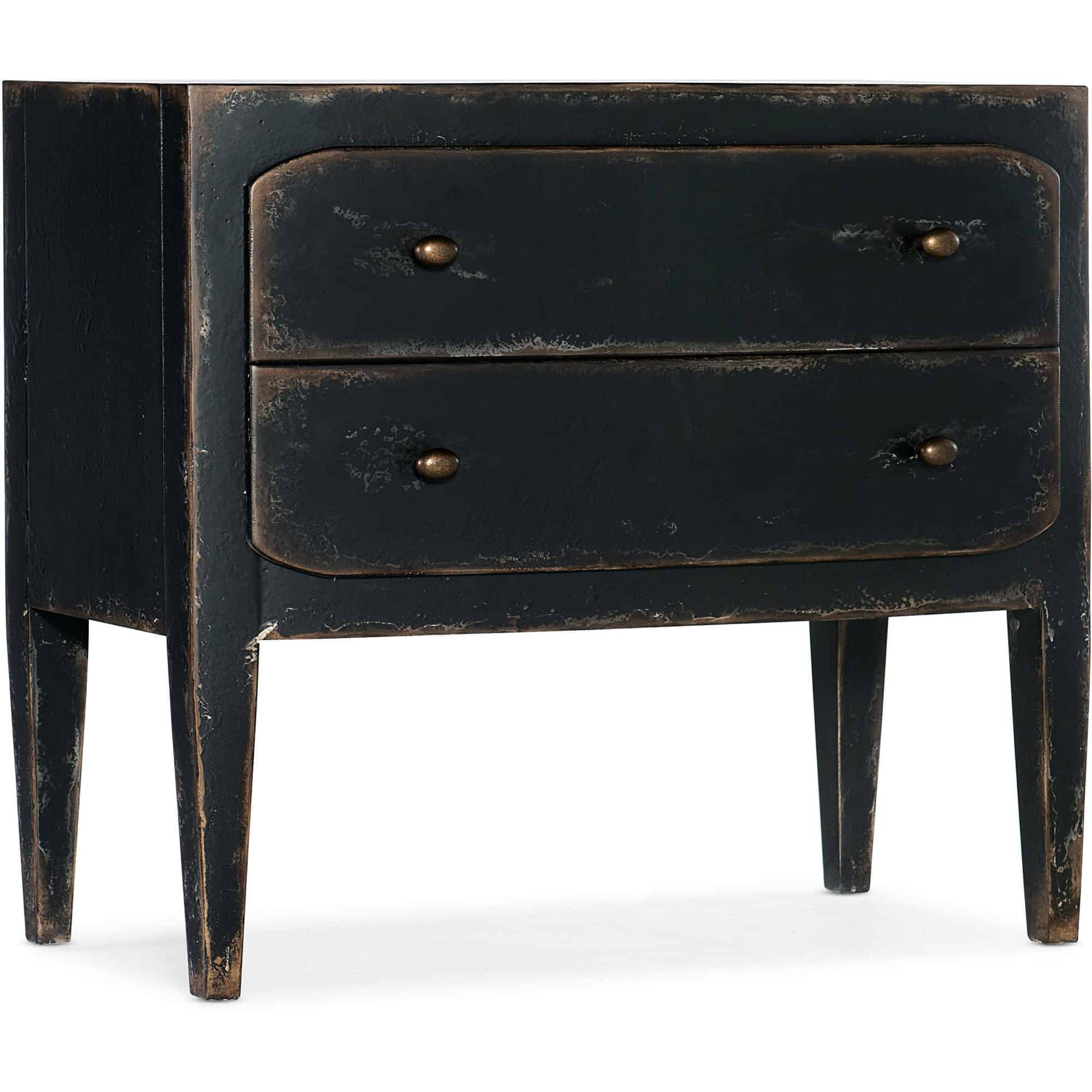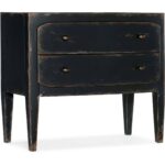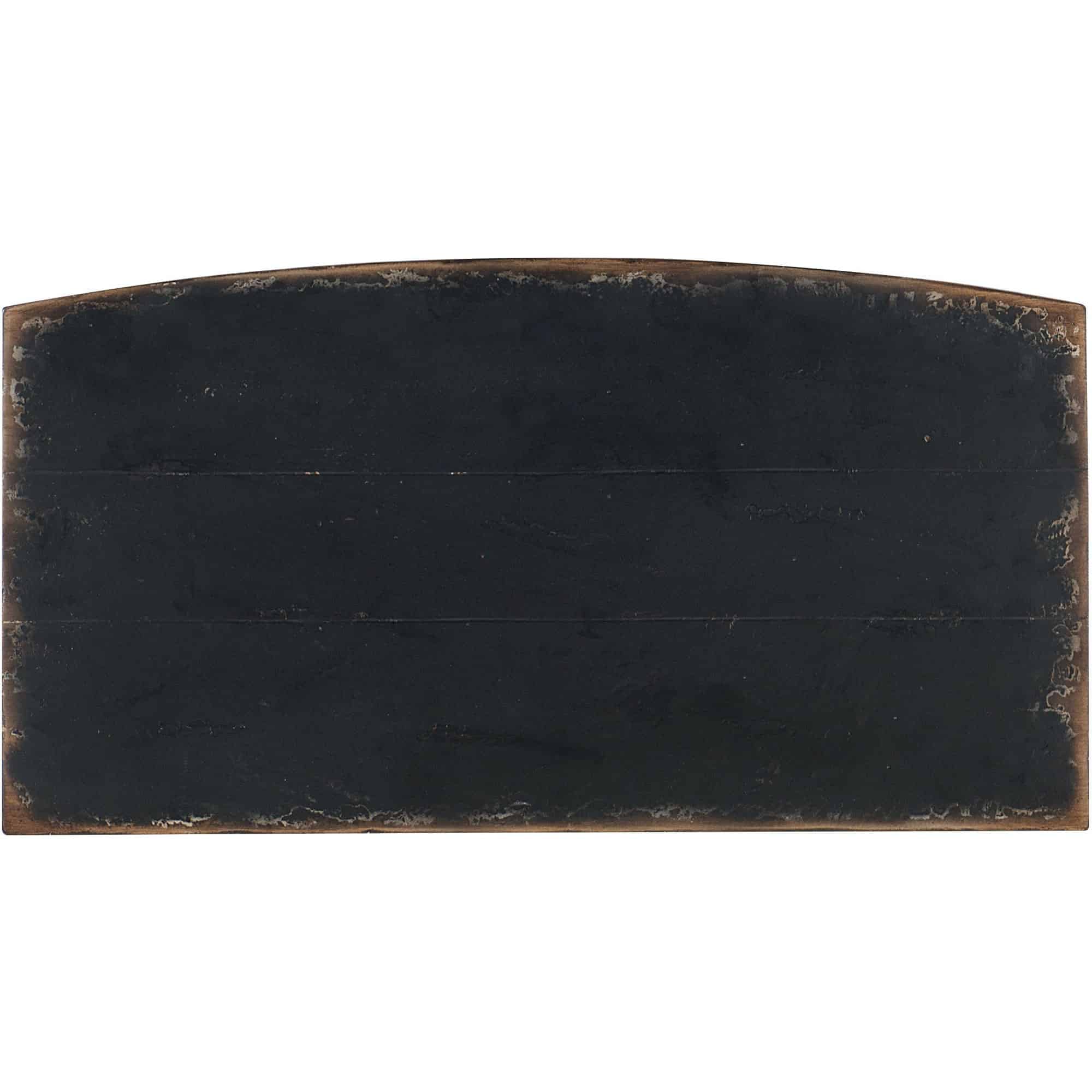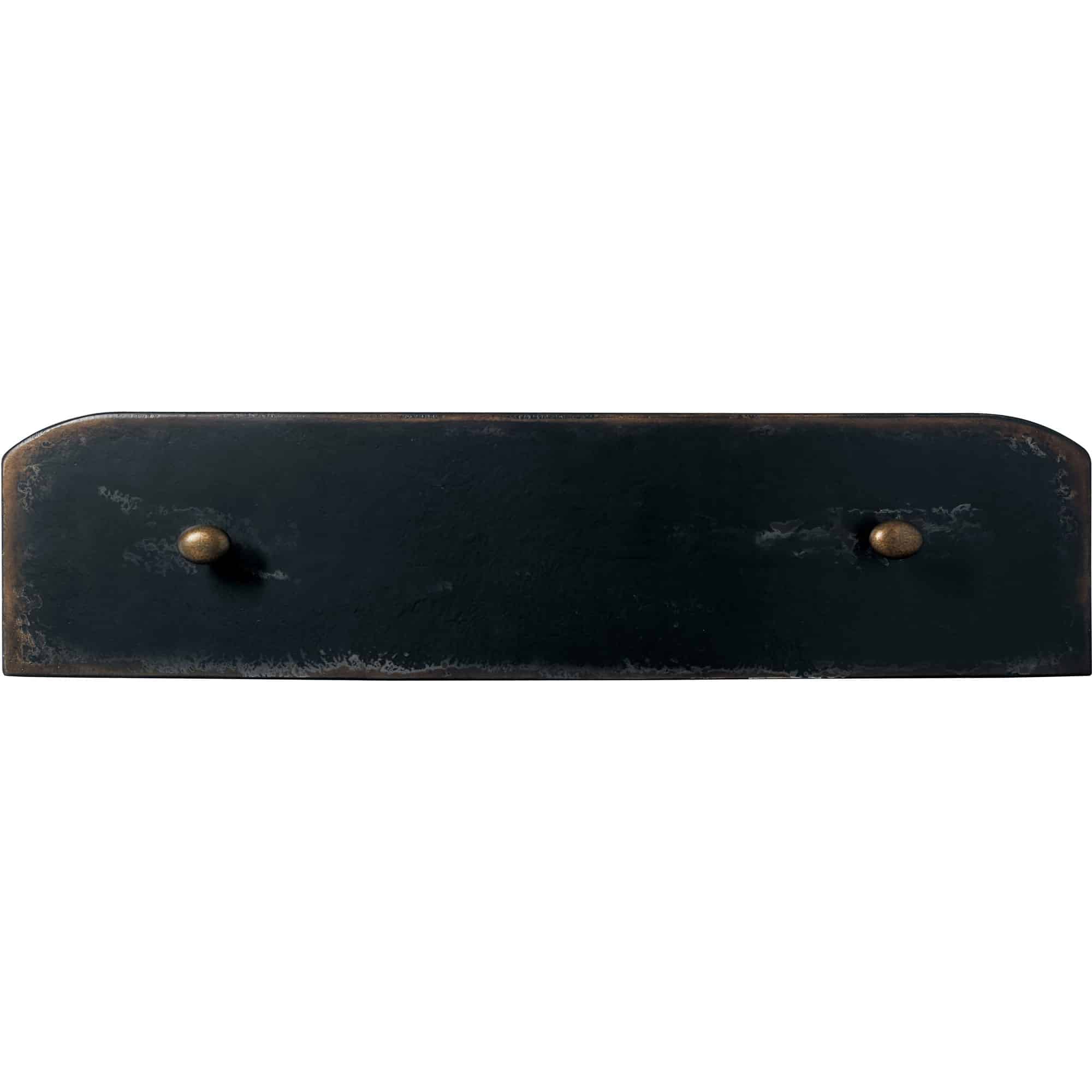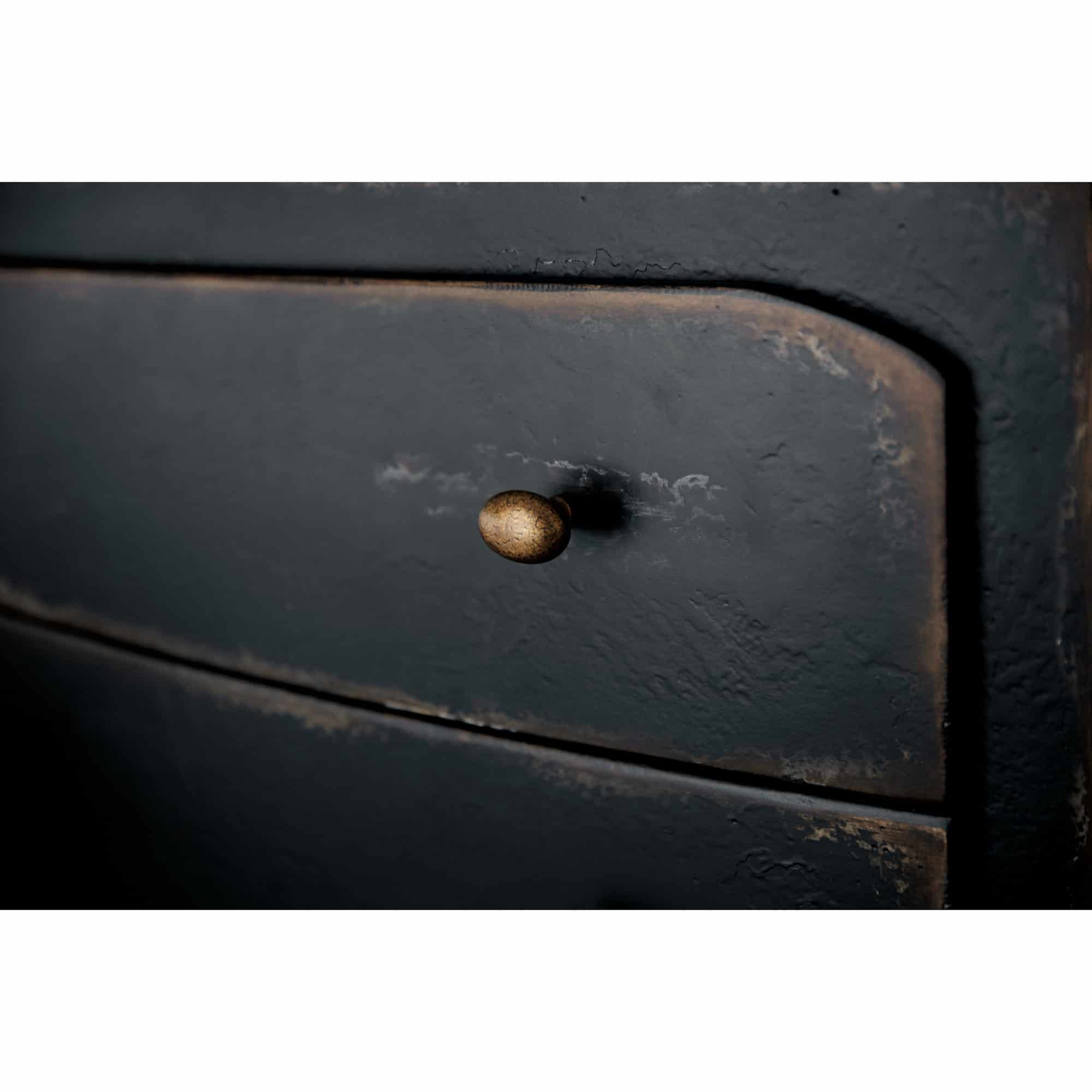 - Finish: Black finish. Distressing includes worm holes, rasping, multi-layer rub through and emolsion. Burnished brass hardware.