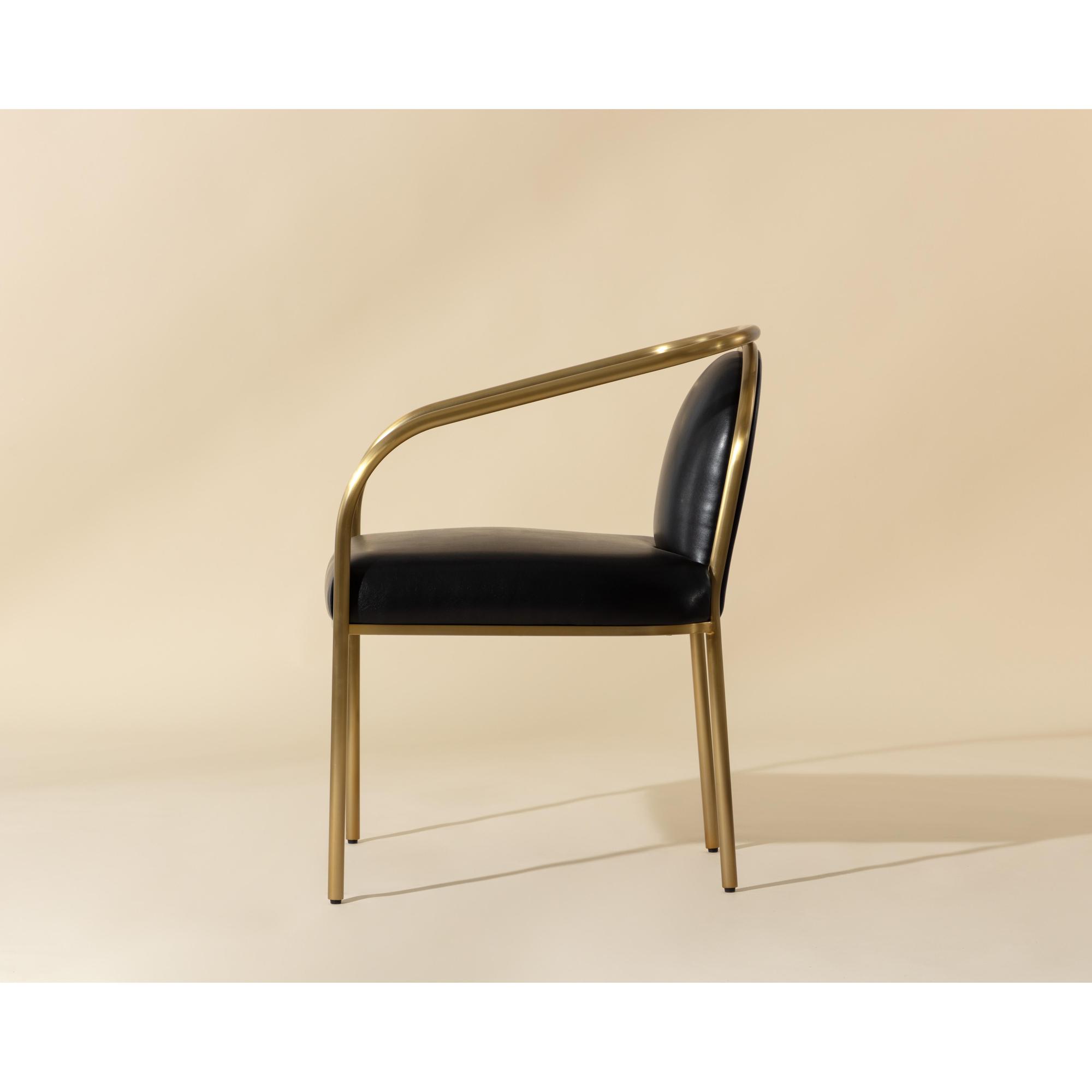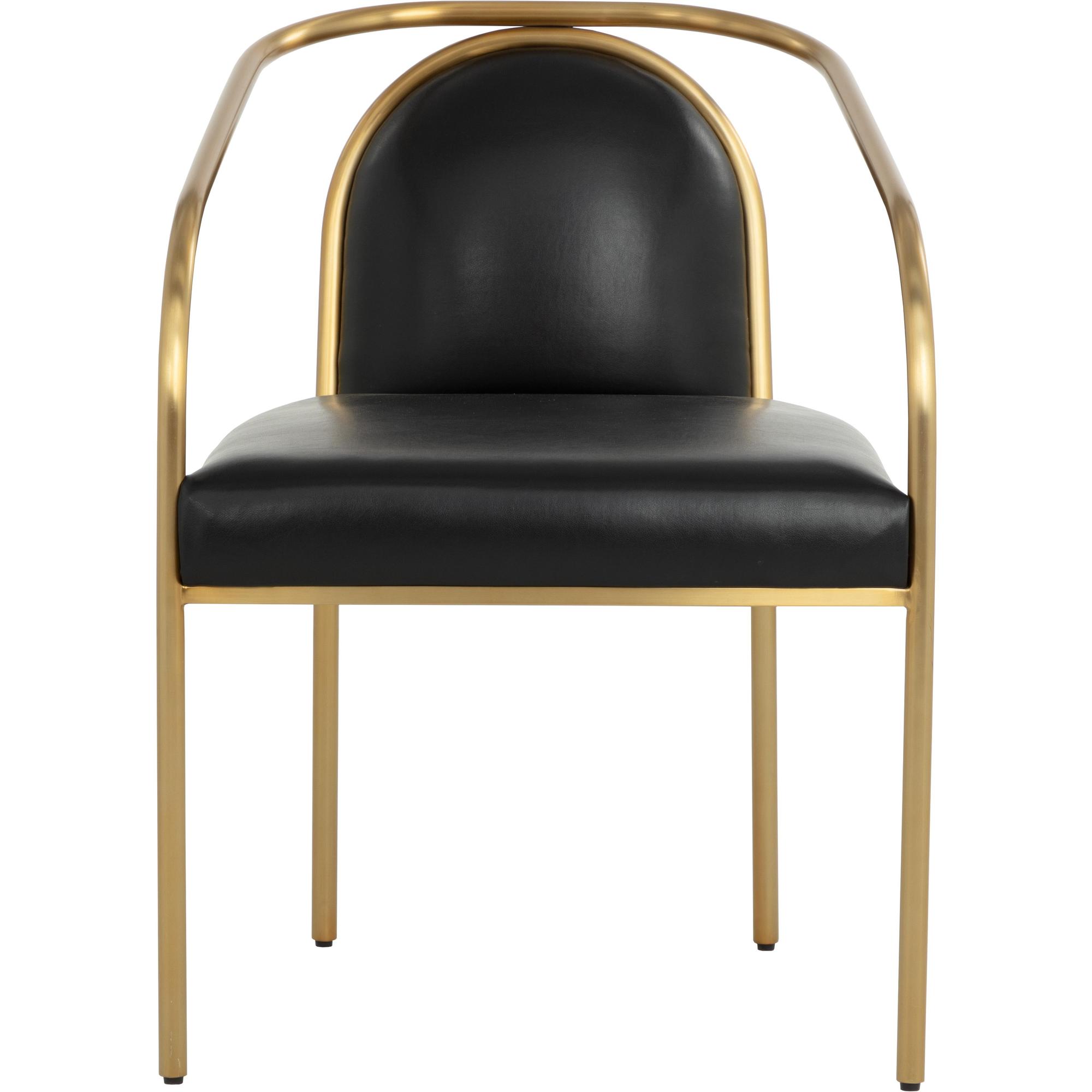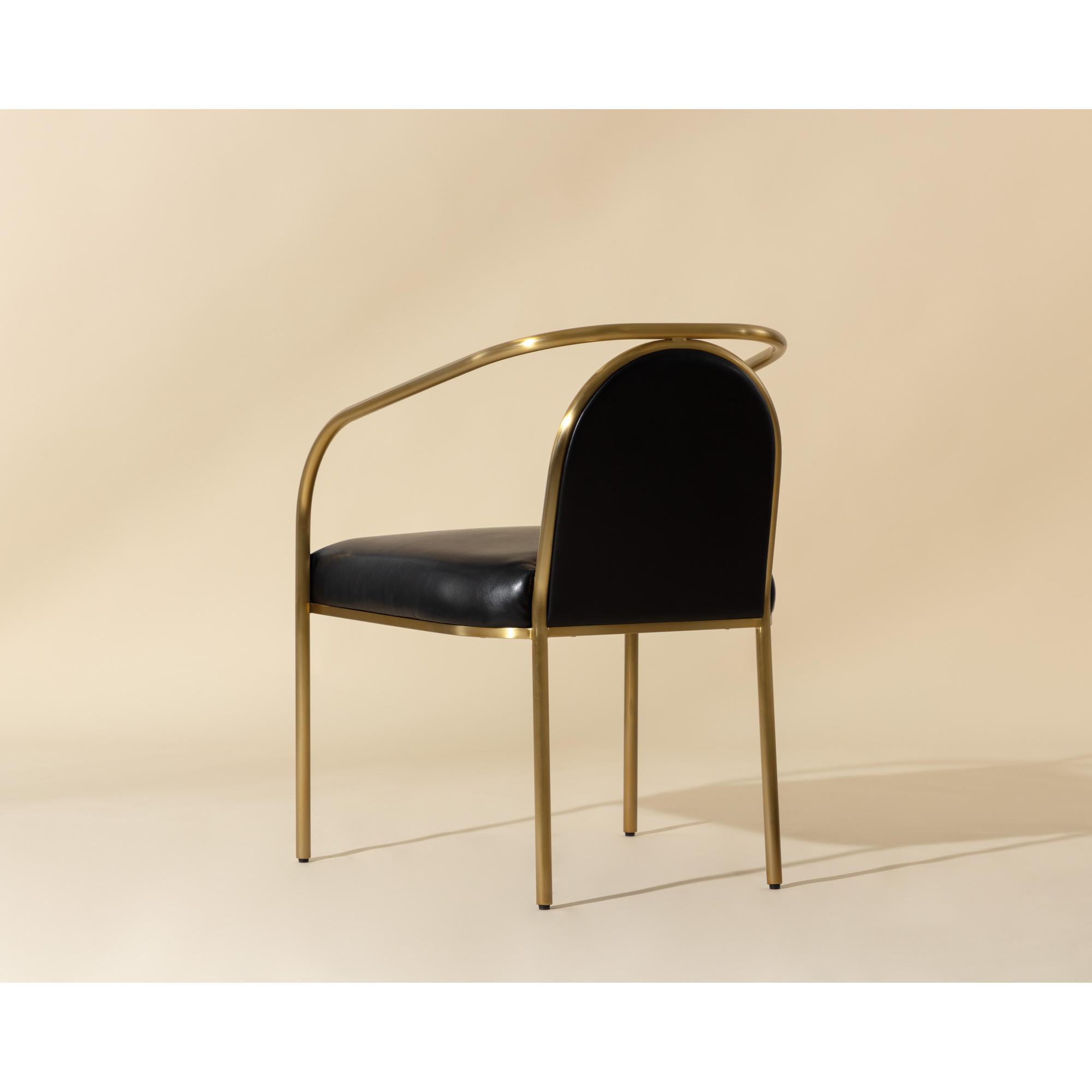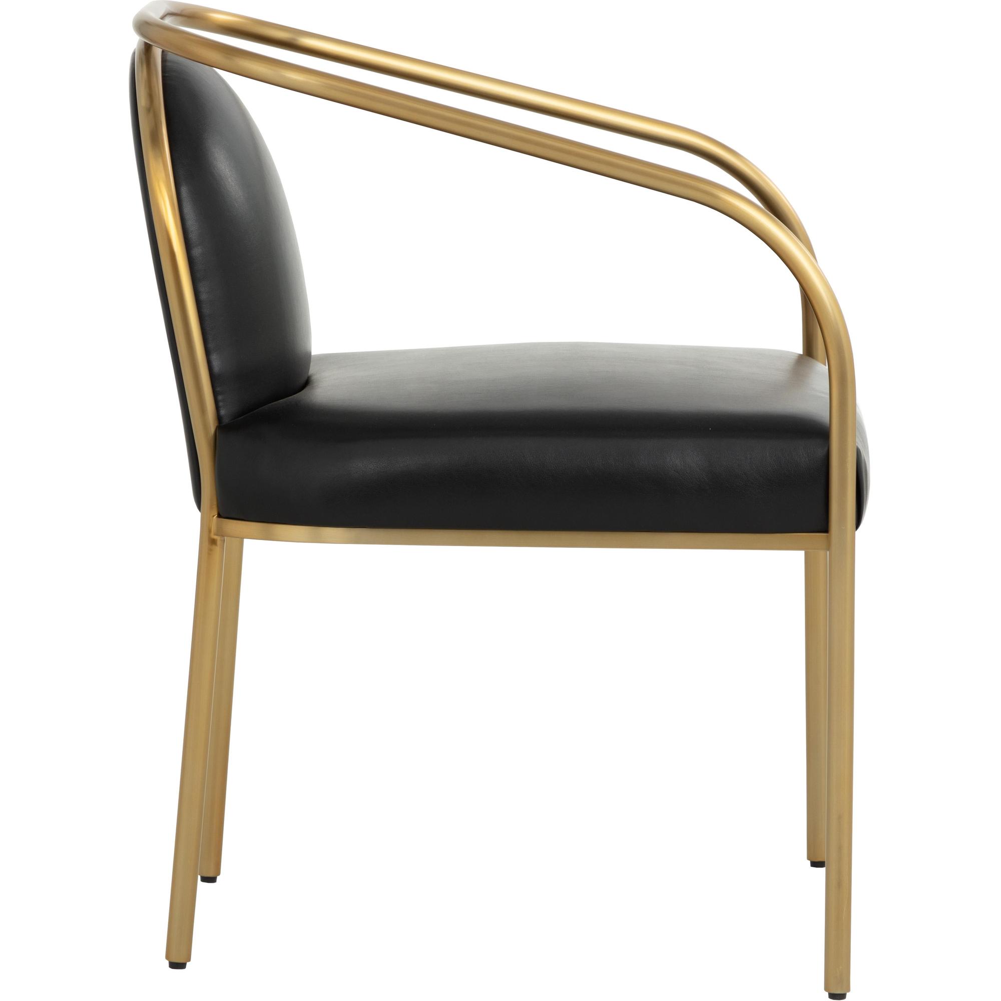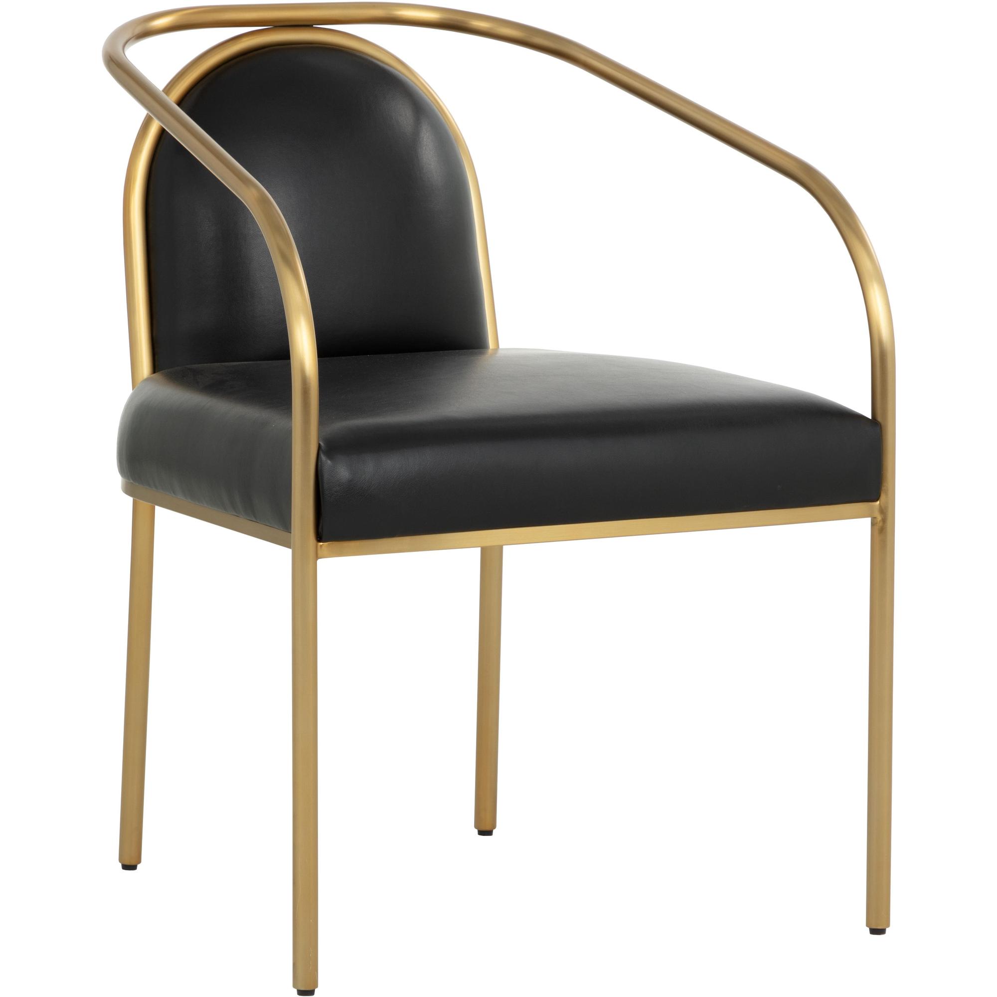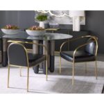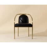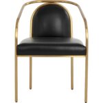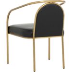 The Cicero Dining Armchair is a lesson in understated elegance. Sleek powder-coated gold stainless steel paired with the stunning dark tone of cantina black bonded leather creates a captivating look to elevate any dining space.