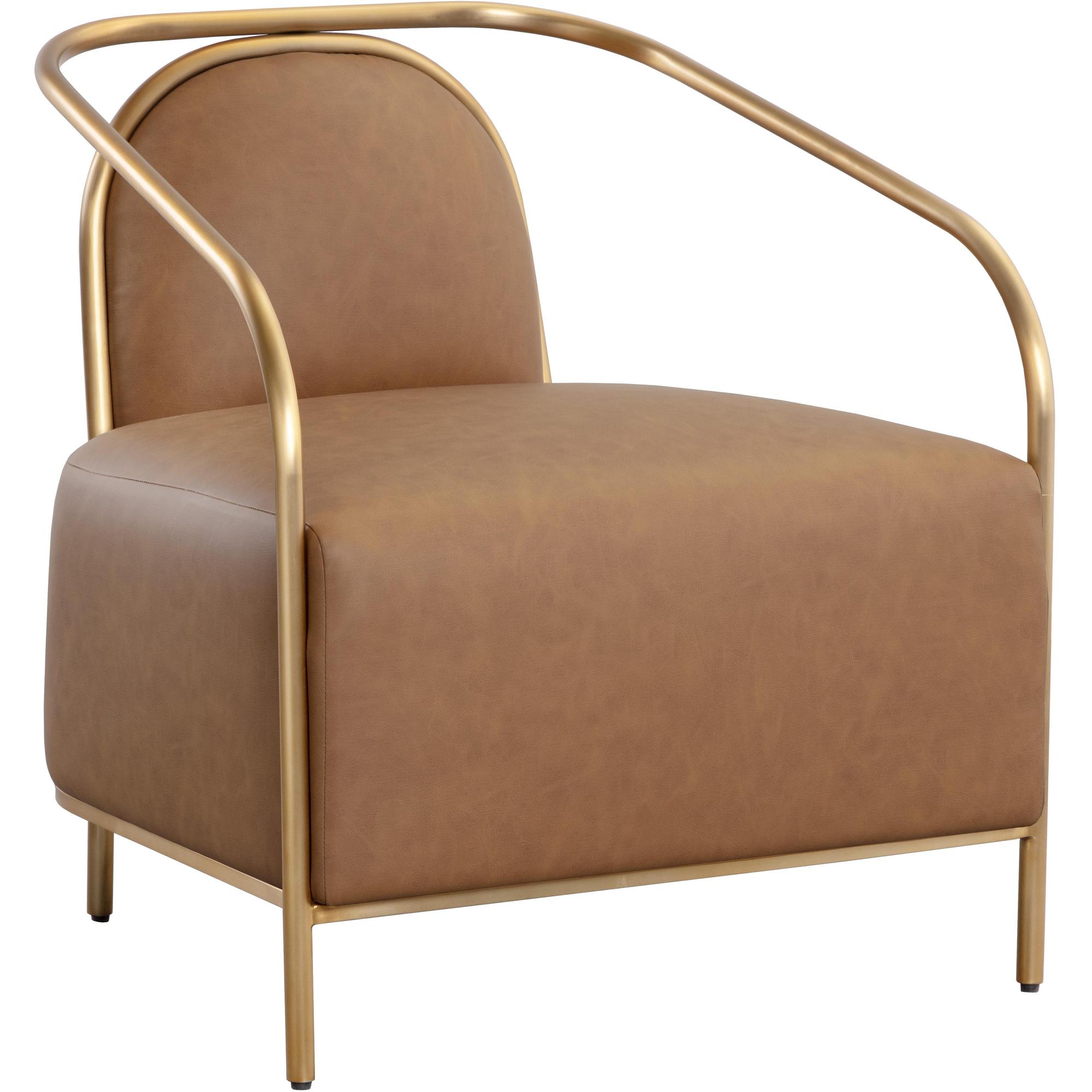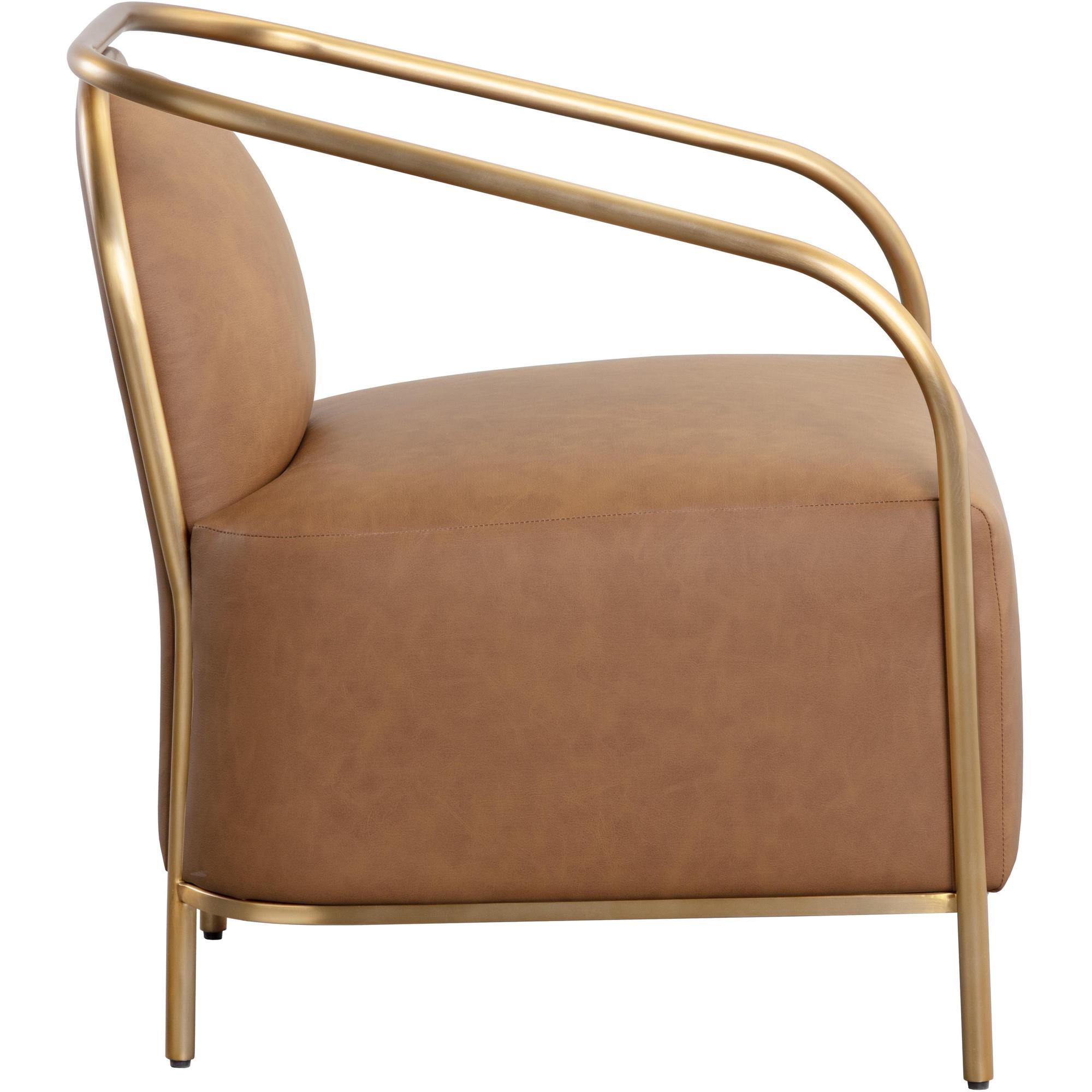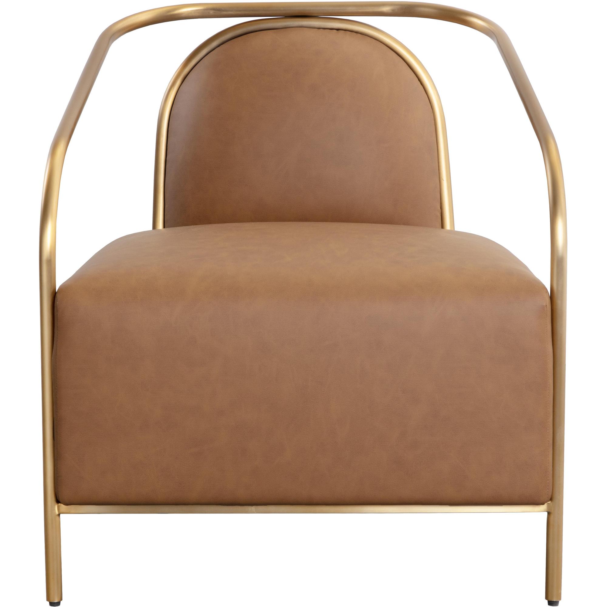 The Cicero Lounge Chair is a lesson in understated elegance. Sleek gold stainless steel paired with the warm brown tones of milliken cognac faux leather creates a captivating look to elevate any living space.