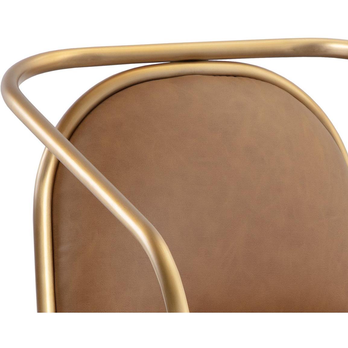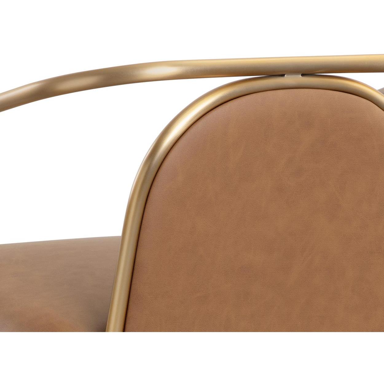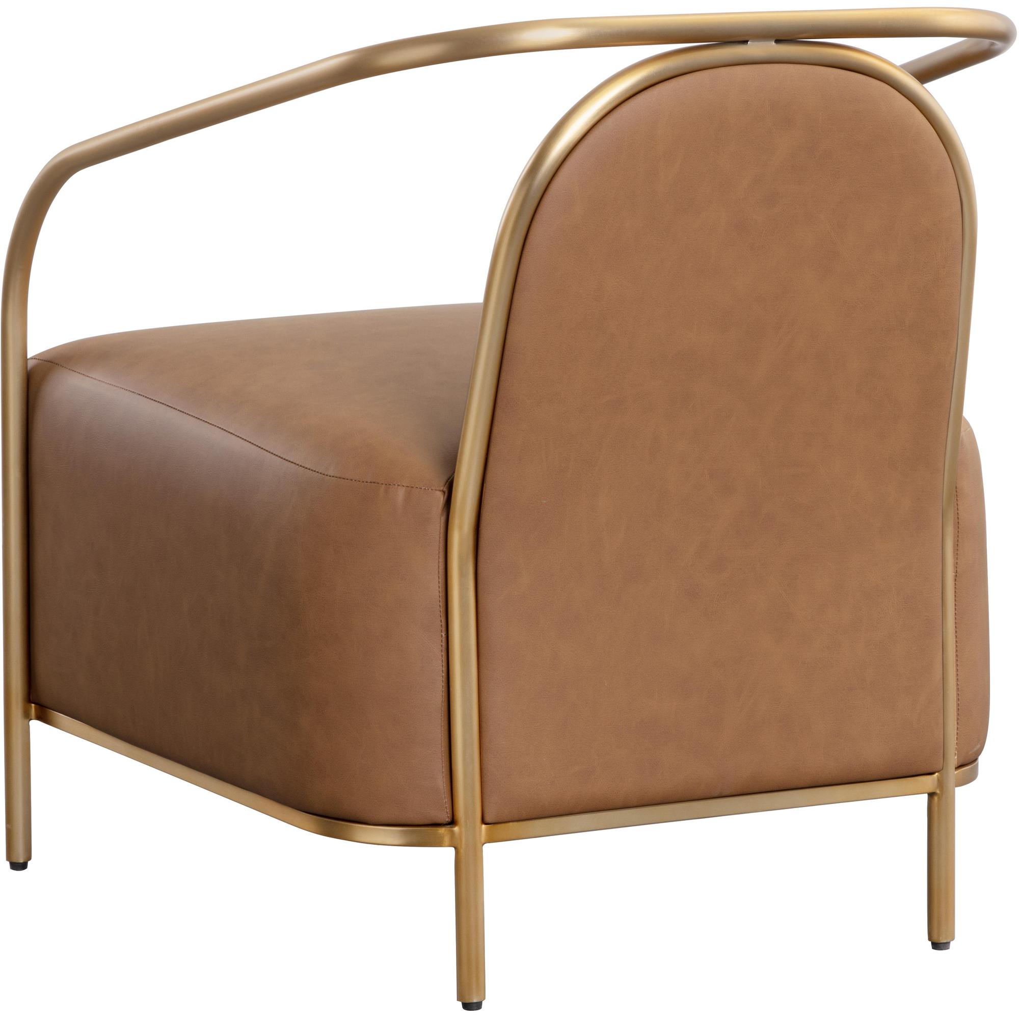The Cicero Lounge Chair is a lesson in understated elegance. Sleek gold stainless steel paired with the warm brown tones of milliken cognac faux leather creates a captivating look to elevate any living space.
