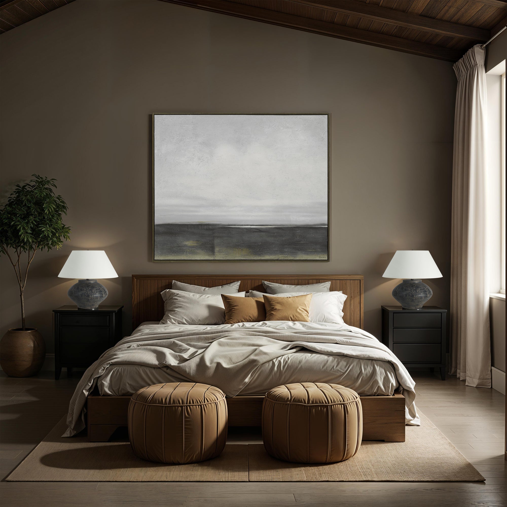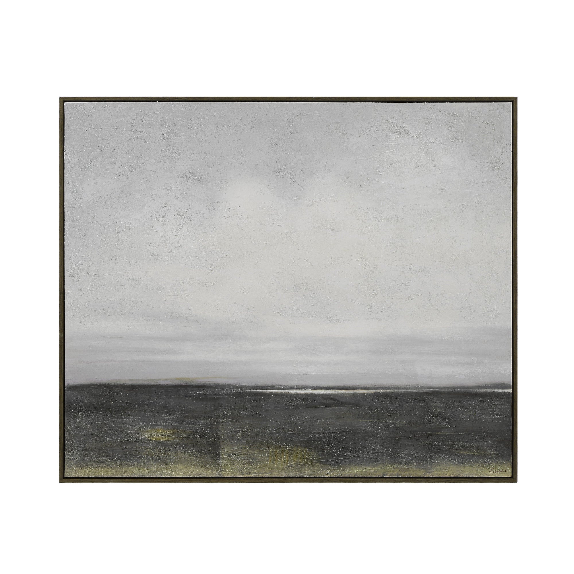Introduce a calm, artful mood to any room with the Cielo landscape canvas. Soft, hand-painted layers flow across the piece, enriched by delicate texture and touches of gold leaf that lend subtle dimension and shine. Set within a sleek black oak frame, this artwork blends modern elegance with organic warmth, making it a standout element in transitional interiors.