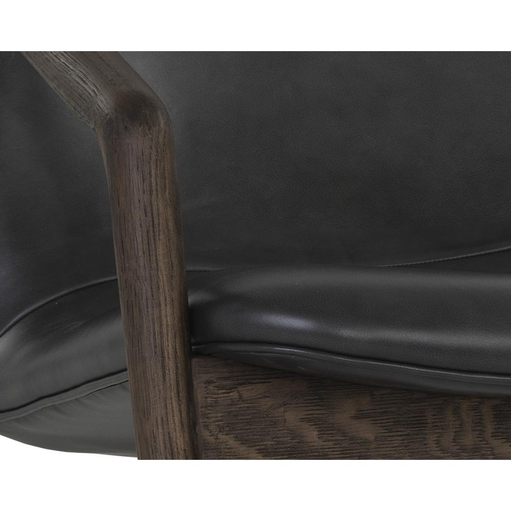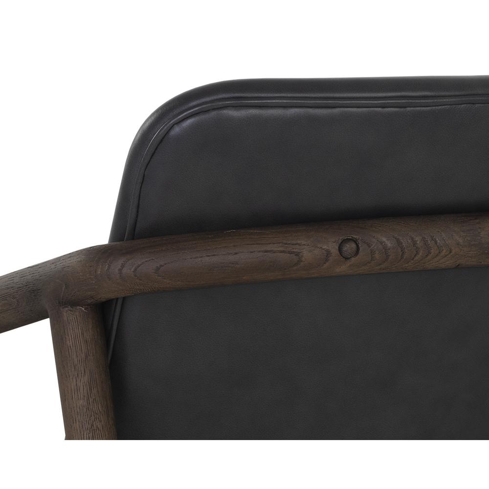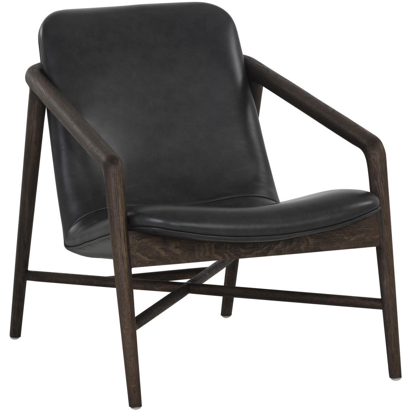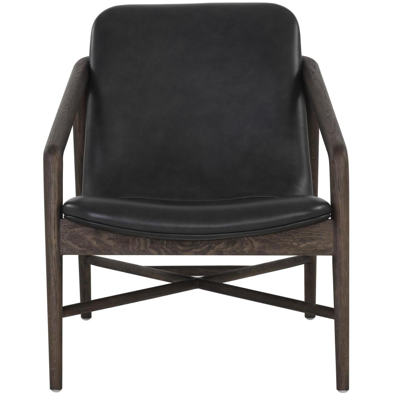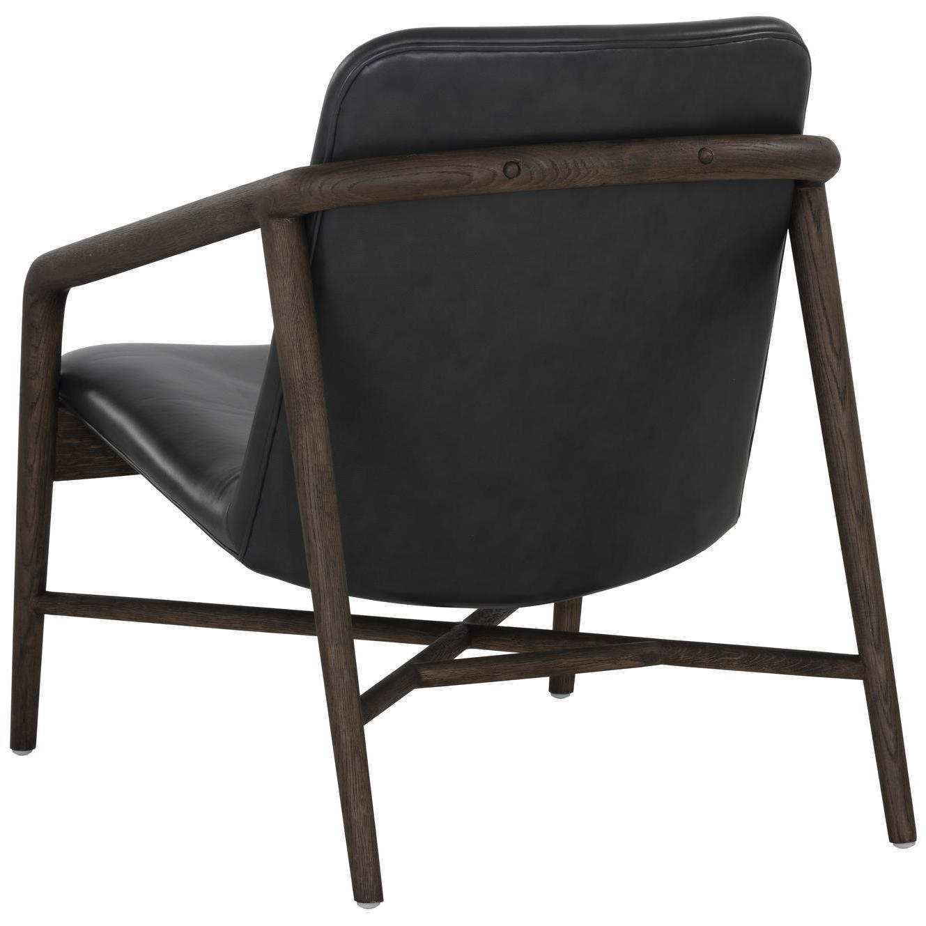Create a comfortable lounge space with this mid-century influenced armchair. The beautifully sculpted exposed frame is crafted with distressed brown solid oak wood. Stocked in brentwood charcoal leather.
