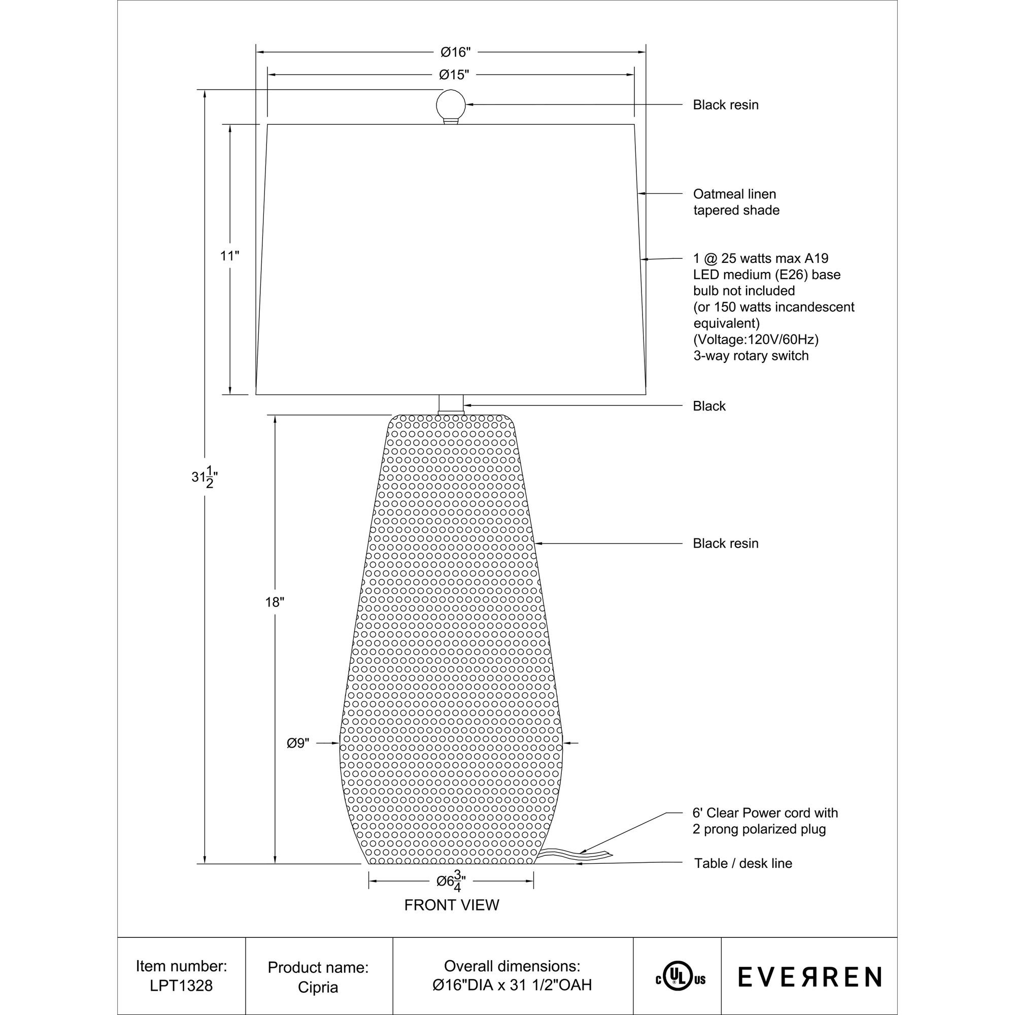 The Cipria table lamp would be a stunning addition to any stylish home. Picture a pair flanking a bed or sitting upon a buffet to bring light and style to a bedroom or dining room. Or try one on a console in an entryway or on an end table in a den. Crafted with a hammered texture, its black-painted body joins forces with an oatmeal linen tapered drum shade to deliver a fashionable touch anywhere you place it. Use its 3-way switch to customize the lighting level for perfect ambiance.