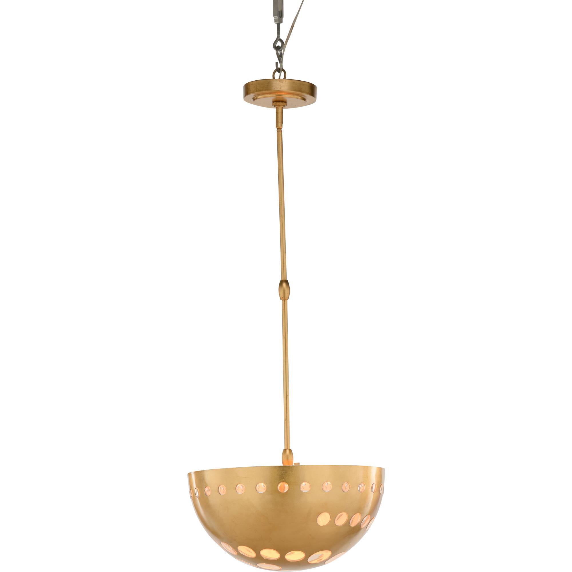 Bold and dynamic. This hand gold-leafed chandelier is beautiful as a single or stunning in pairs or in a row over a large island. Available in a larger version. Comes with 1-9″ rod and 2-13 1/2″ rods. Designed by Bradshaw Orrell.